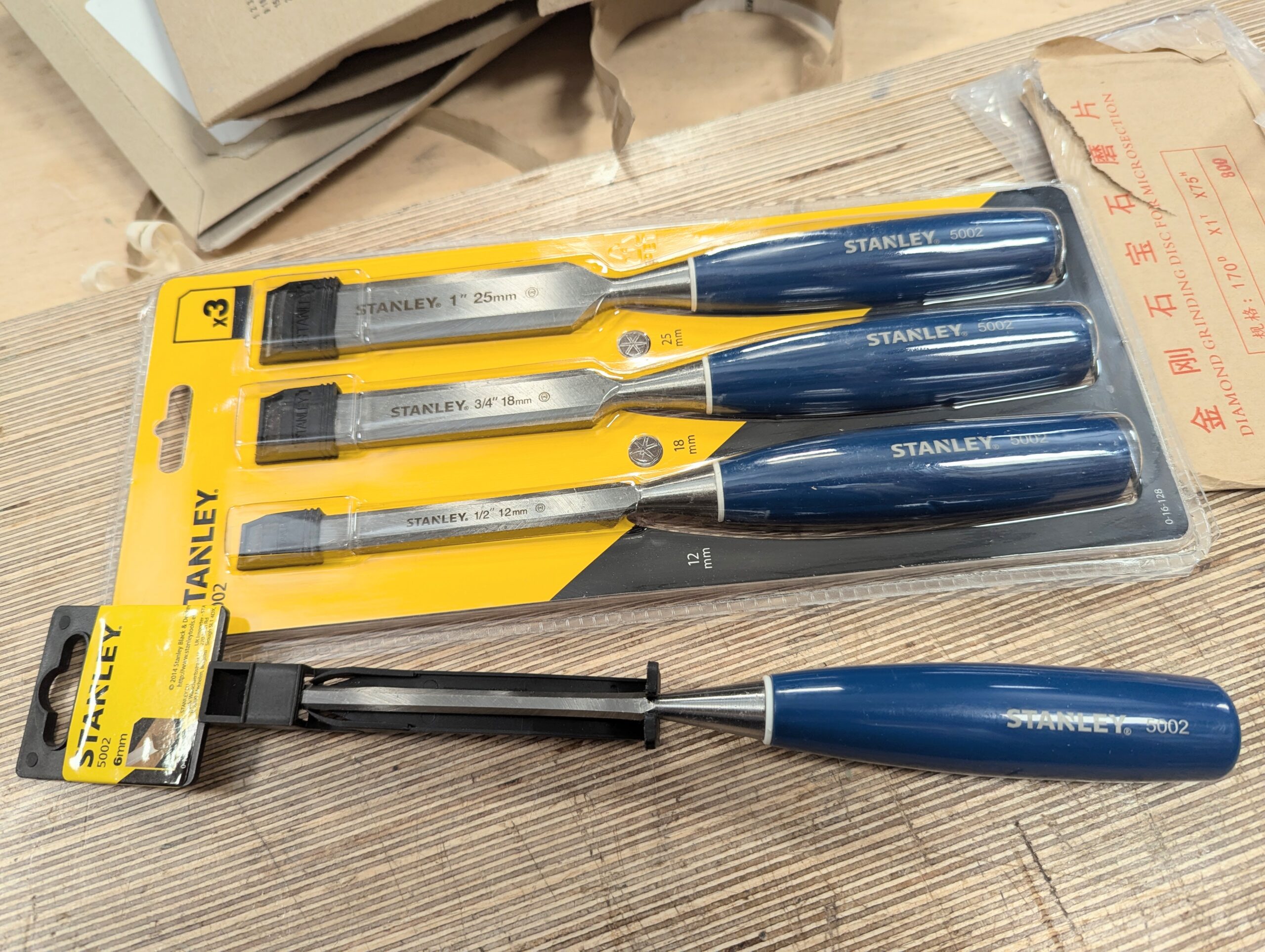 As a starter set, four bevel-edged chisels will do 95% of all of your woodwork. These Stanley 5002s are good value for money at roughly £5 apiece in the set of three, plus £7 for the 1/4" one and £12 for the 3/8" one. For mortising, they are just excellent. The split-proof handles are comfortable to hold, and they absorb the shock of hammering just fine. Some may well favour a more ergonomic shape, but the hands are designed to take just about any shape that is not angular. These chisels are an excellent length with plenty of steel and a good handful of handle without being unbalanced. I could happily use these all day long.