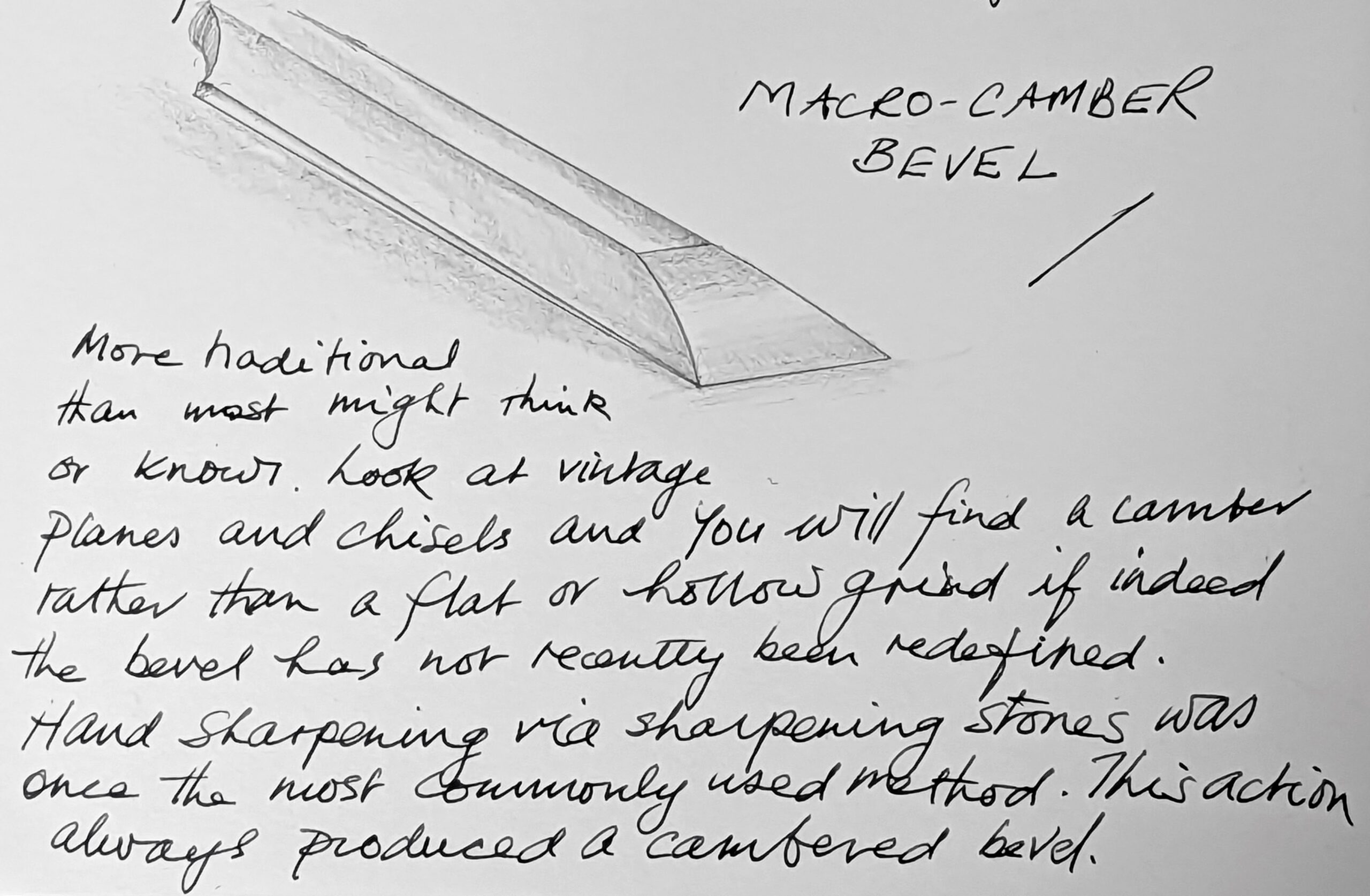 Considering the micro or secondary bevel; you will come across this as you grow. When the cheaper Black and Decker, electric grinding wheels came in back in the 1940s, woodworkers grinding their chisels and irons end up with a tight radius on their edges and therefore had no option but to add the second bevel because grinding on a wheel leaves a cutting edge that is not viable for cutting with. As a result, a stronger bevel was needed. Unfortunately, the process of not using your own energy usually leads to you inadvertently grinding off much more steel than is actually needed. Additionally, the risk of burning the steel and thereby detempering or misgrinding the cutting edge also reduces the longevity of what should be a lifetime tool.