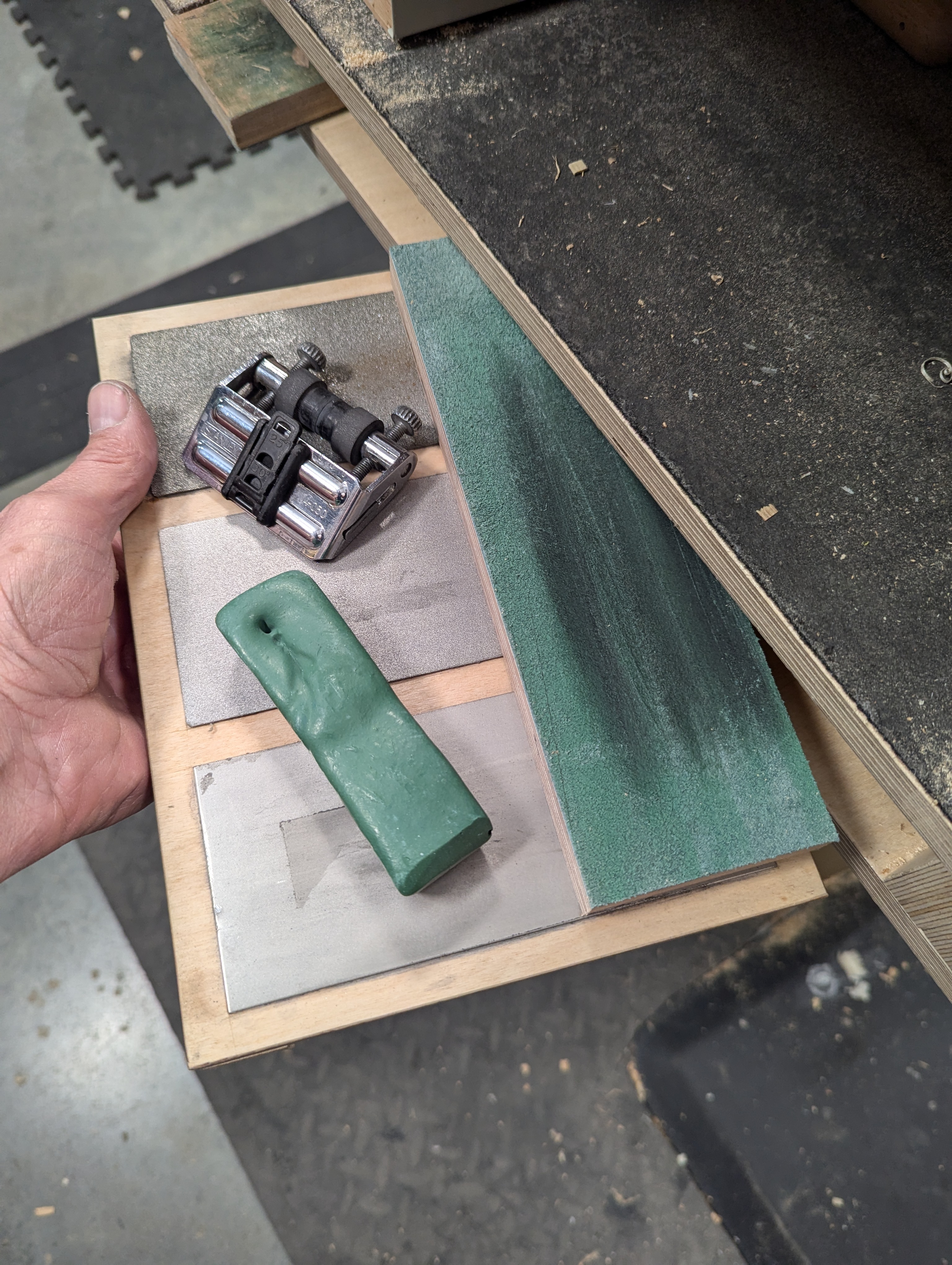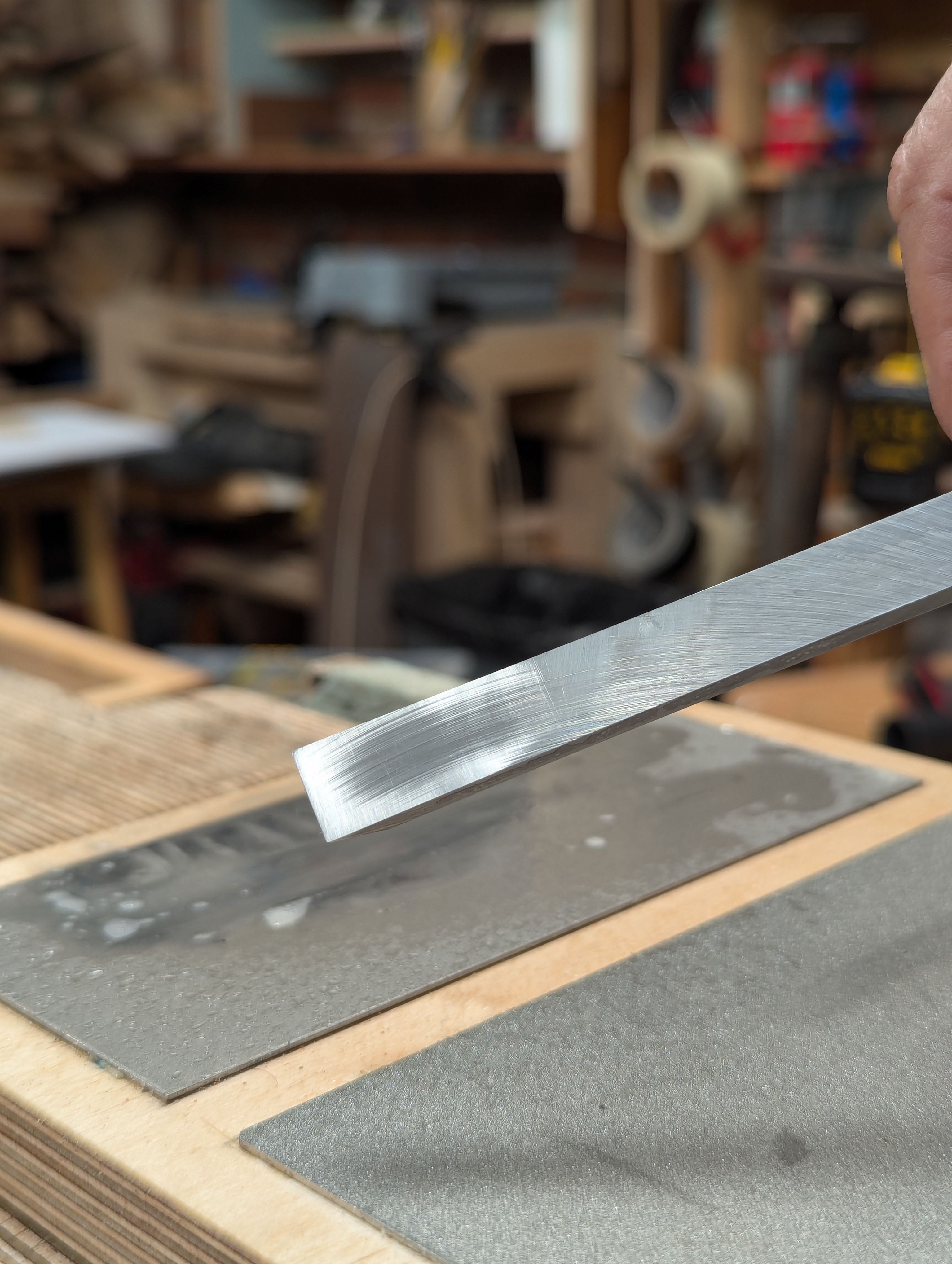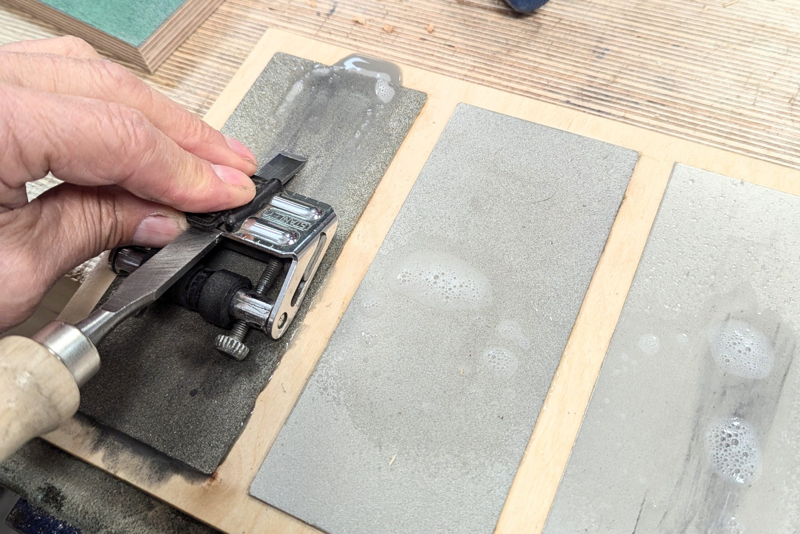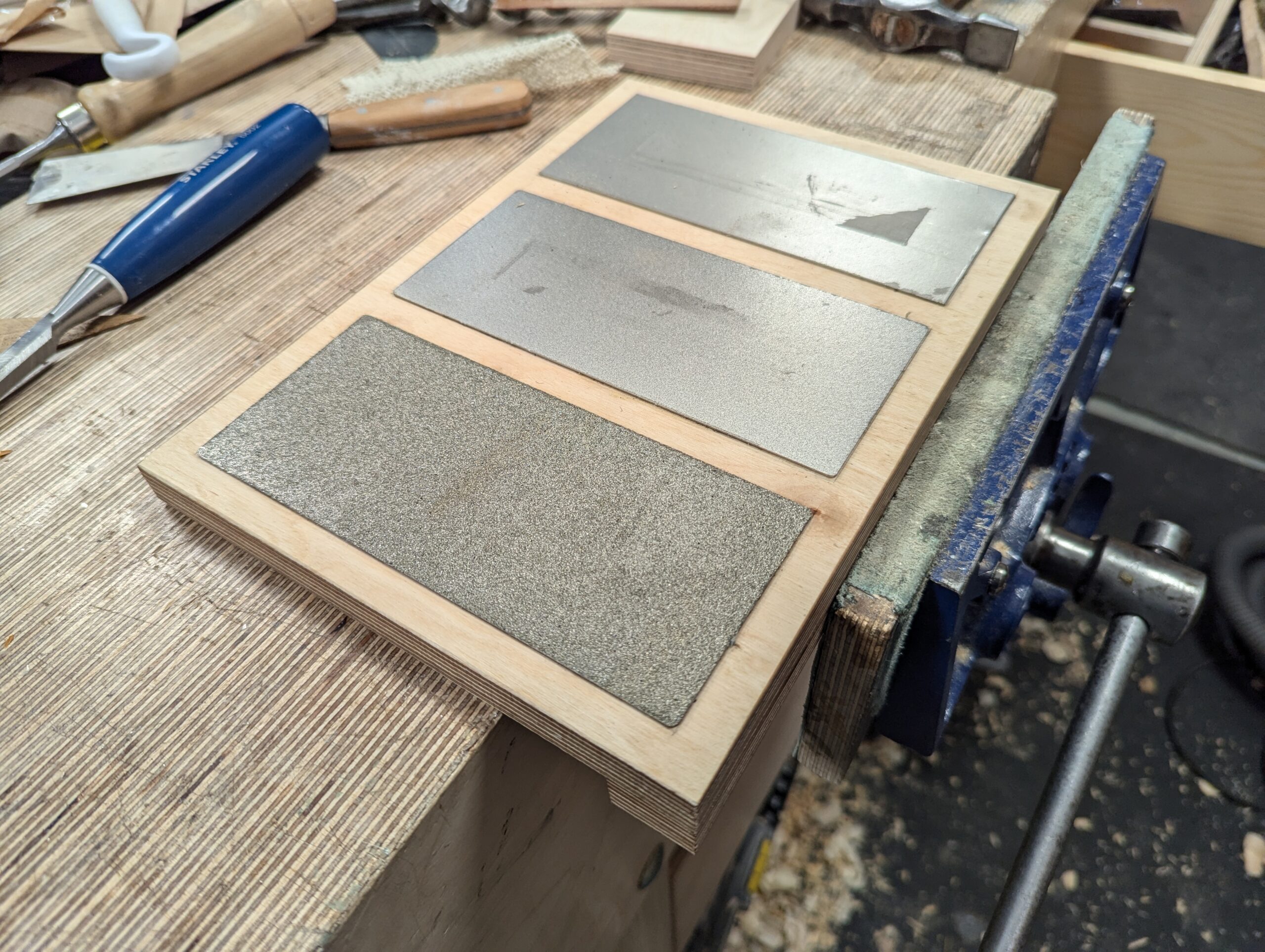 Seamless sharpening means the three-plate board is stowed on its own shelf to the left side of my workbench. Literally 18" from my bench vise and my left hand. The strop hides there alongside too. I have revised my sharpening board to accommodate the thinner plates from my original, which needed the plates to be housed into recesses in the board. These thin plates work much better if they are just glued down with contact (impact) cement. They will not turn loose.