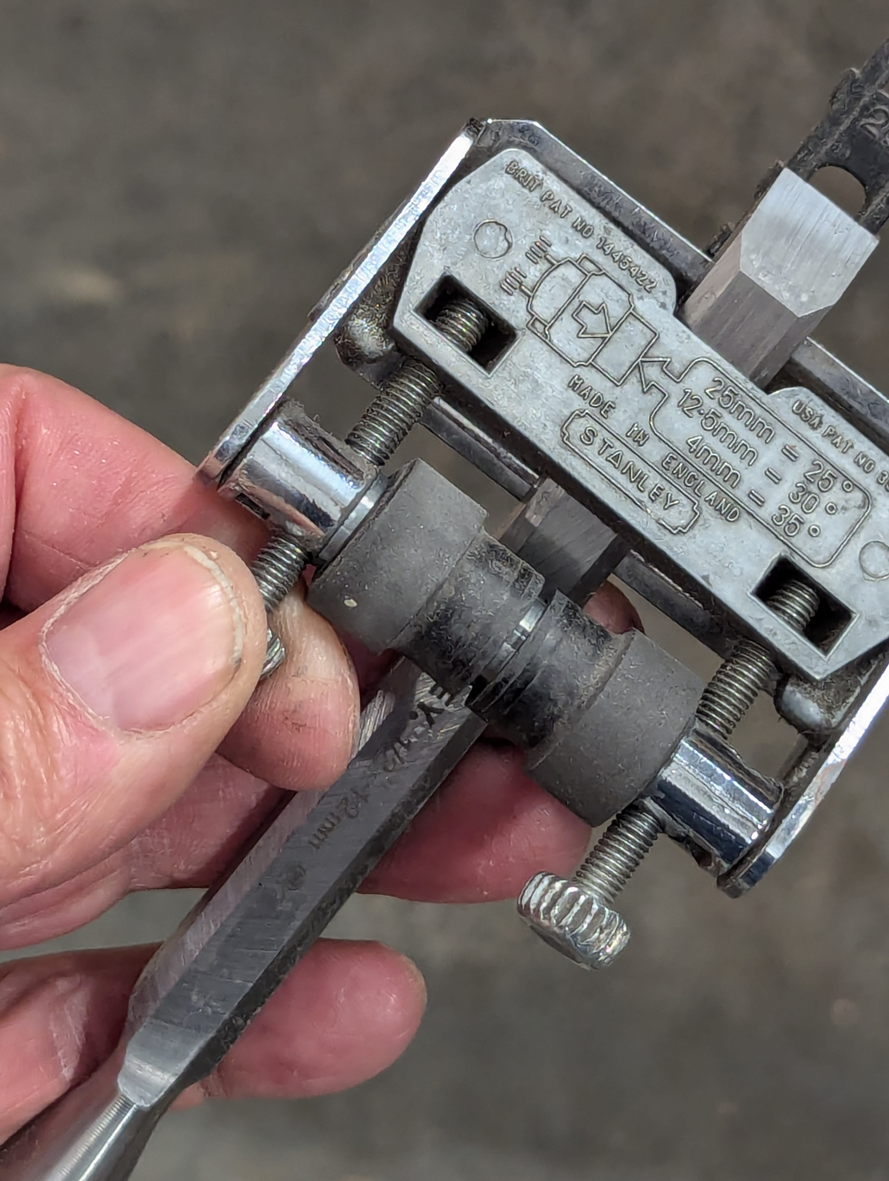 Now cinch the two setscrews tight, taking care to keep the chisel square to the guide. It's worth noting that there are convenient small indents in the chrome plate to guide you for squareness but using the square is really effective and accurate.