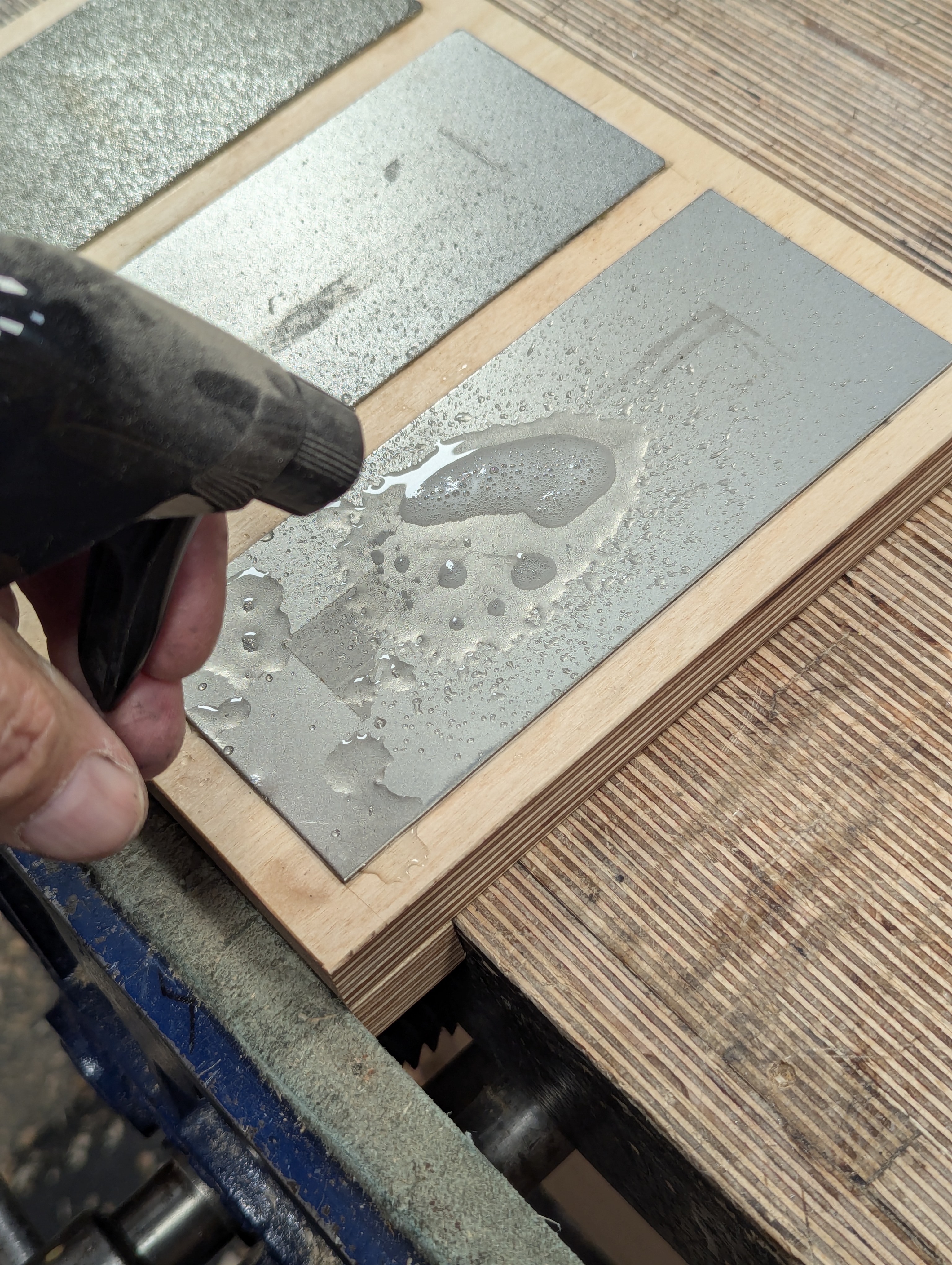 As you can see from the construction, the baseboard is made up of two, 3/4" birch plywood pieces screwed and glued together. The key element for security is the ability to lock the base in the vise so that there is no movement as you hone. We apply maximum pressure to the tool and the plates when we sharpen and hone.