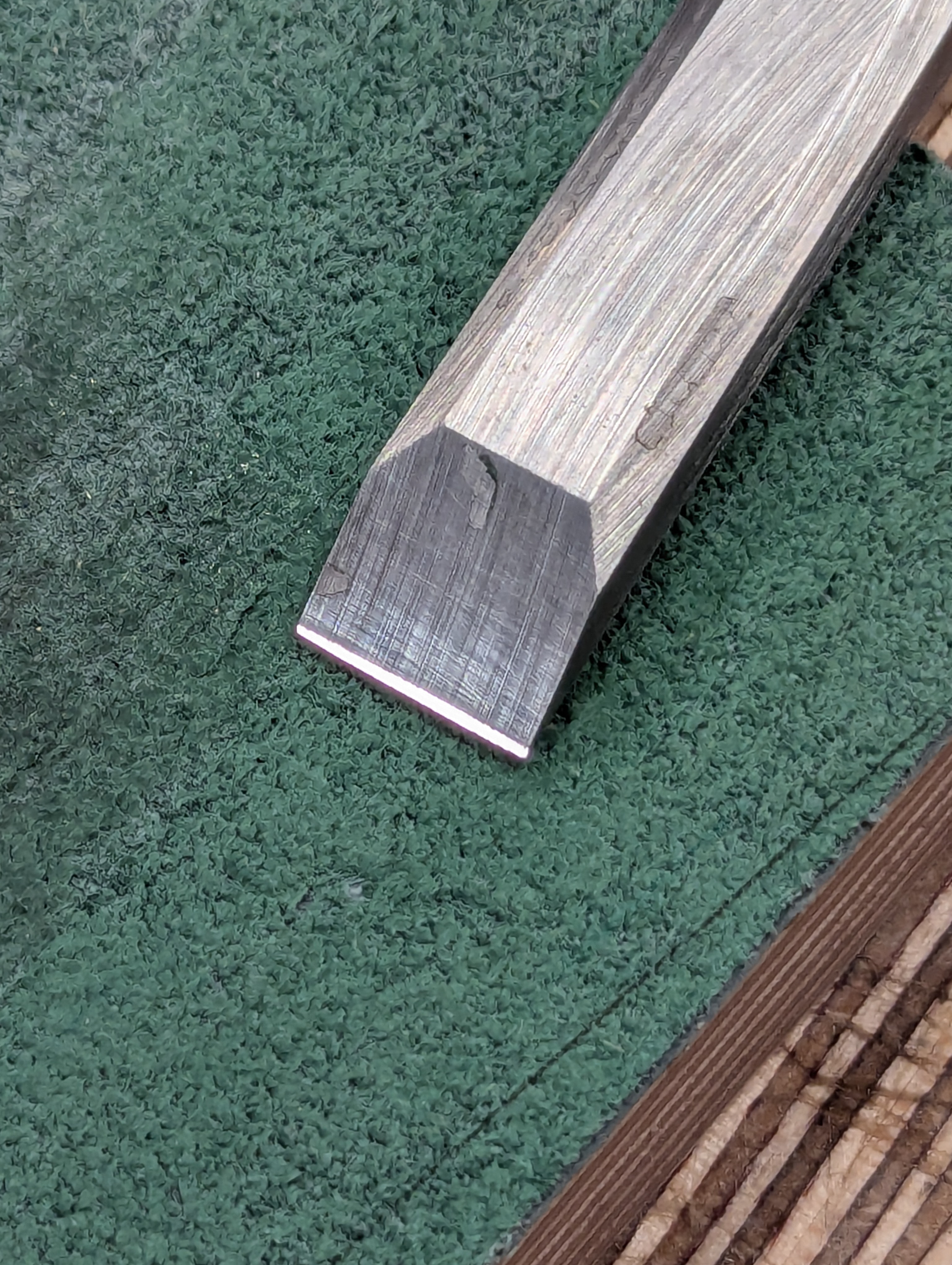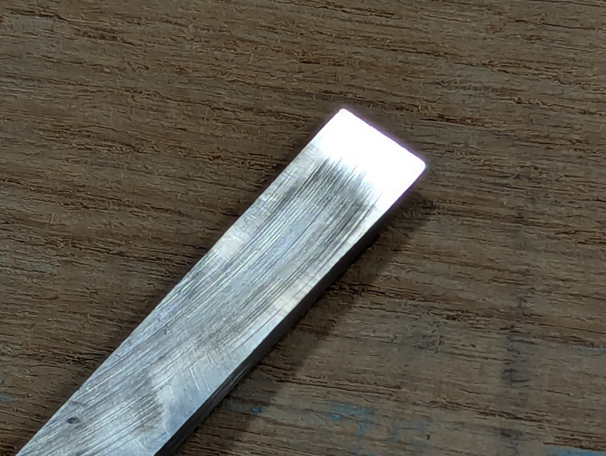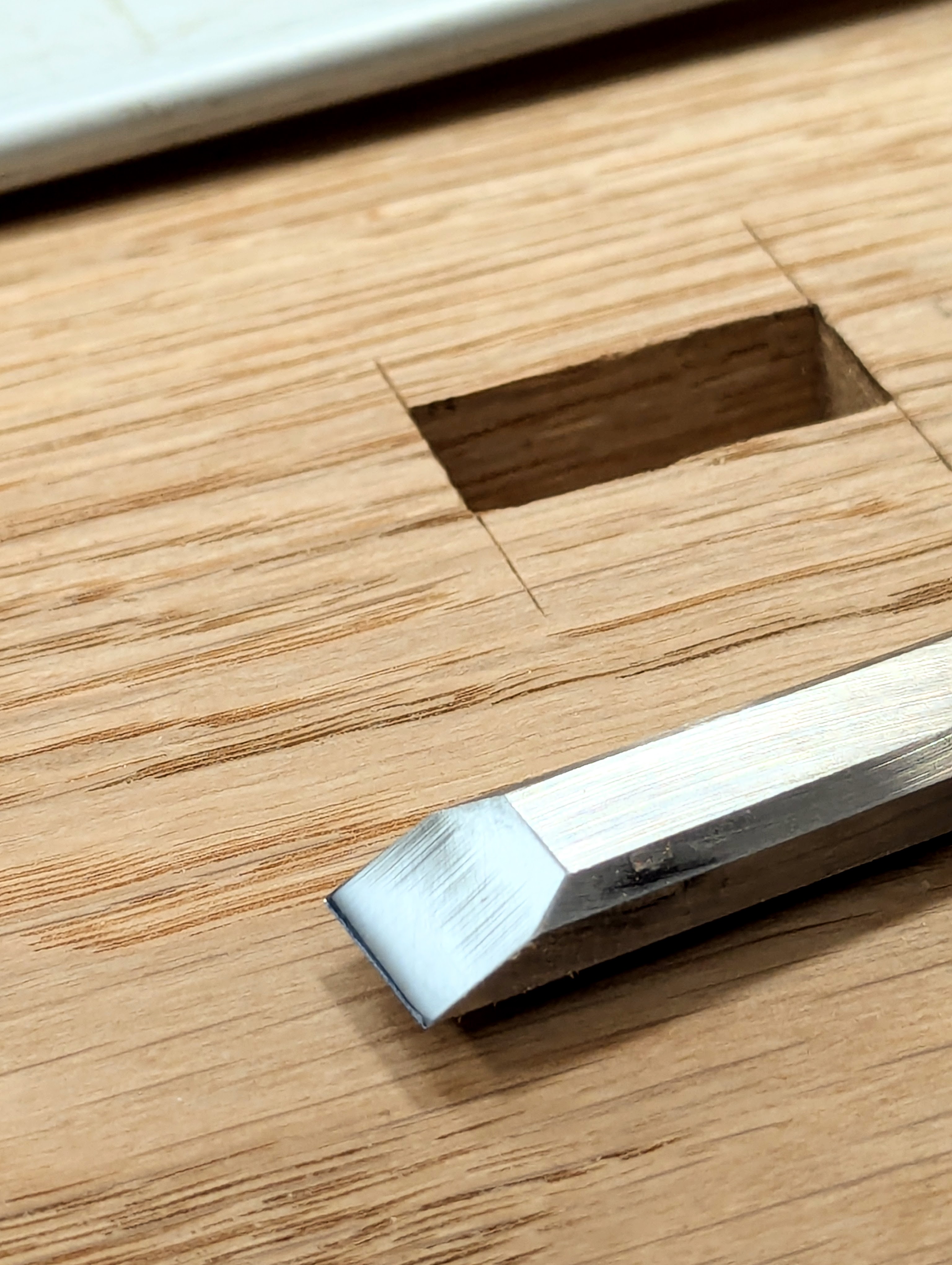 This cutting edge lasts well in use and takes less than a minute to restore and look like this. Now it will chop half-inch mortise holes for an hour before I need to restore it.