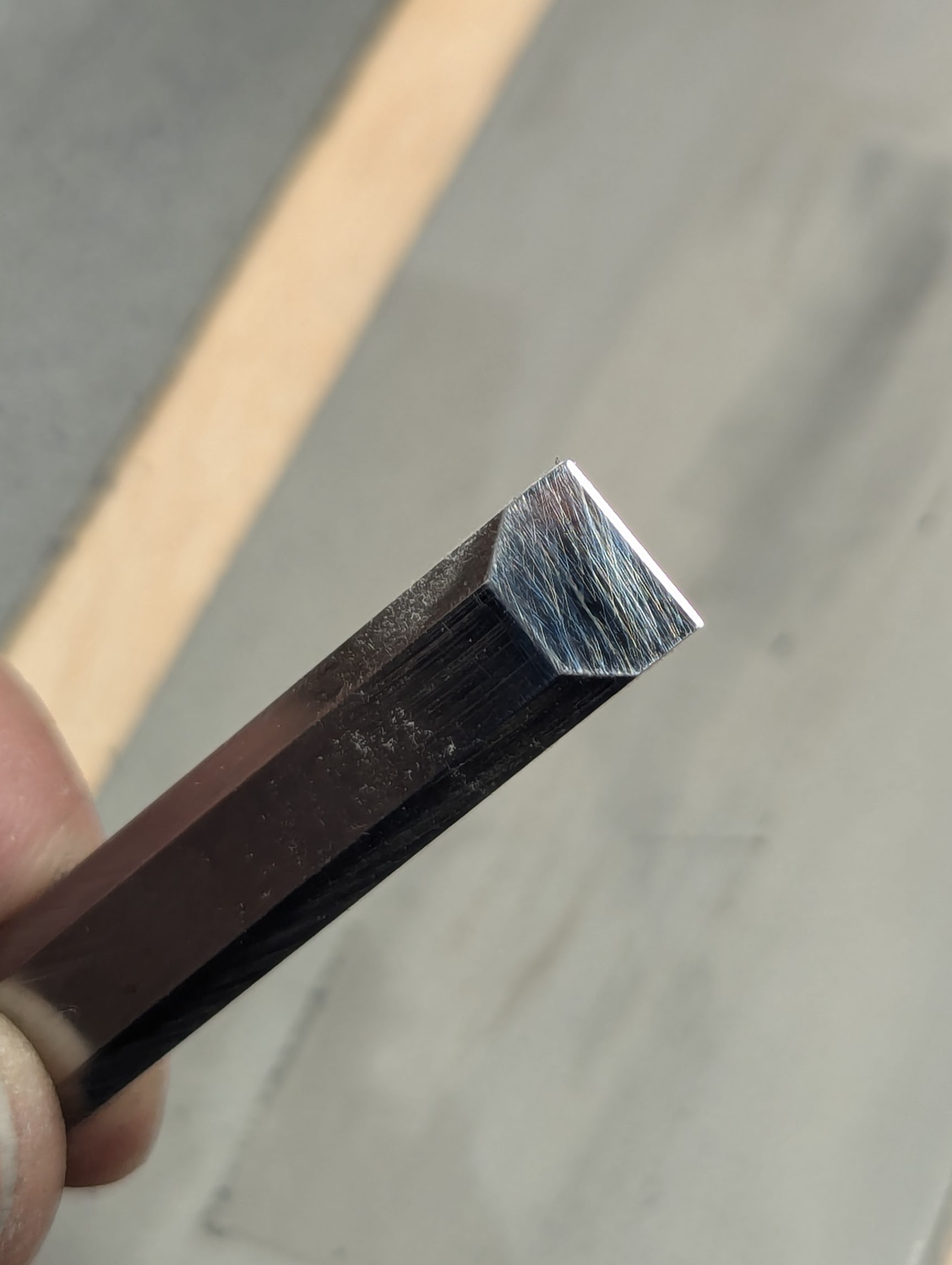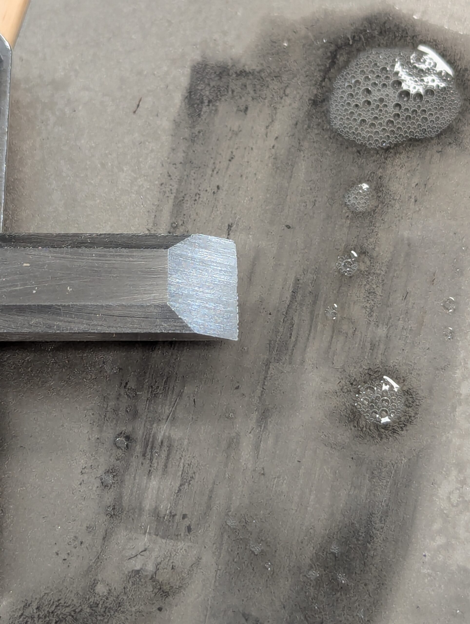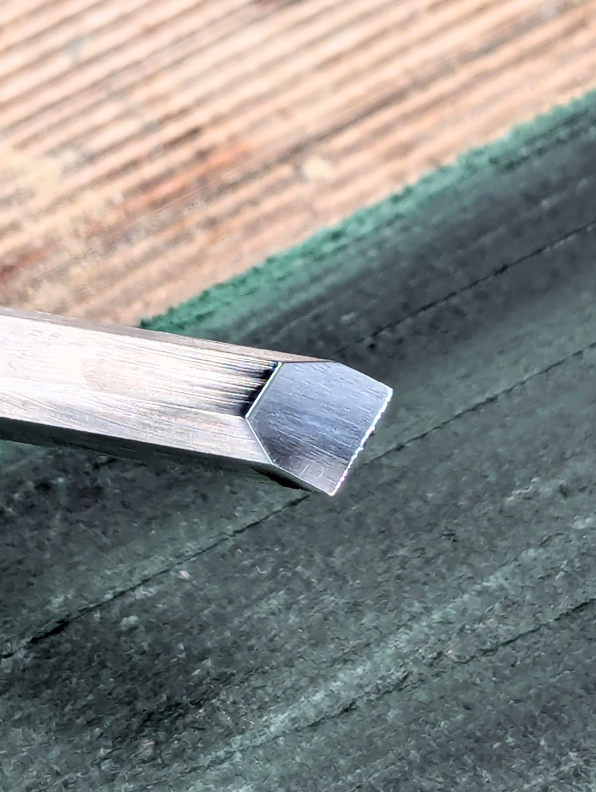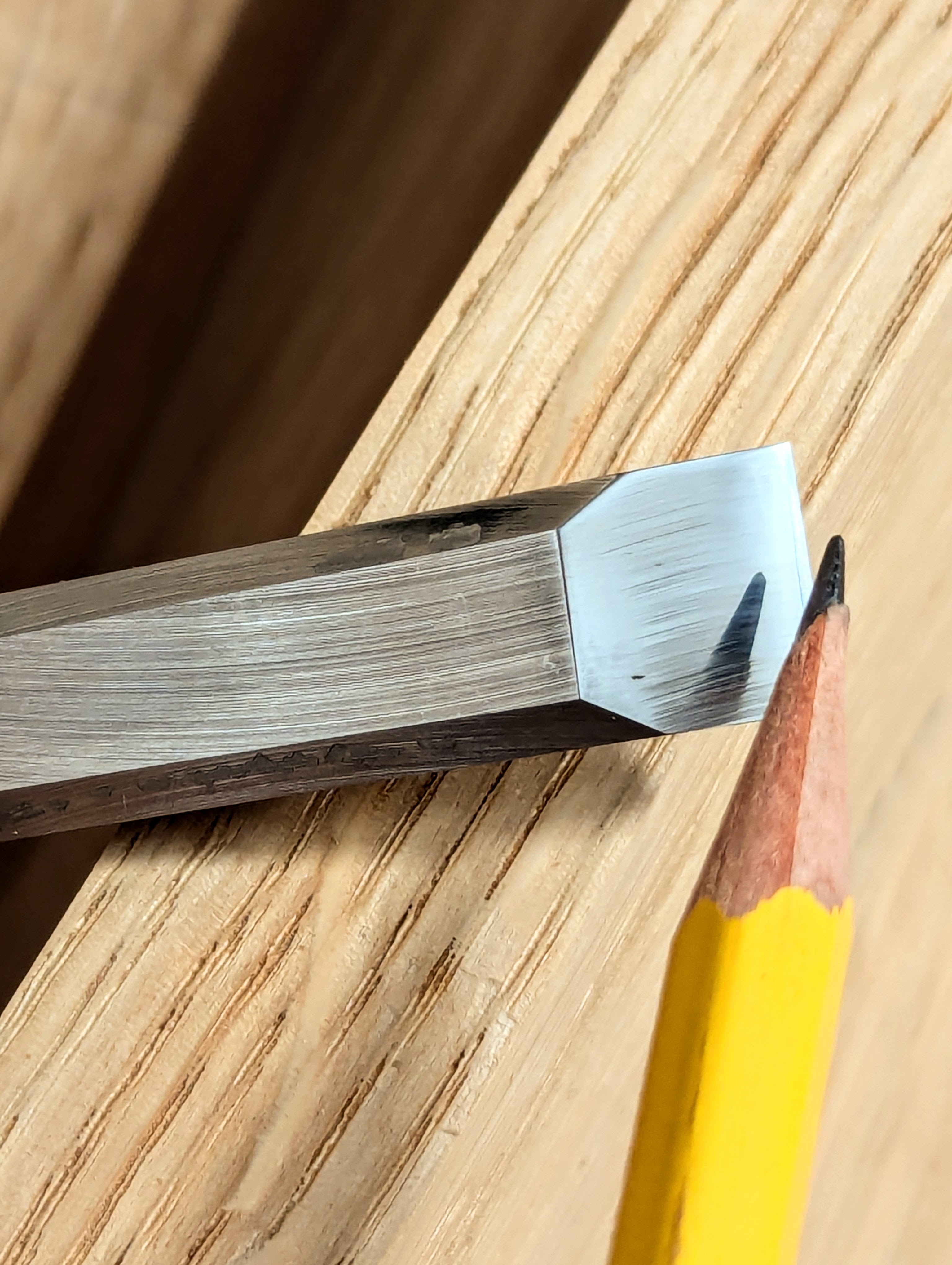 This cutting edge lasts well in use and takes less than a minute to restore and look like this. Now it will chop half-inch mortise holes for an hour before I need to restore it.