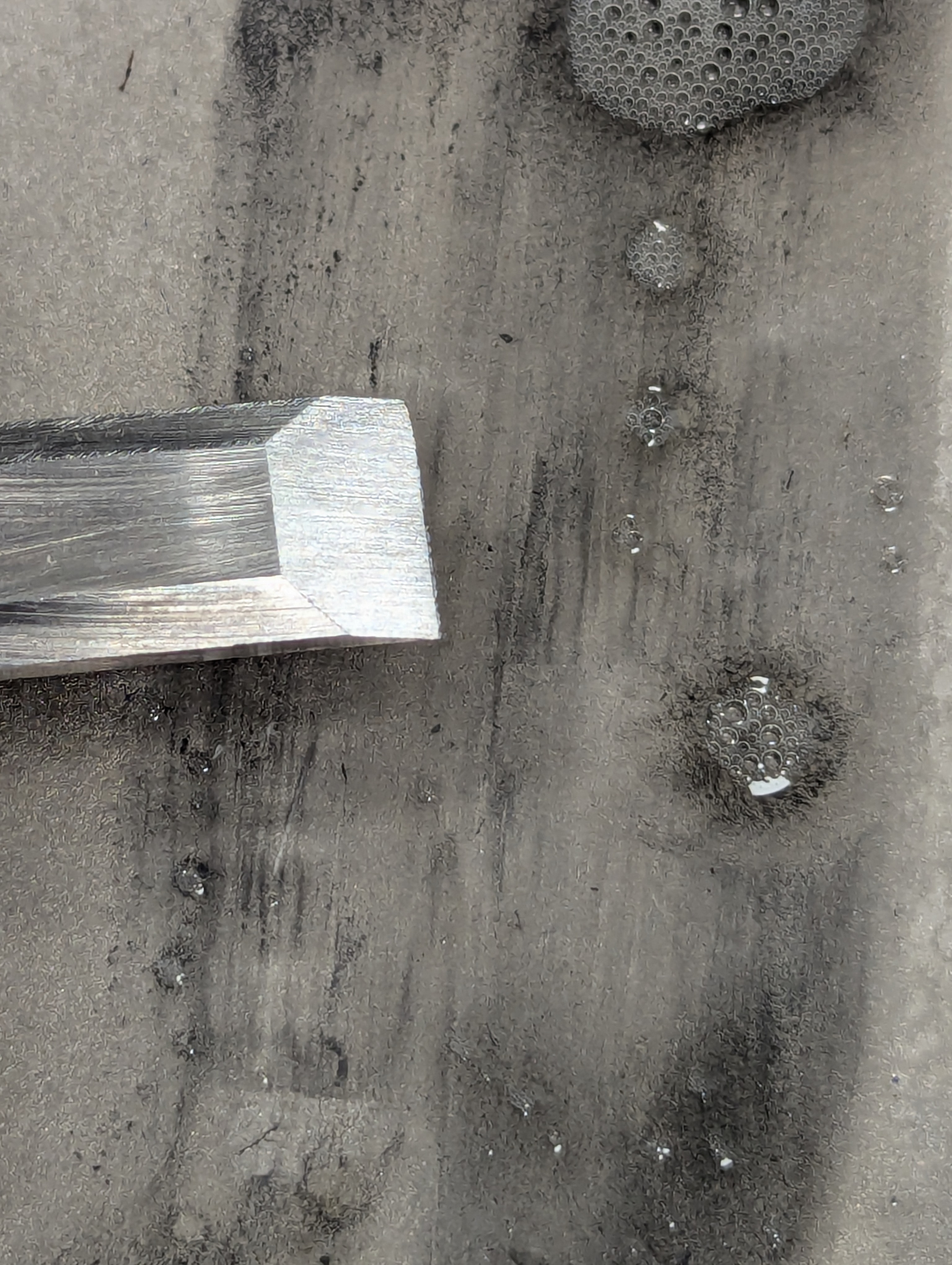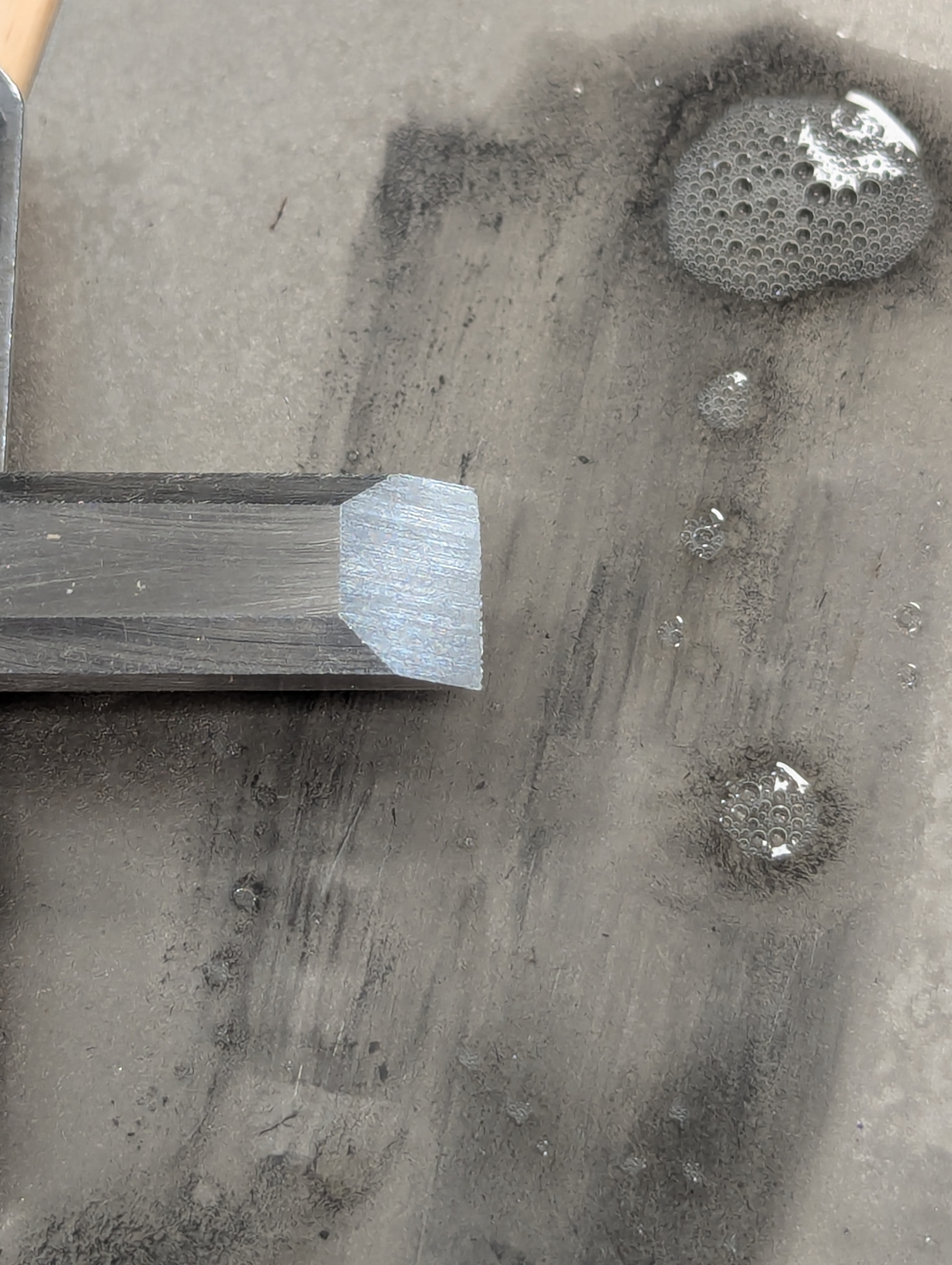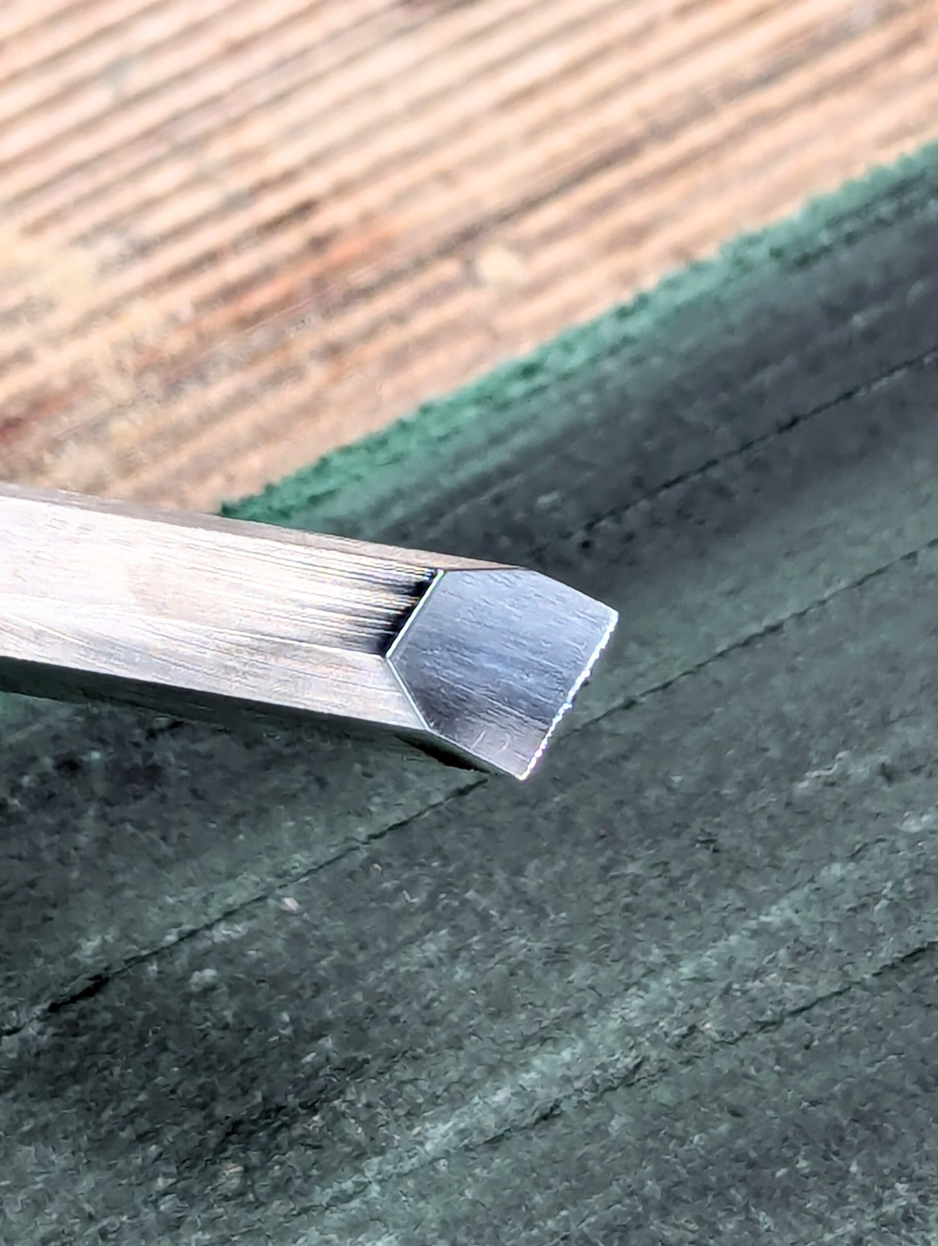 The last stage of diamond abrading is to flip the chisel on the last plate and initiate the face by flattening and polishing it on the 1200 plate. This should take only a few rubs. Having a dead-flat face is a preference rather than an essential for 98% of chisel work.
