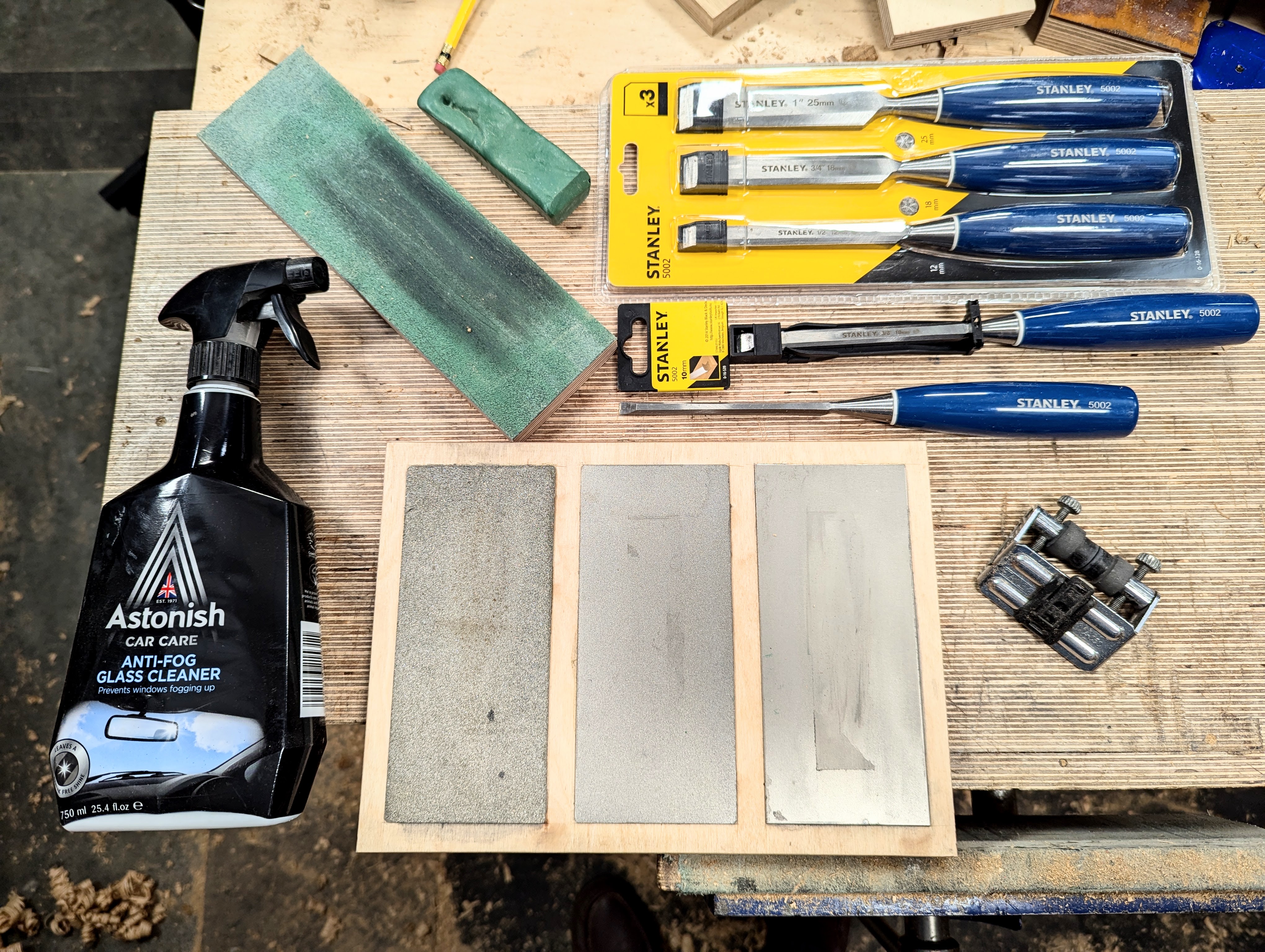 This set up really works for all straightedged cutting edges as in chisels, plane irons, spokeshaves, and a couple of others. I put it together around 30 years ago, and it replaced my double-sided carborundum stones altogether. I originally used more heavy-duty steel plates, but the cost is really quite prohibitive. Five years ago, I started using some thin-plated models on decent quality plywood, and I am still using them. My five-year span of sharpening would likely be around 30–40 years for most woodworkers following me here today. What's especially good is that the diamond plates, previously costing £300, now cost under £20-30, dollars or Euros. ``Everyone can have an efficient system.