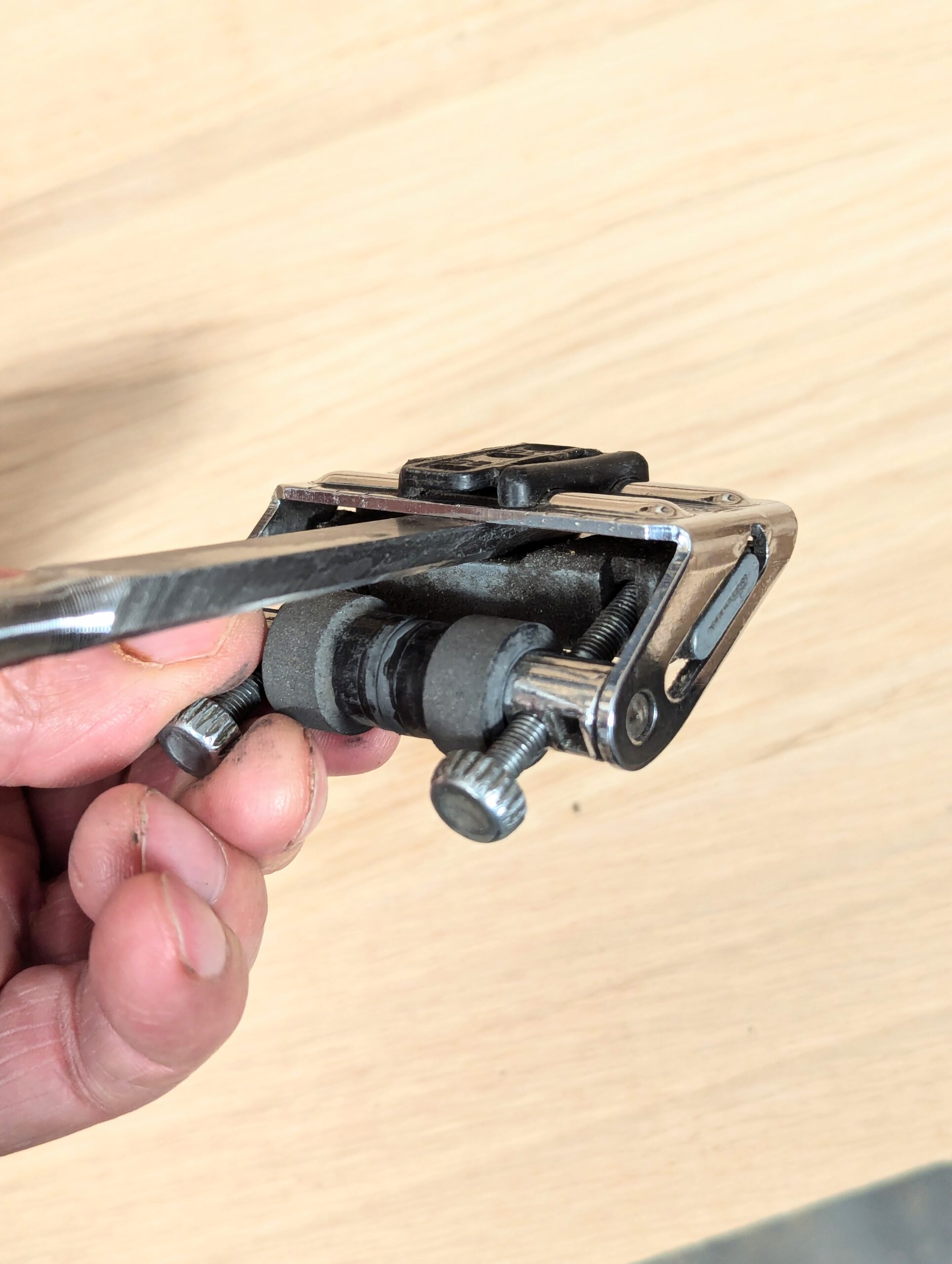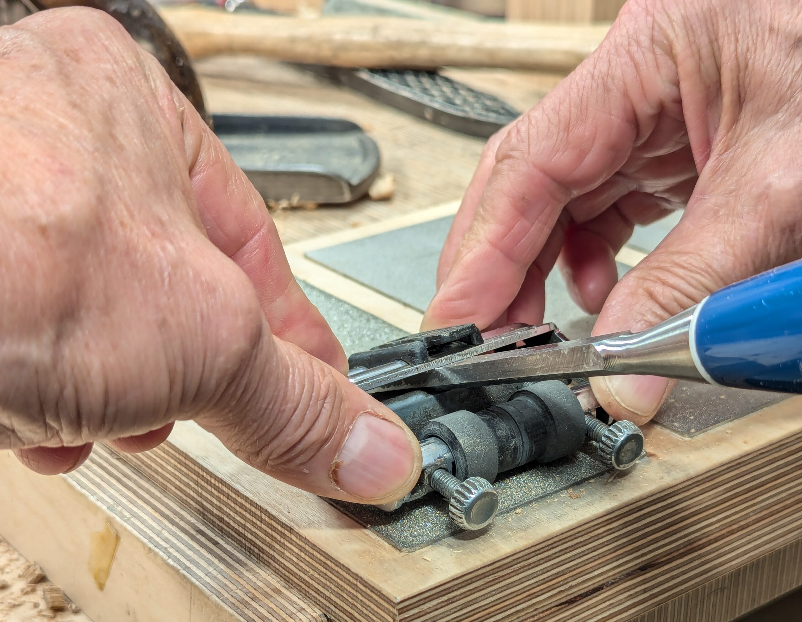 With the chisel secured, offer it to the coarse plate and work the assembly backwards and forwards. A new chisel will not need the coarse start, as the bevel is already established.