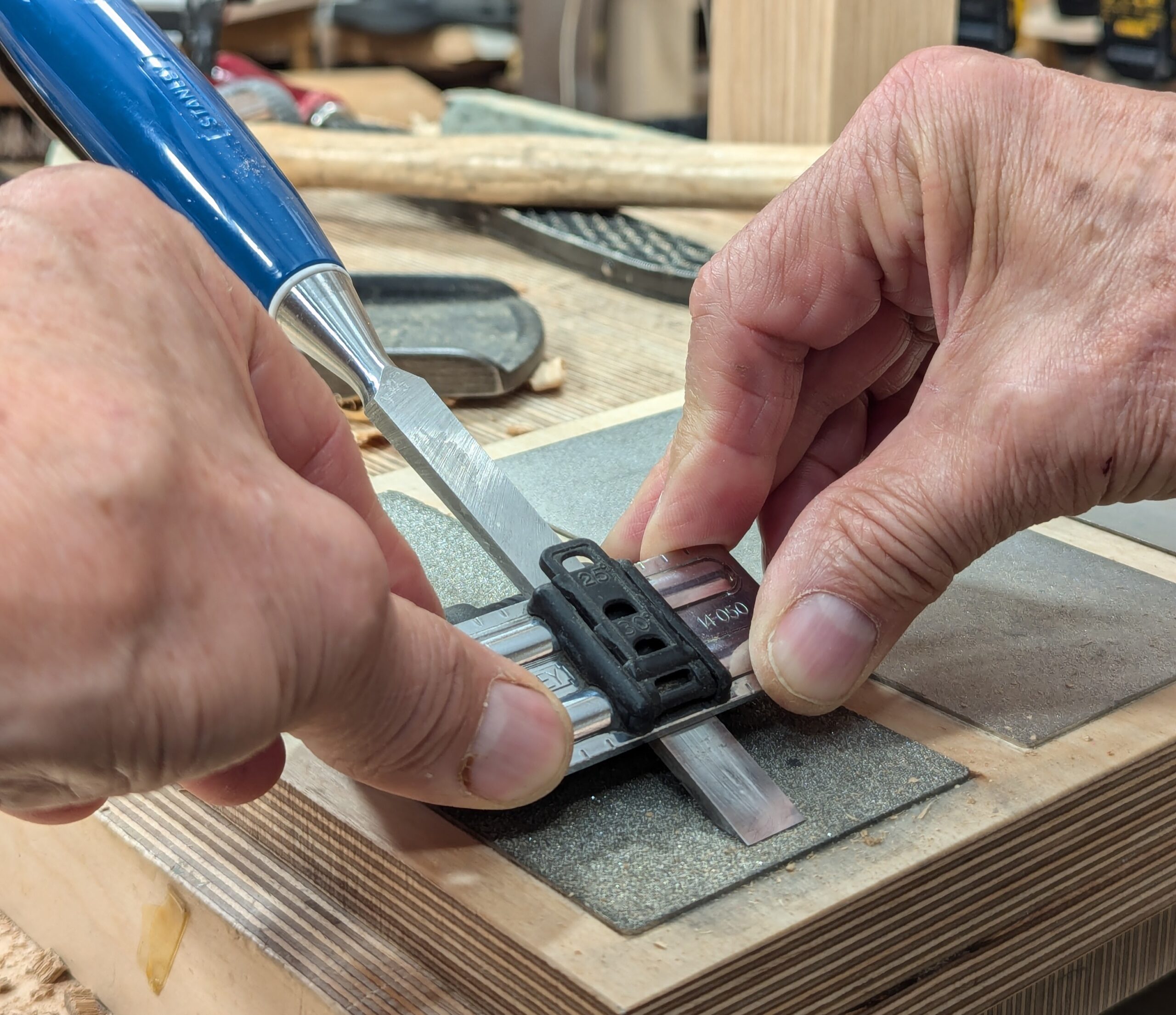The important thing about sharpening is to make it as smooth and convenient an operation as possible. In my day to day, I am likely to sharpen several tools several times in a given day. In my work, I have always worked five to six days a week all day at the bench using hand tools. Chisels and planes need sharpening several times a day, especially if you are like me, and you don't use machines for the bulk of your work. 99%nof my work is hand tool woodworking. This week I spent a full day planing oak true and square S4S. I use four planes to do that, and they all were sharpened around four times each. You will see that this operation needs to be as seamless as possible. To sharpen four plane irons actually takes under four me minutes, but with a distraction here and there it's likely to be six.