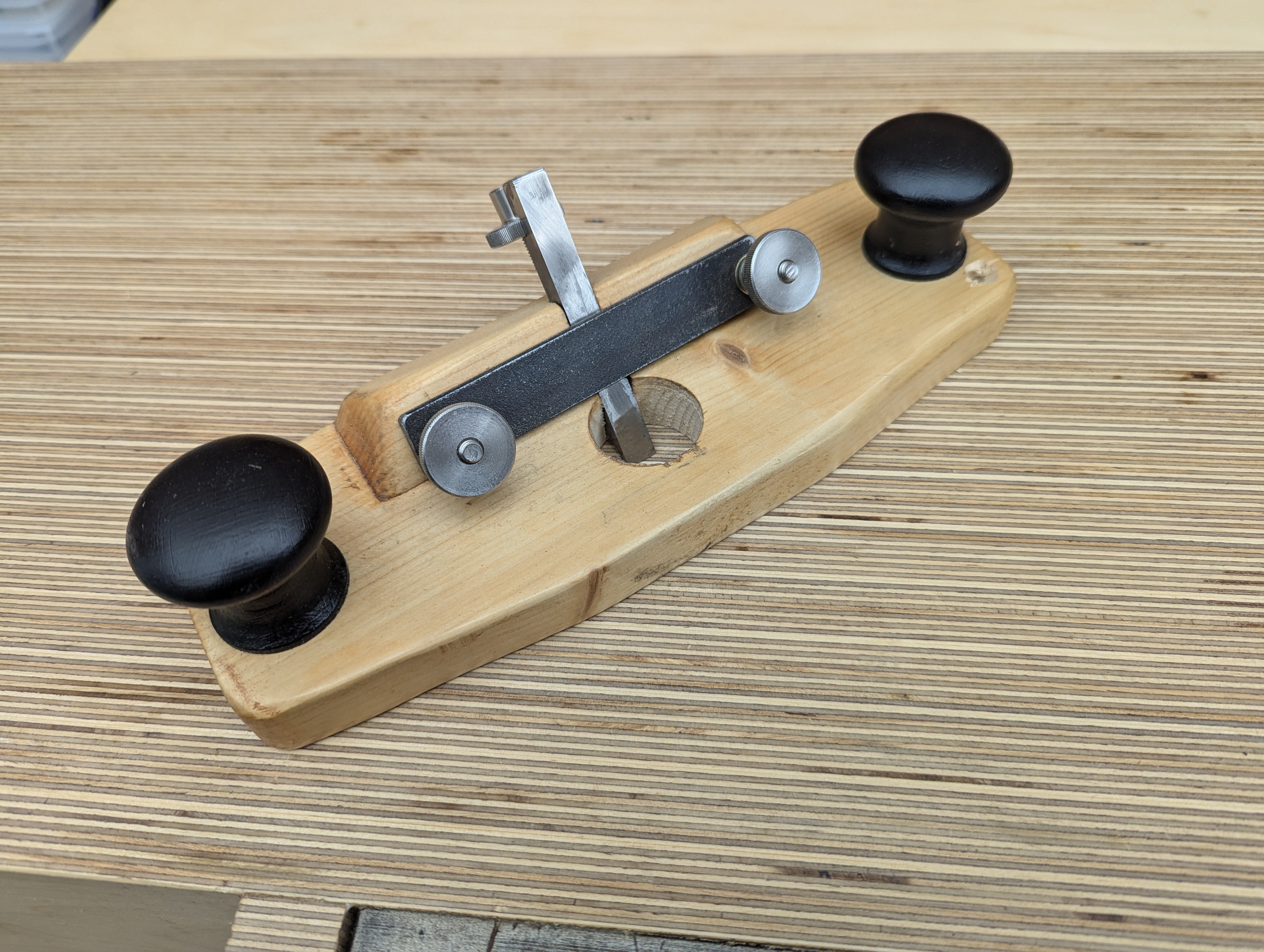 I have never been dissatisfied with life, nor have I yearned for any particular significant life changes, either. The quest for something better or new can be motivated by dissatisfaction with the status quo, but it can equally be that you simply want to invest in something of true substance with future outreach. I have continually striven to improve life, but never because life is somehow letting me down. In my earlier days promoting hand tools as a way forward for the majority seeking true skill, I introduced the all-metal router planes to show that they could be used for so much more than just routing out a dado bottom. No one used a router plane for refining tenon surfaces or as a marking gauge, for instance. At that time, you could indeed pick them up on eBay for under £20 and there were dozens of them there. Over a decade period, through my videos and writings, they gradually rose year-on-year to average £150. I had to become a solution. This was my prototype solution router plane you could make for under ten pounds.