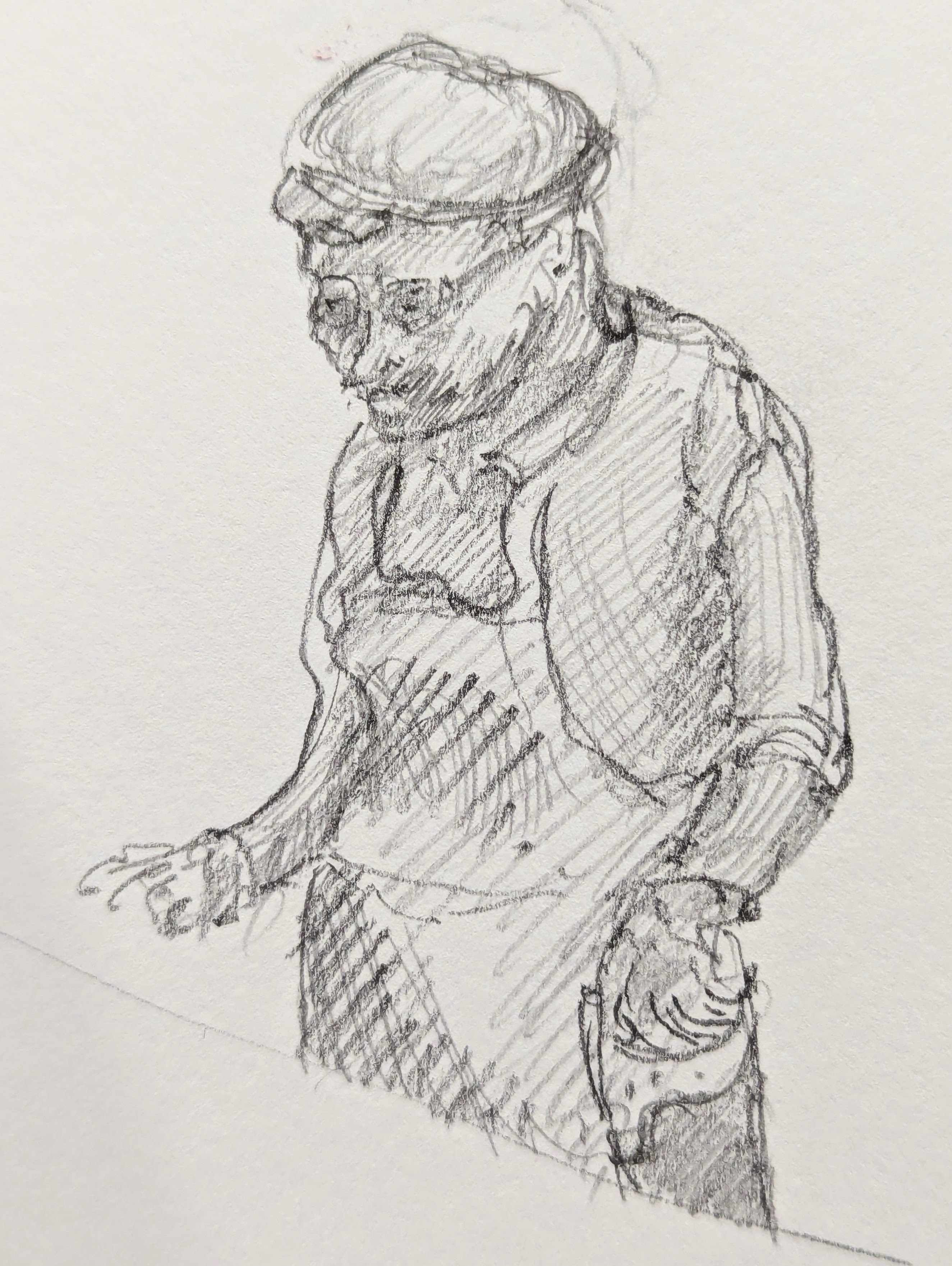 There was a gentleness about him––a gentle settledness, I'd say, really. His frailness belied the determined outlook of this now shrunken man who said little, but when he spoke, and said what he said, no one else spoke, for after he'd spoken, there was nothing more to be said. I looked at his denim overalls, not jeans, neatly patched on the knees from two decades or more of kneeling to the lower areas of his work. But when you saw the patches, looked at the neatness of the stitching, the aligning of the fabric's grain, you couldn't think, 'patch'. You could only think 'art'.