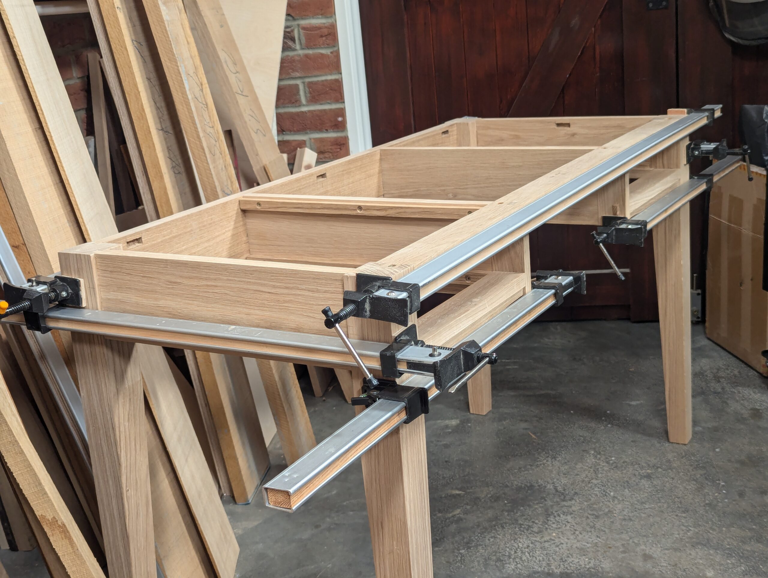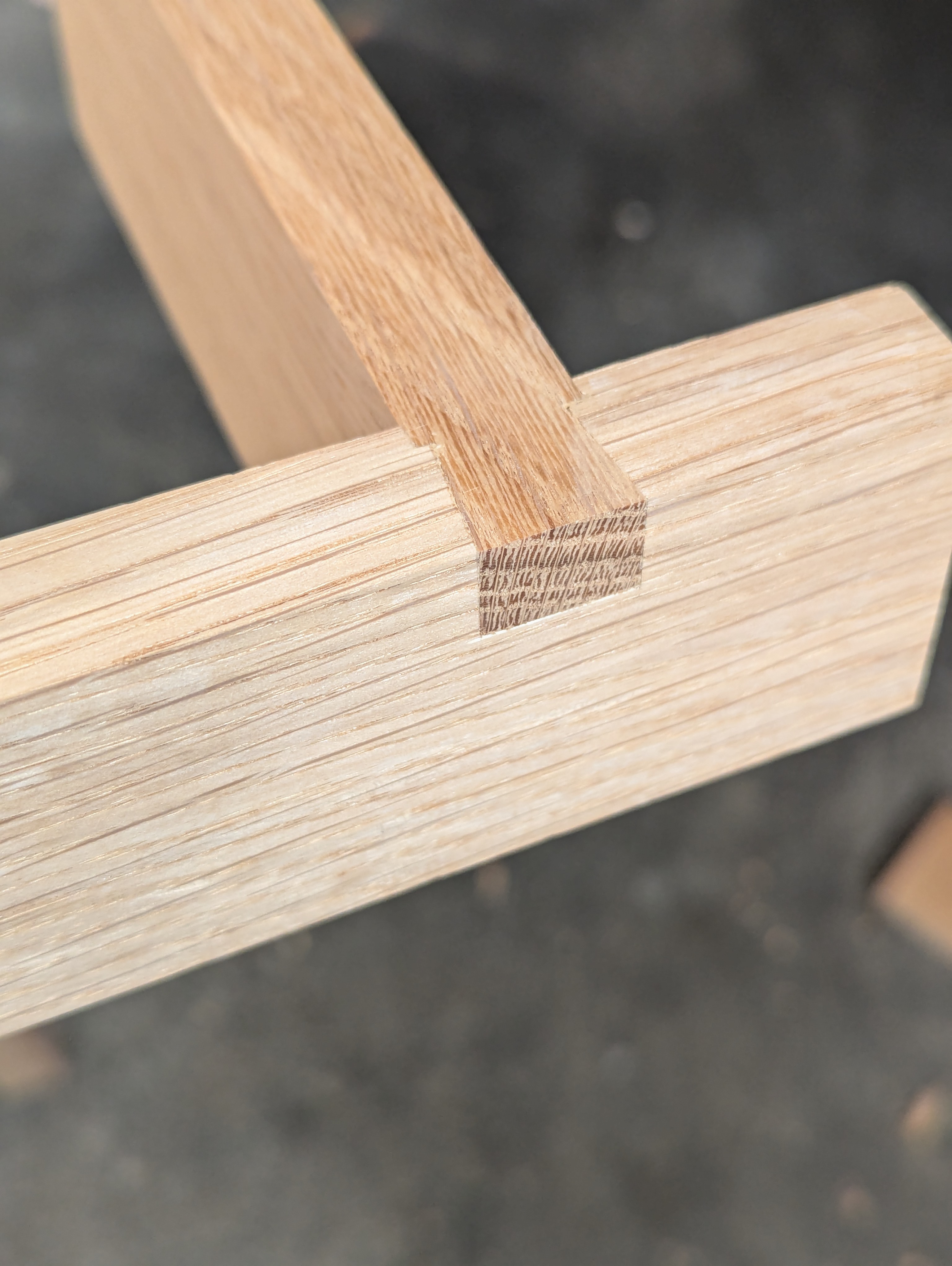 Another joint emerges from a maker who's conscious of loss in handwork to his craft. In the moment, he decides on a new-ish joint. It's an off-the-cuff decision made in seconds intended to last a lifetime, and takes a perhaps less adequate joint with little if any mechanical resistance to factor in the full pull power of dovetailed opposition. The stepped dovetail to each end cross-ties two legs where a mortise and tenon cannot adequately provide holding power because of the section size of the wood and the proximity they have to the ends of both legs and rail. It's a drawer housing, so guaranteed stability has to be a long-term must. It's a single dovetail in this case, but in some cases I might use two, or then even a hound's tooth version. This is the strongest of all dovetails. But I'll skip that one for a later version if I can get to it.
