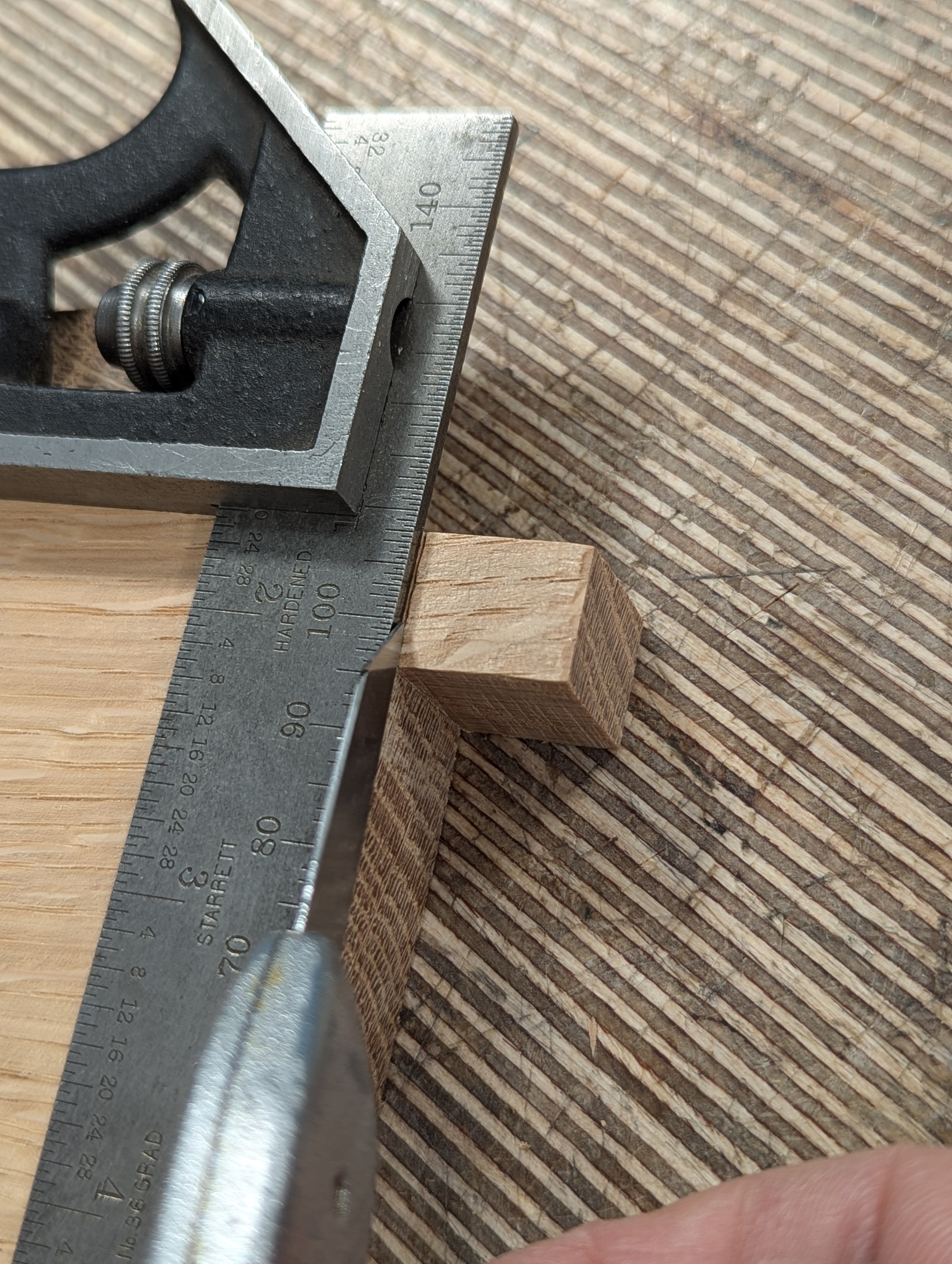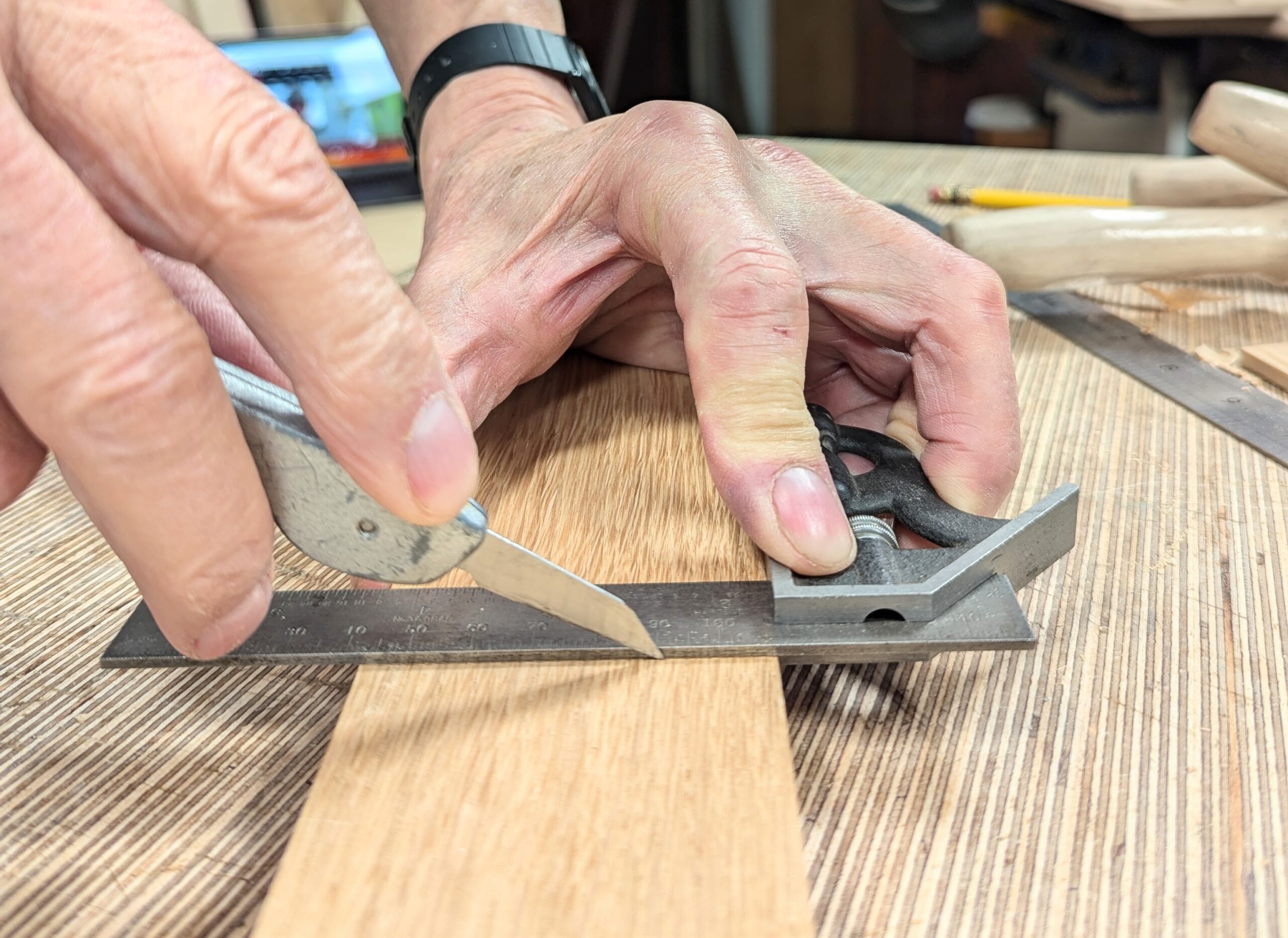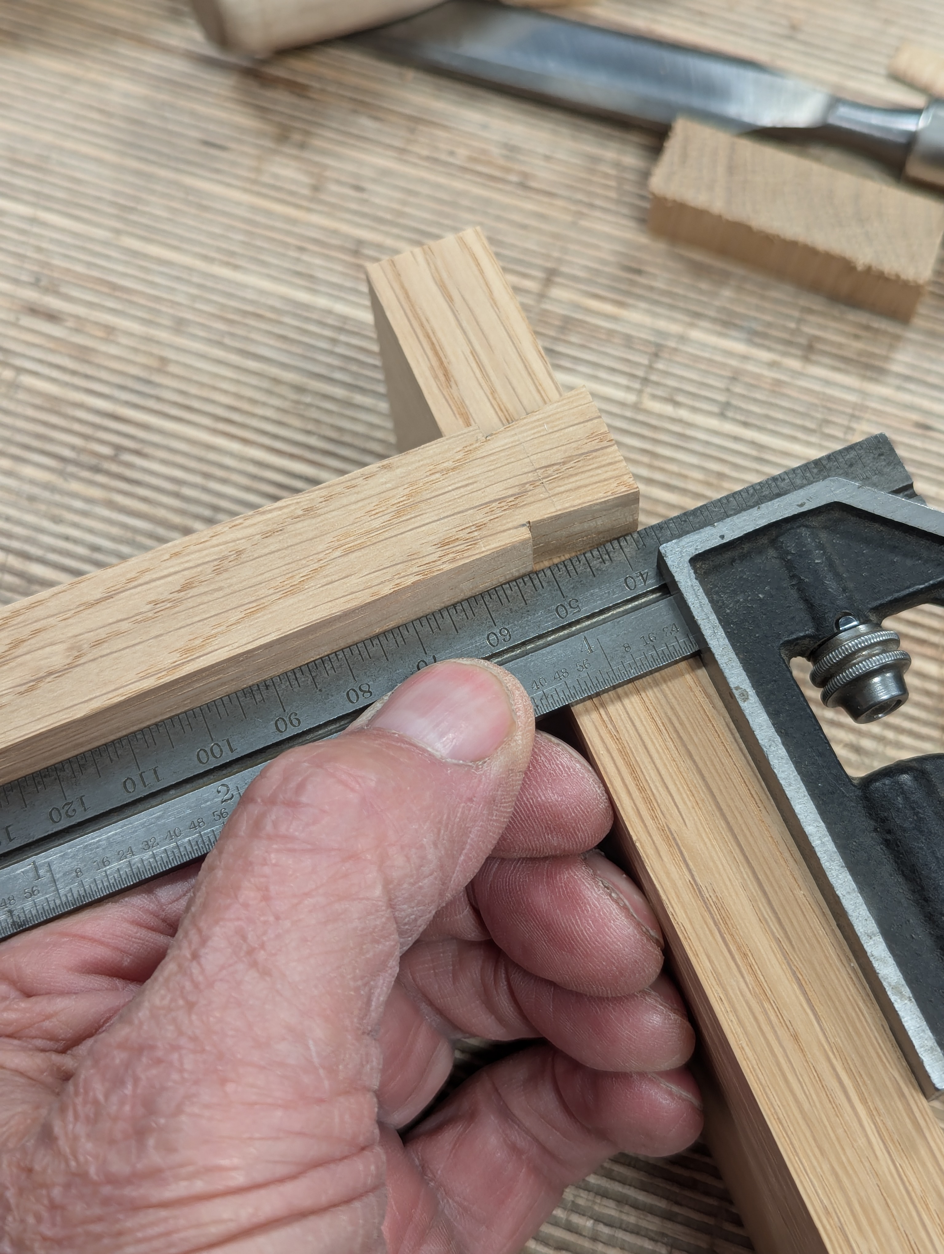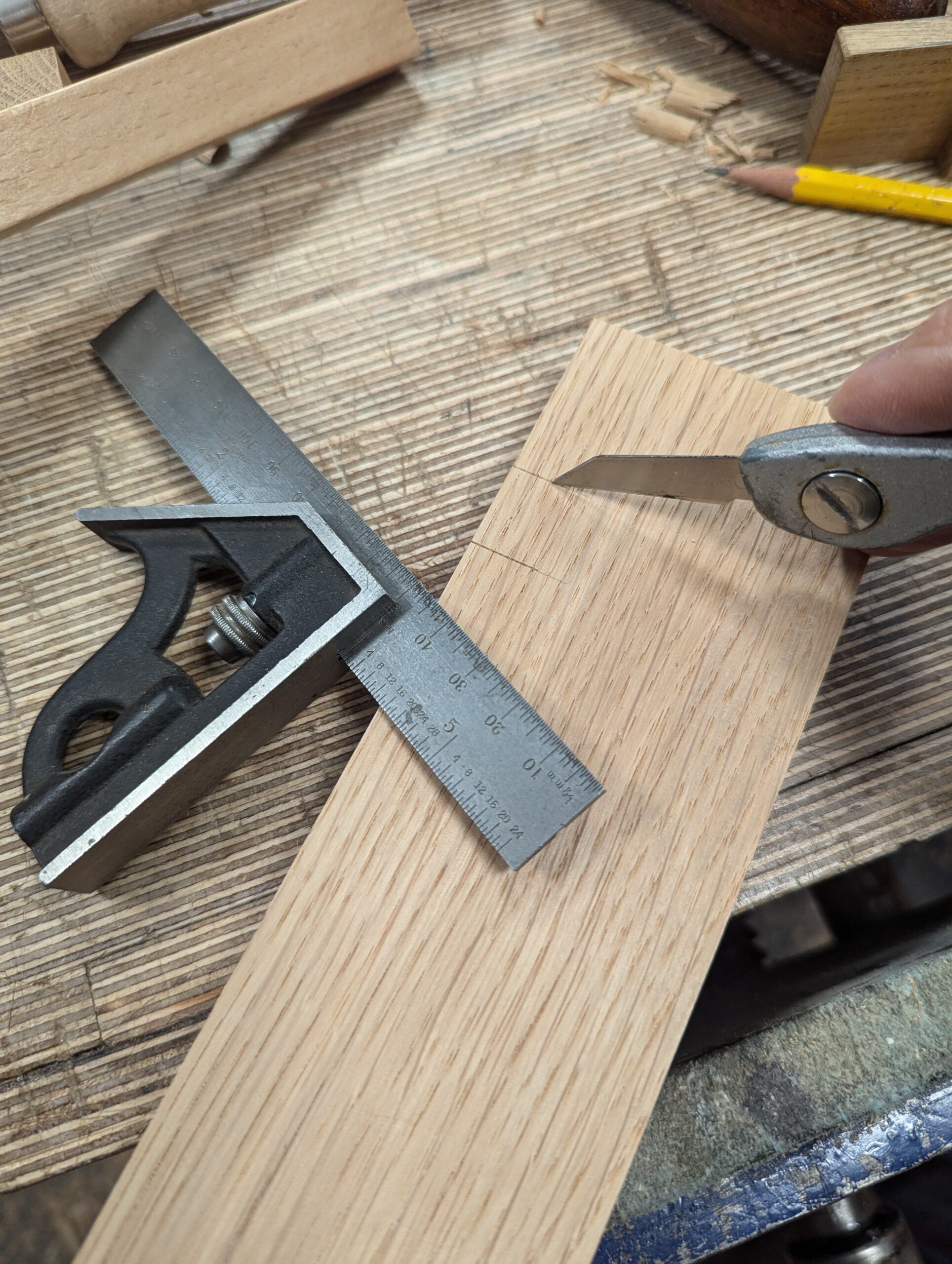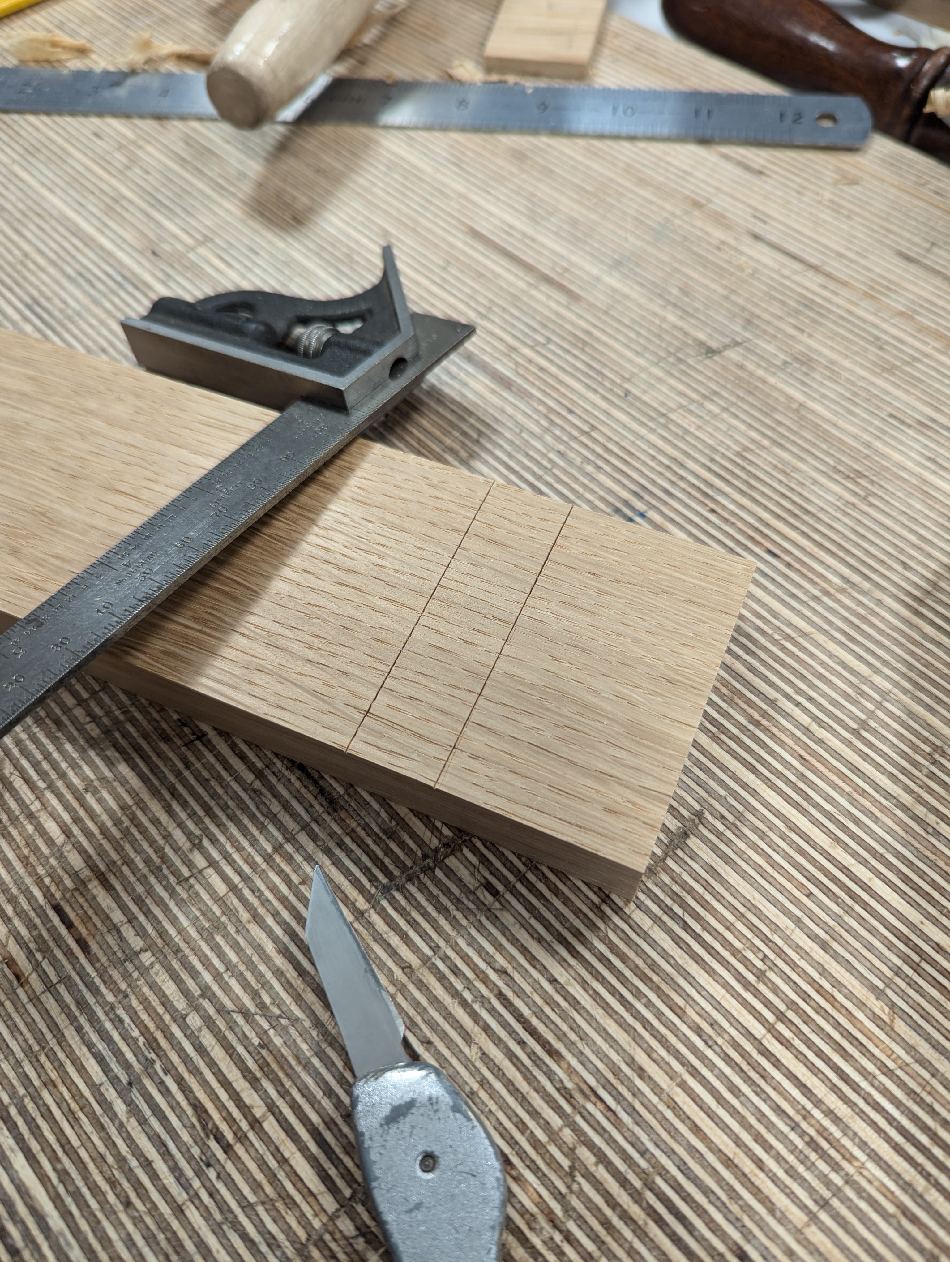 With the square on the first knifewall, place the second piece of wood up against the square and lightly mark the position of the second knifewall.