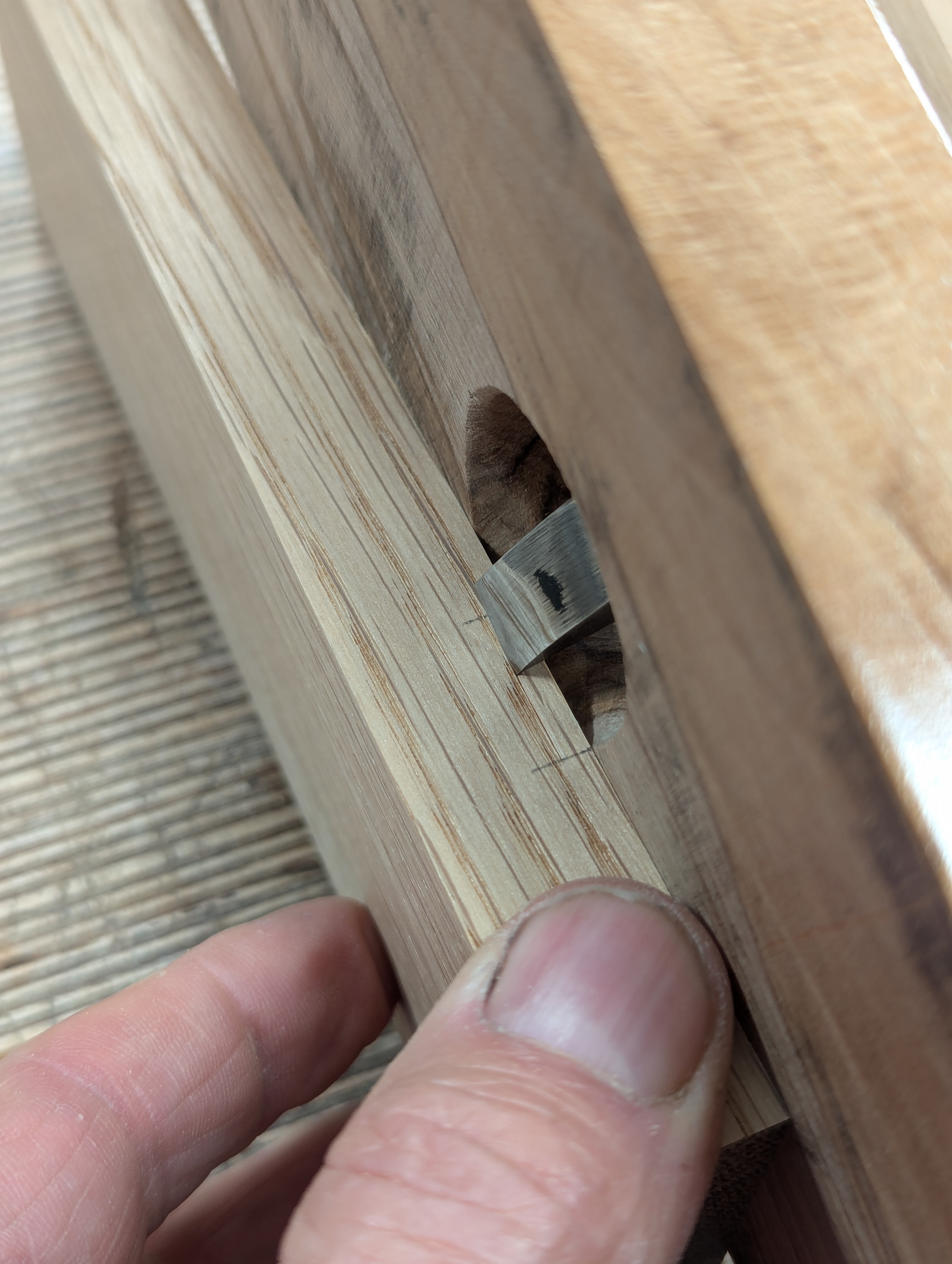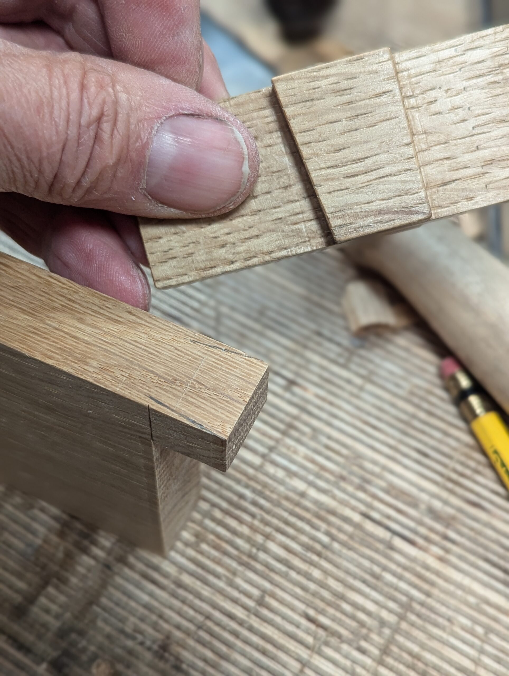 Fit the wood into the housing recess, with the extension onto the topside of the adjacent piece. Check it for square before marking out with the knife.