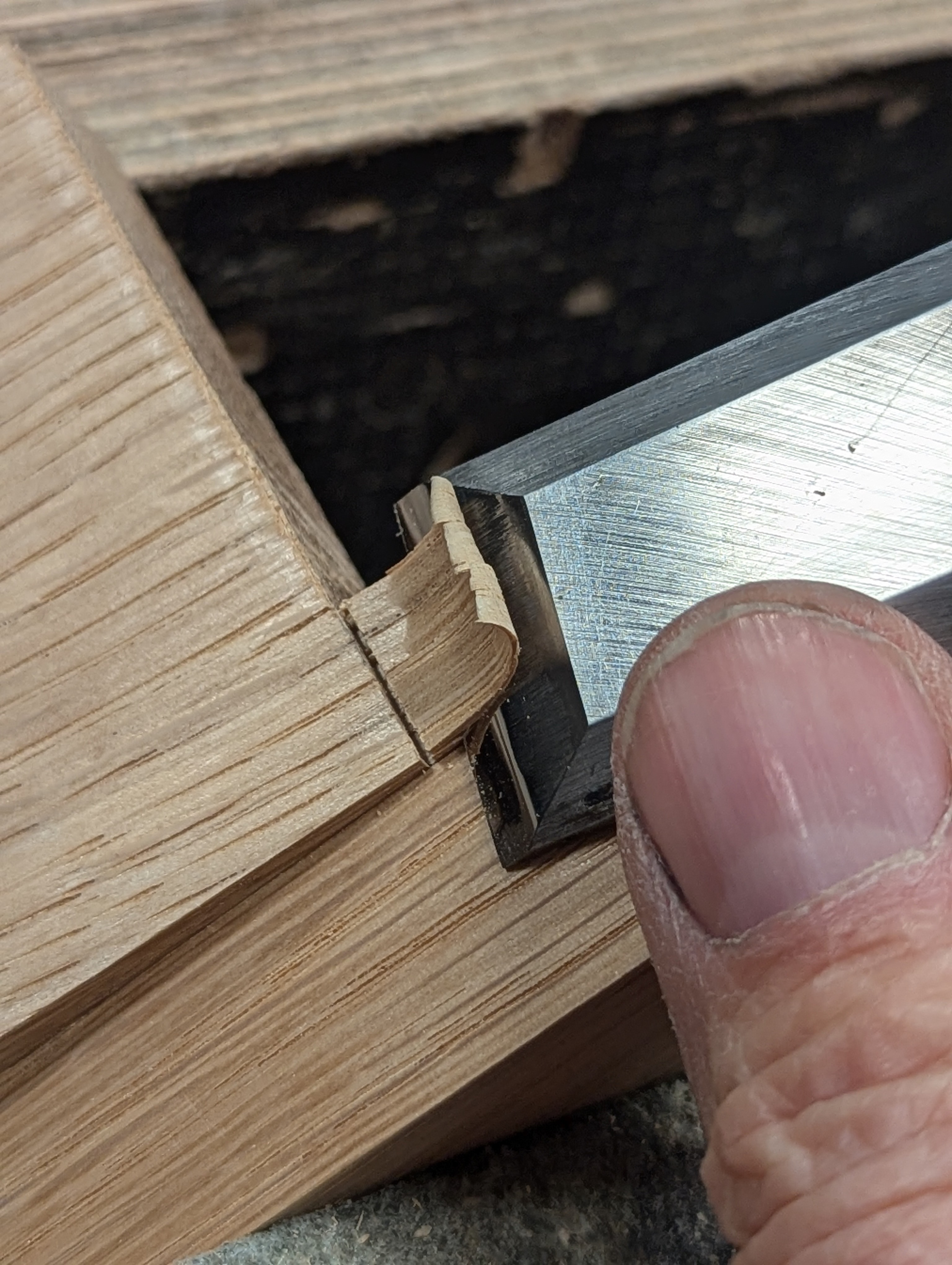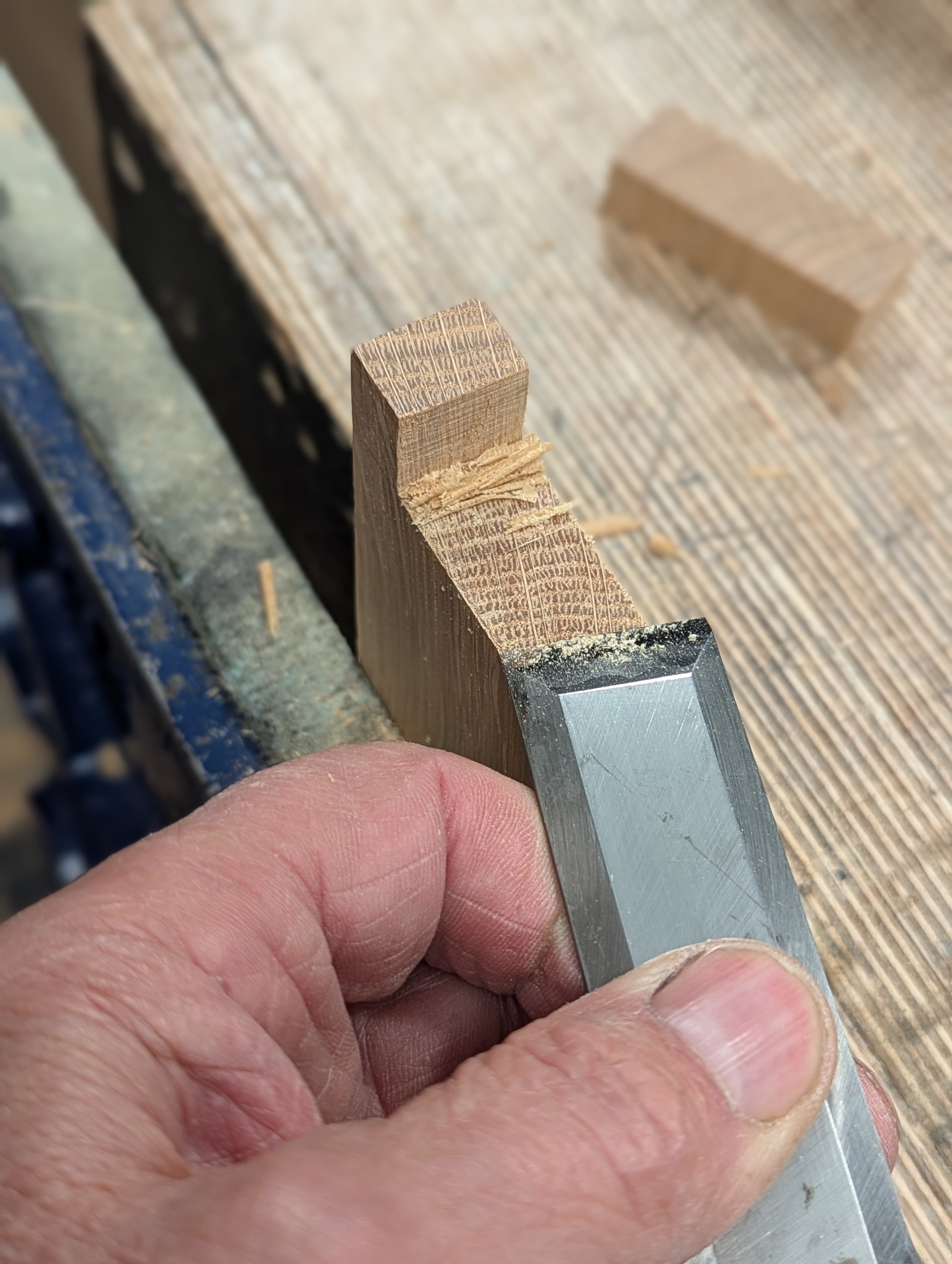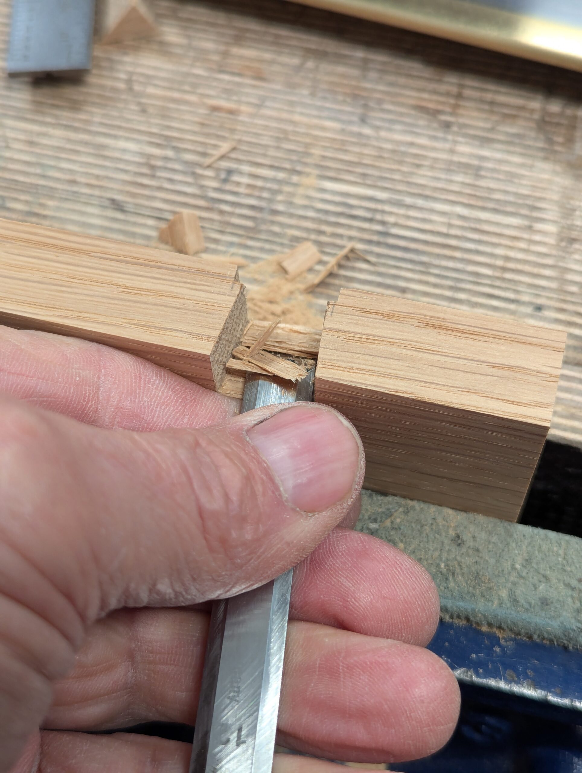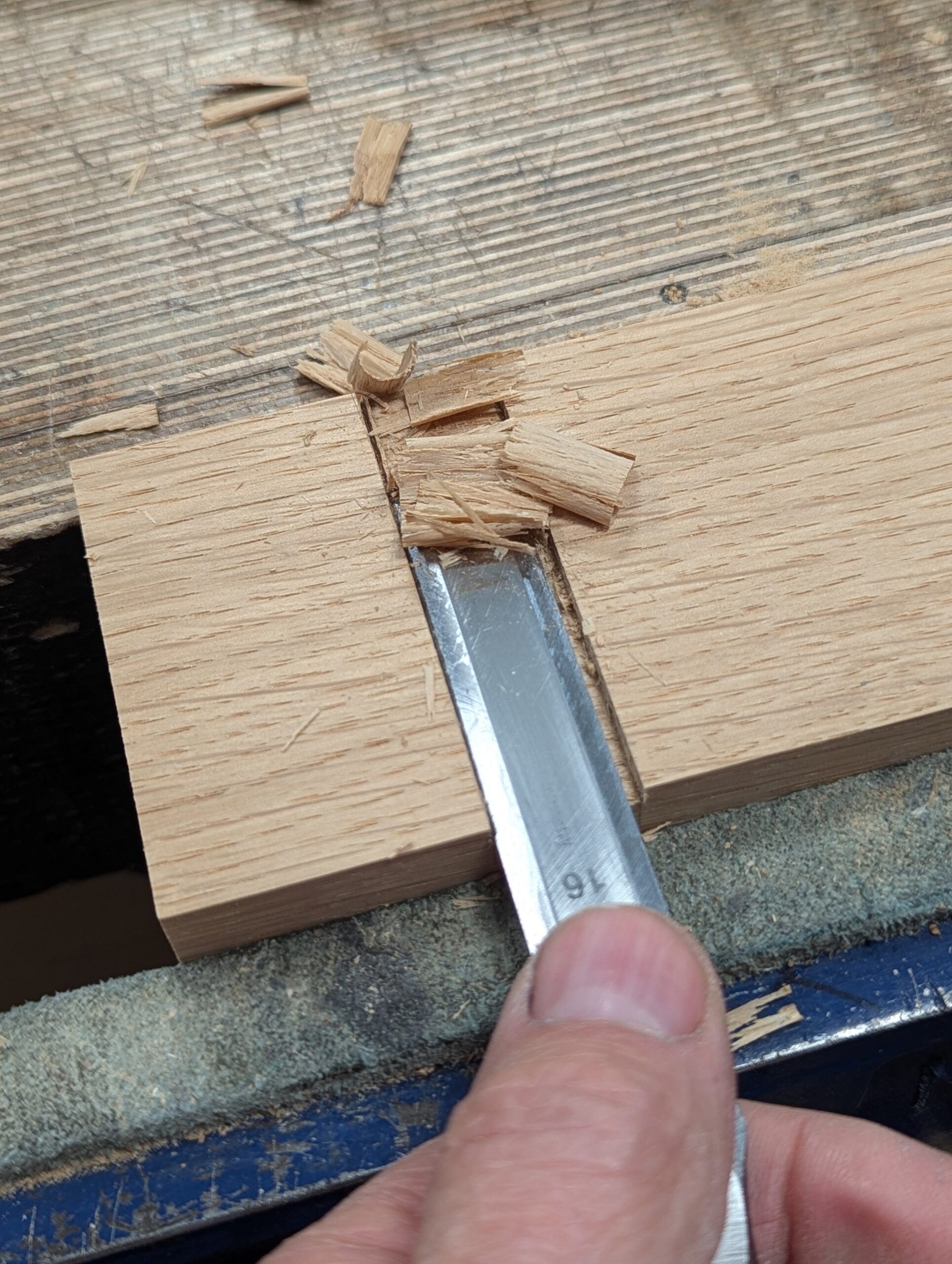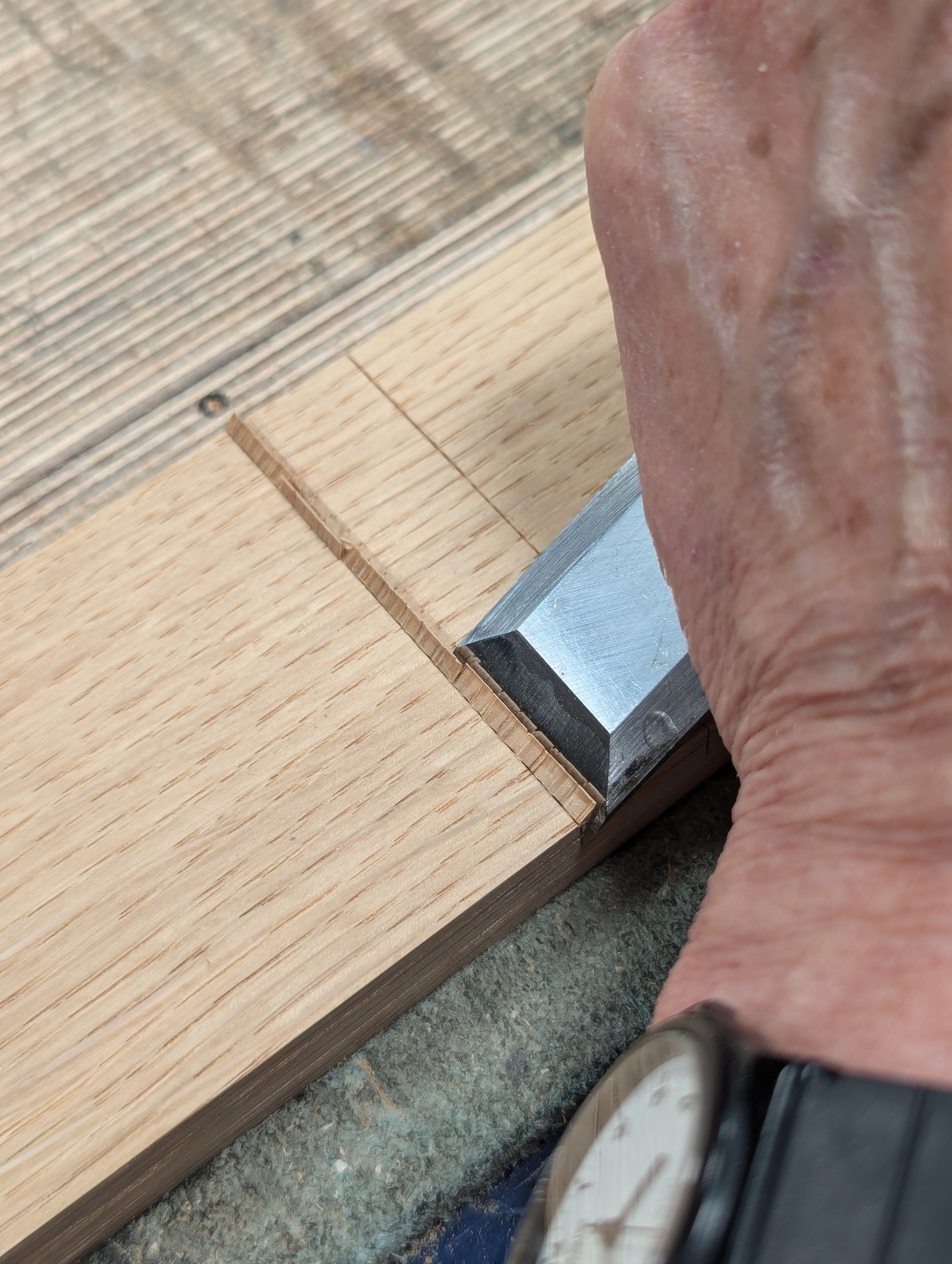 Cut down to the gauge line with a small saw and chisel deeper into the knifewall with long, sloping cuts