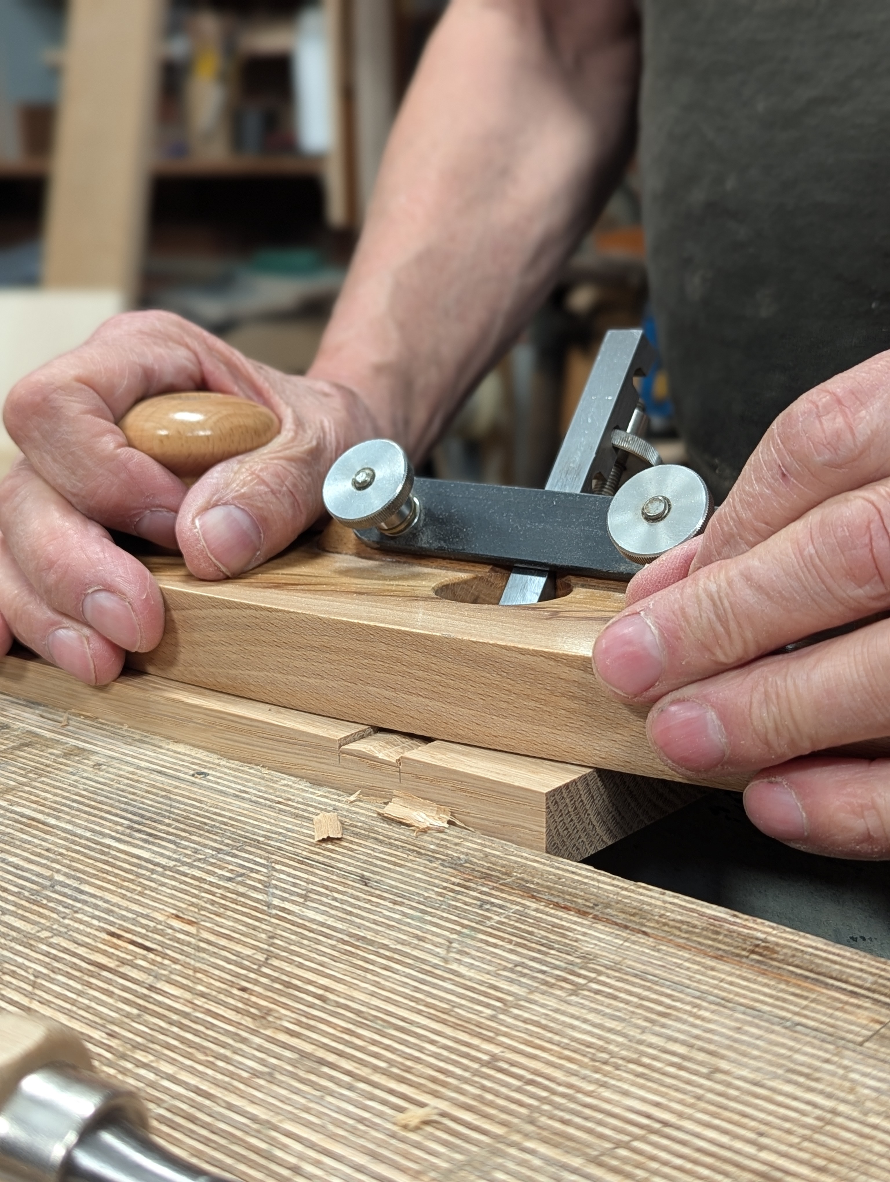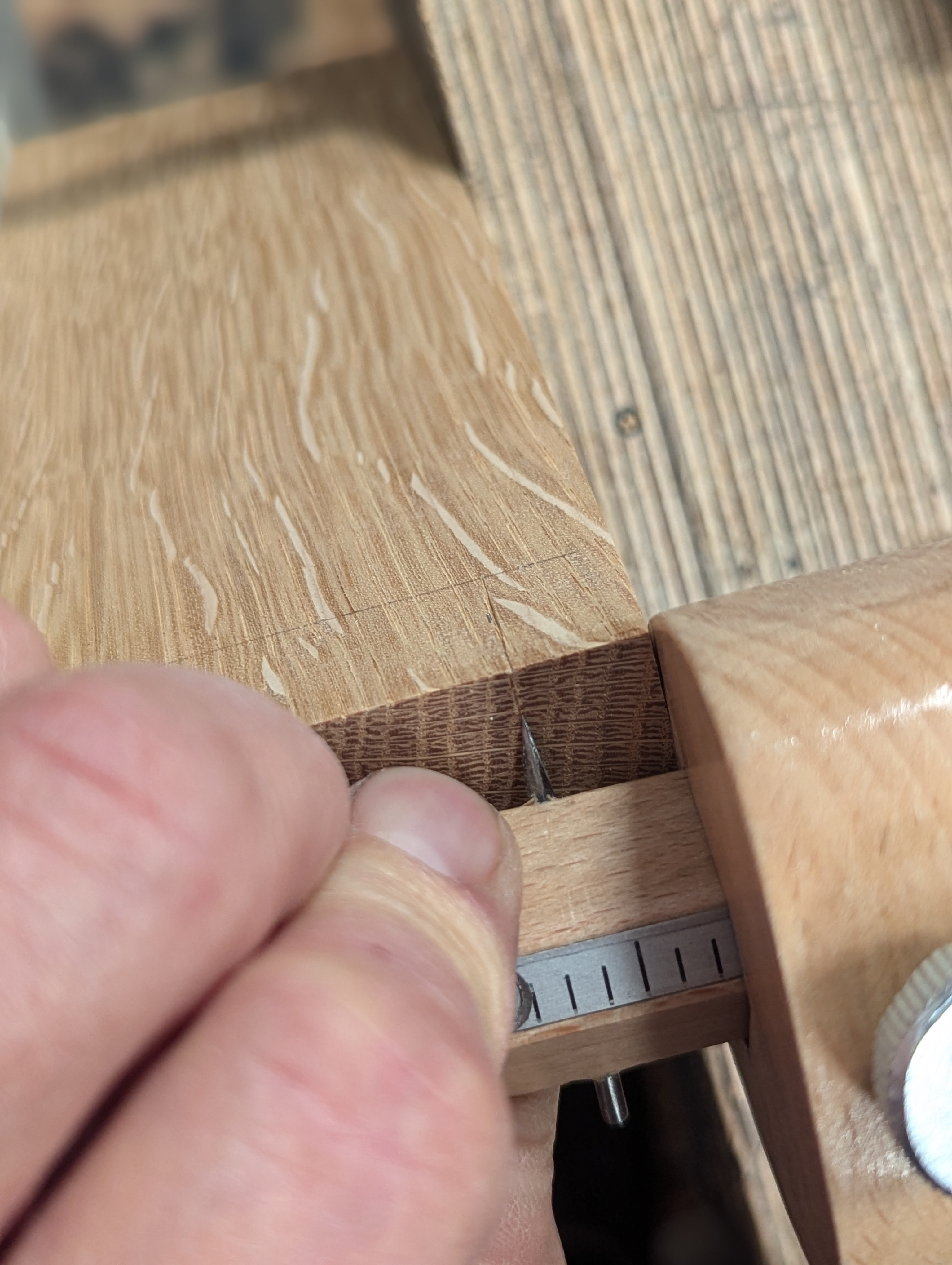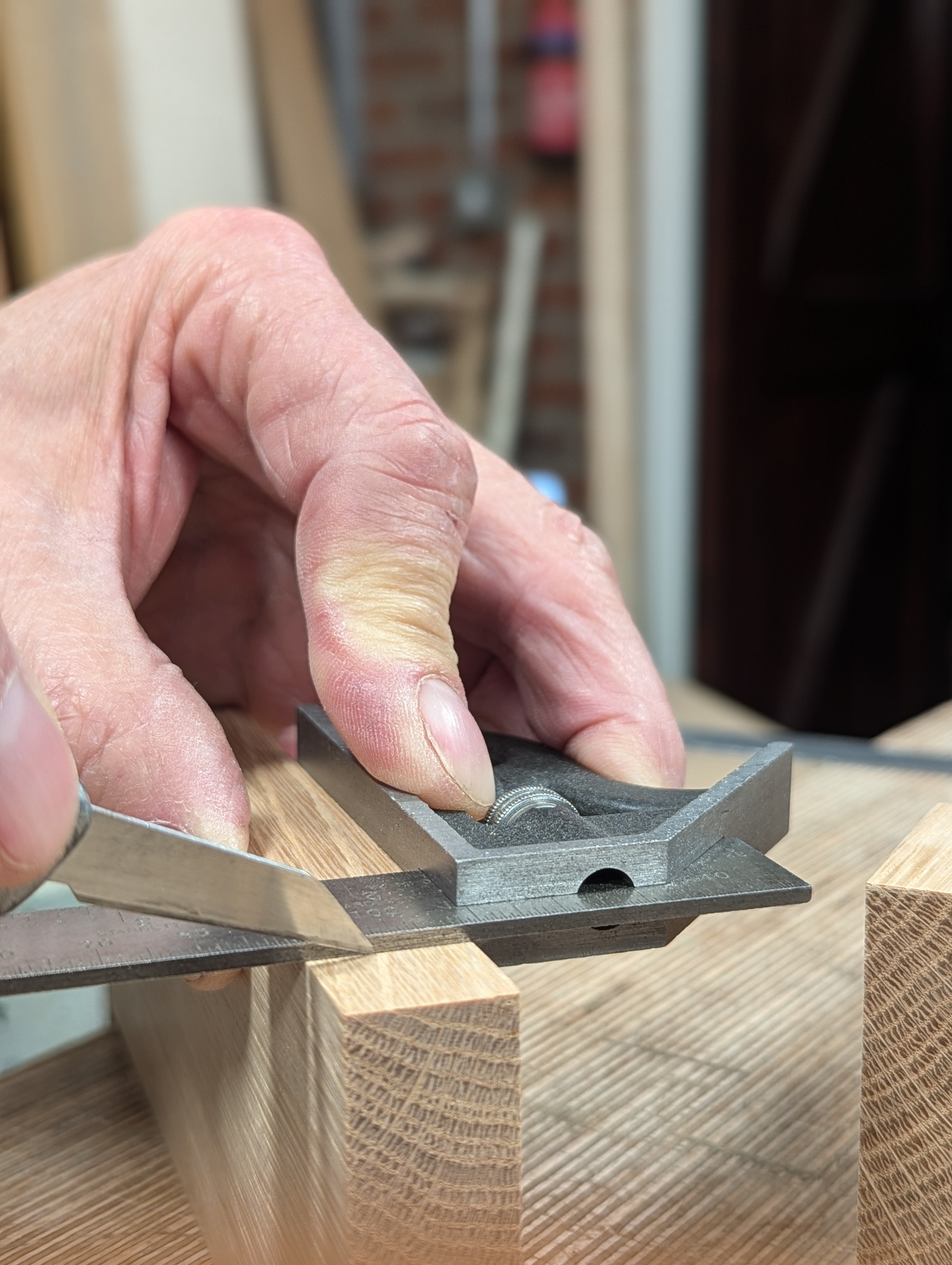 I use the router plane as a gauge to mark the depth of the housing dado between the two lines.