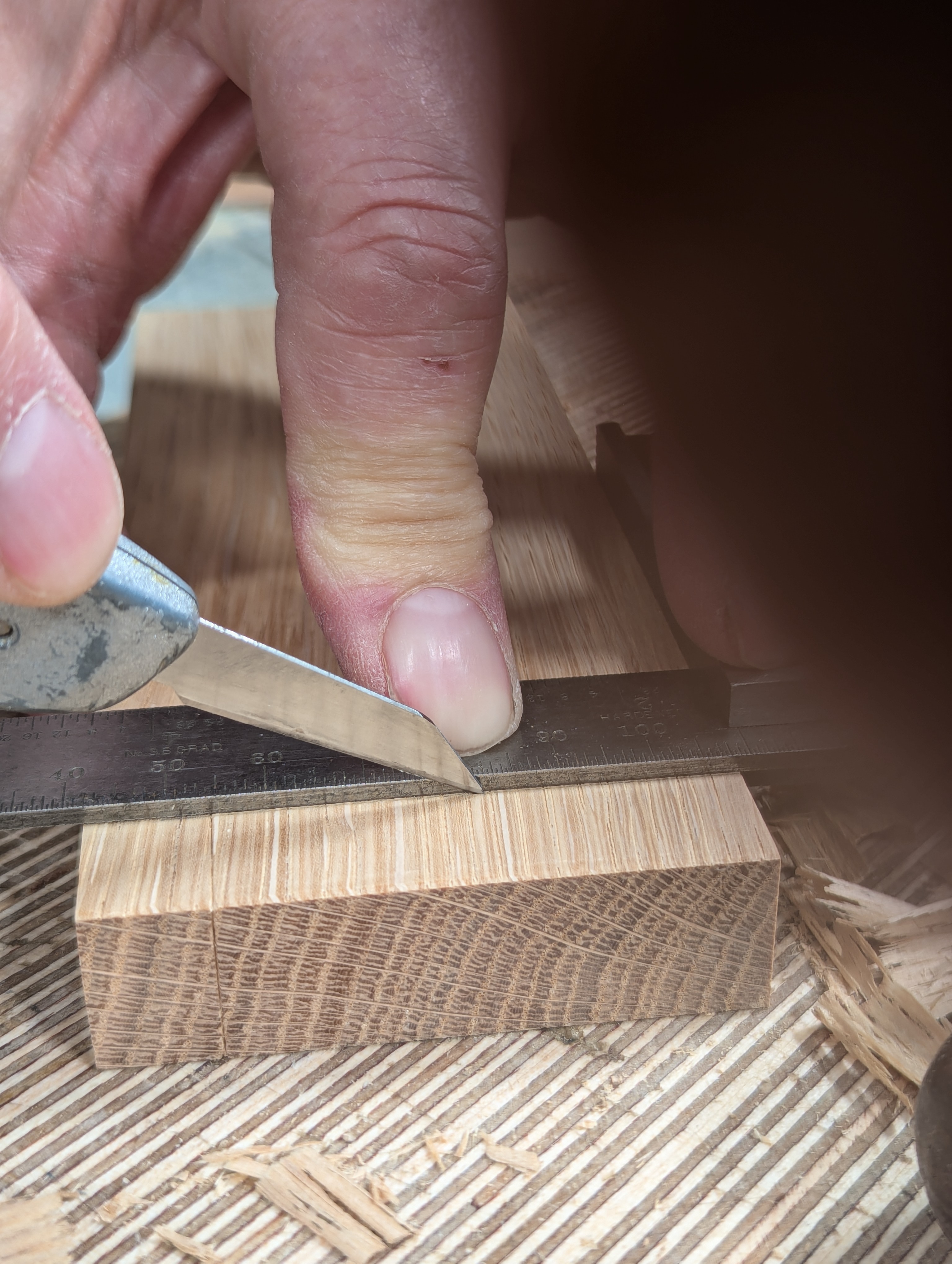 Use the knife to establish the exact cut lines on each side of the dovetail.