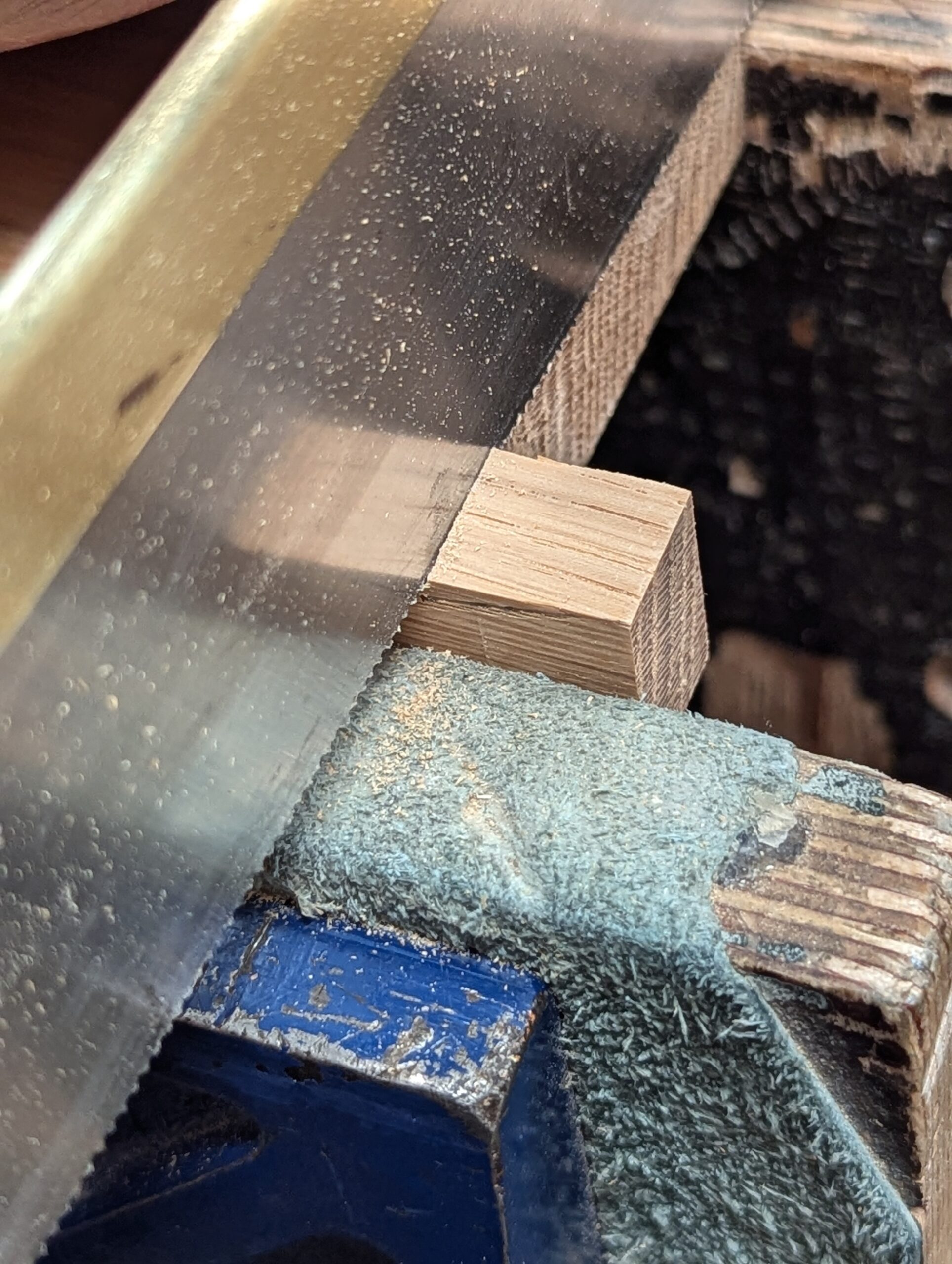 Use a square edged piece of wood as a guide to match the angle of the dovetail, and clamp them side by side in the vise. I emphasize that the edge of the guide wood must be dead square.