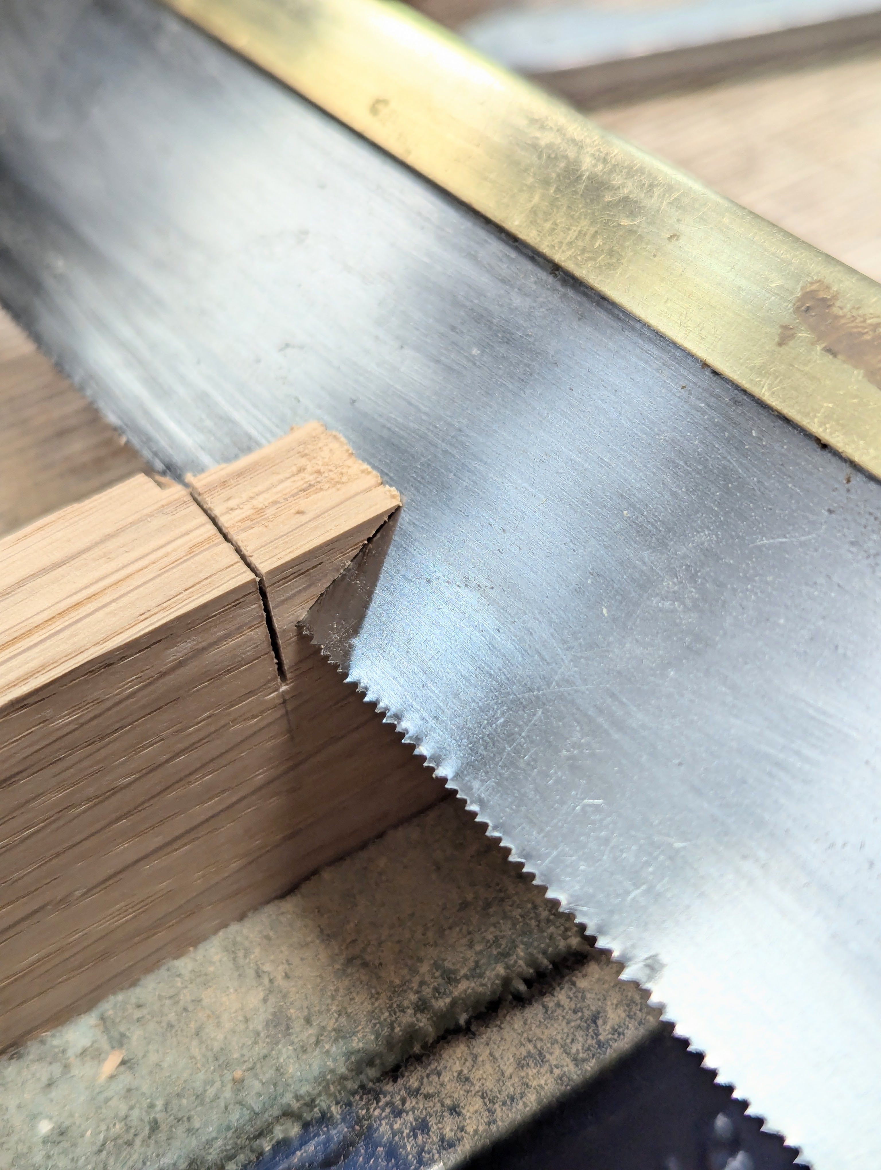 Saw down the wide section to the gauge line, working tight to the knifewall as possible.