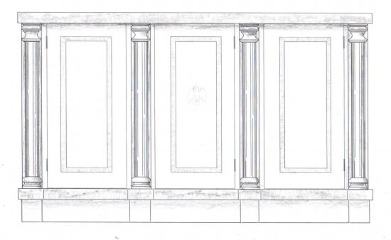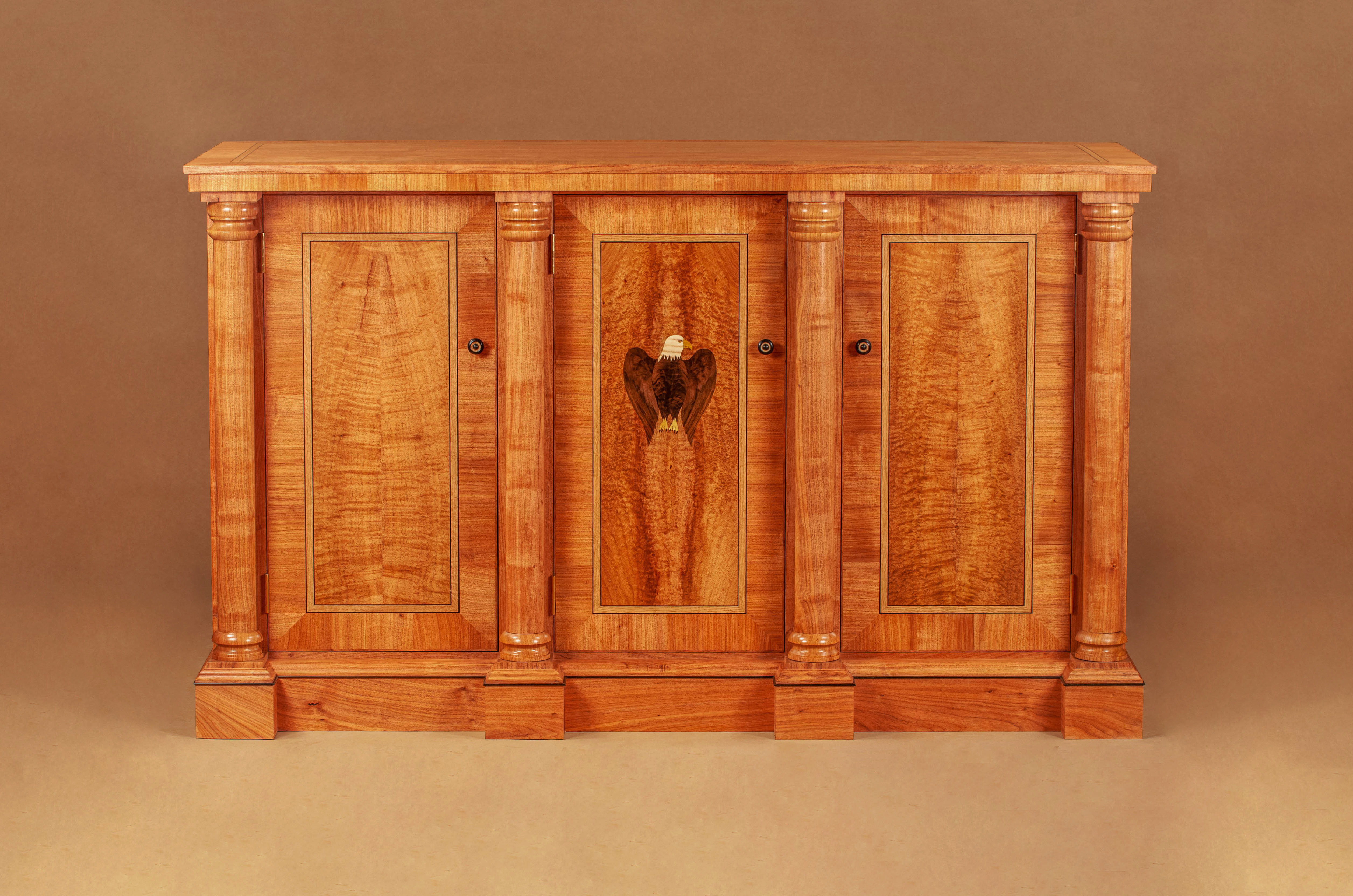 As the work progressed, standing on levelled podiums anchored to the workshop floor, it became obvious that these designs were not being made or intended for any kind of average home or office. Visitors to the workshop came and went and asked who the cabinets were for. We all kept schtum for fear we would never get the work done if we were plagued by reporters wanting to know the scoop. In the last day or two, adding the doors and applying the finish, it was the eagles (one in the centre door of each of the two cabinets) that finally gave the game away.