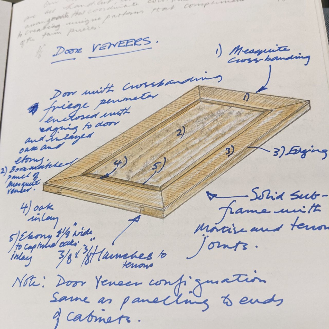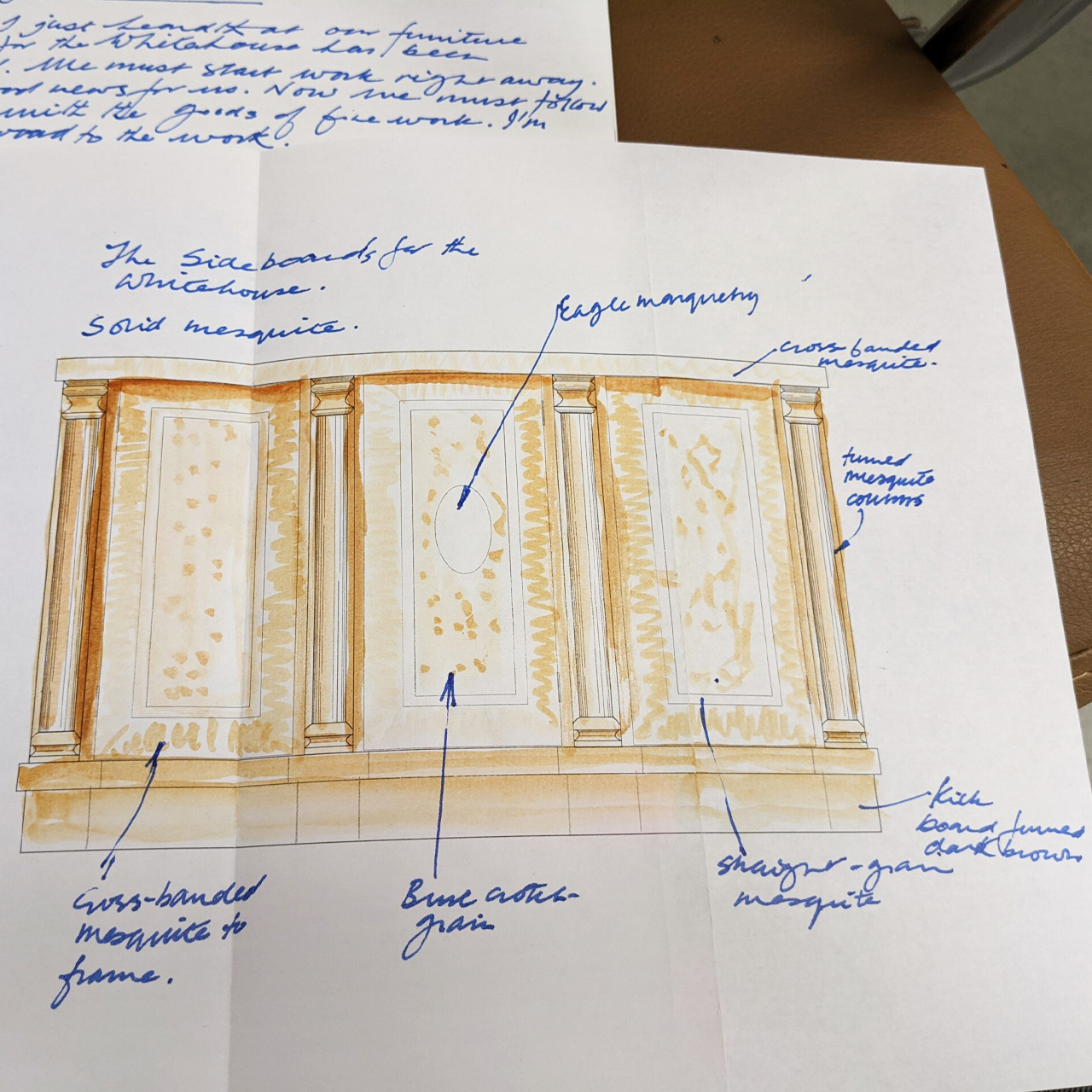 The personal journals, kept then and ever since, tell the fuller story of how my designs arrived at the White House. On the 15th December 2008, I wrote: Well, I just heard that my furniture design for the White House has just been accepted. We must start work right away. That's good news for us. Now we must follow through with the goods of fine work. I'm looking forward to the work . . . Later I wrote ...we now have less than a month to complete two months worth of work. And...what a privilege to be working on work ordered by President Bush. No small thing! I unfolded the drawing I made. Considered the details of all of the joinery, the complexities involved in making it, the woods, the people I needed and then the existing commitments that also had to be delivered, the ones already scheduled and such. In the midst of the coming weeks, I had two woodworking classes. They could not be cancelled. No Way!