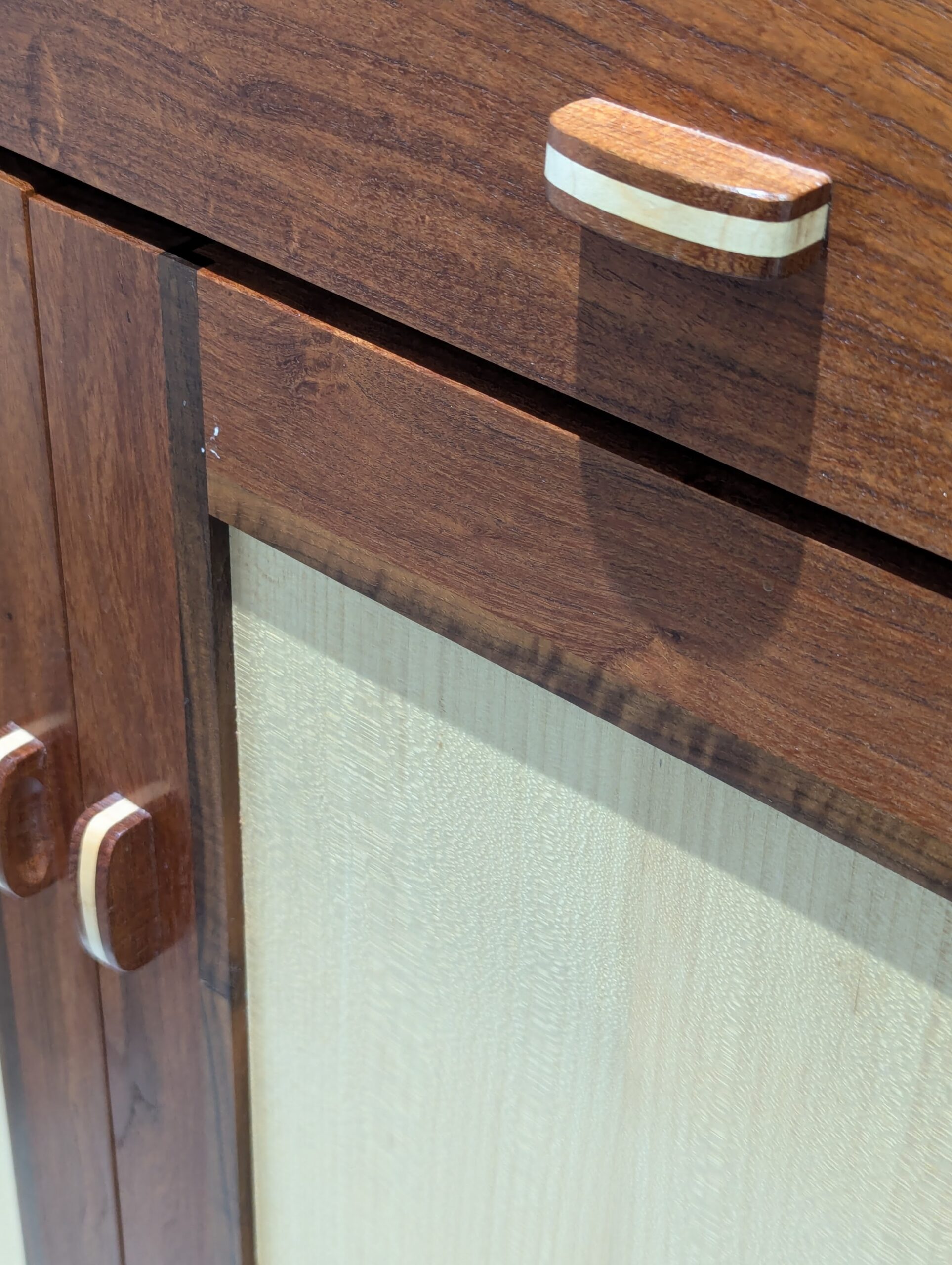 The two sideboards (below) were a joy to make from a mix of hardwoods; sycamore for the cases and door panels, mesquite for the drawer fronts and door frames with walnut trim and then, I kept the theme from the wall cabinet, I used sycamore with mesquite for the handles.