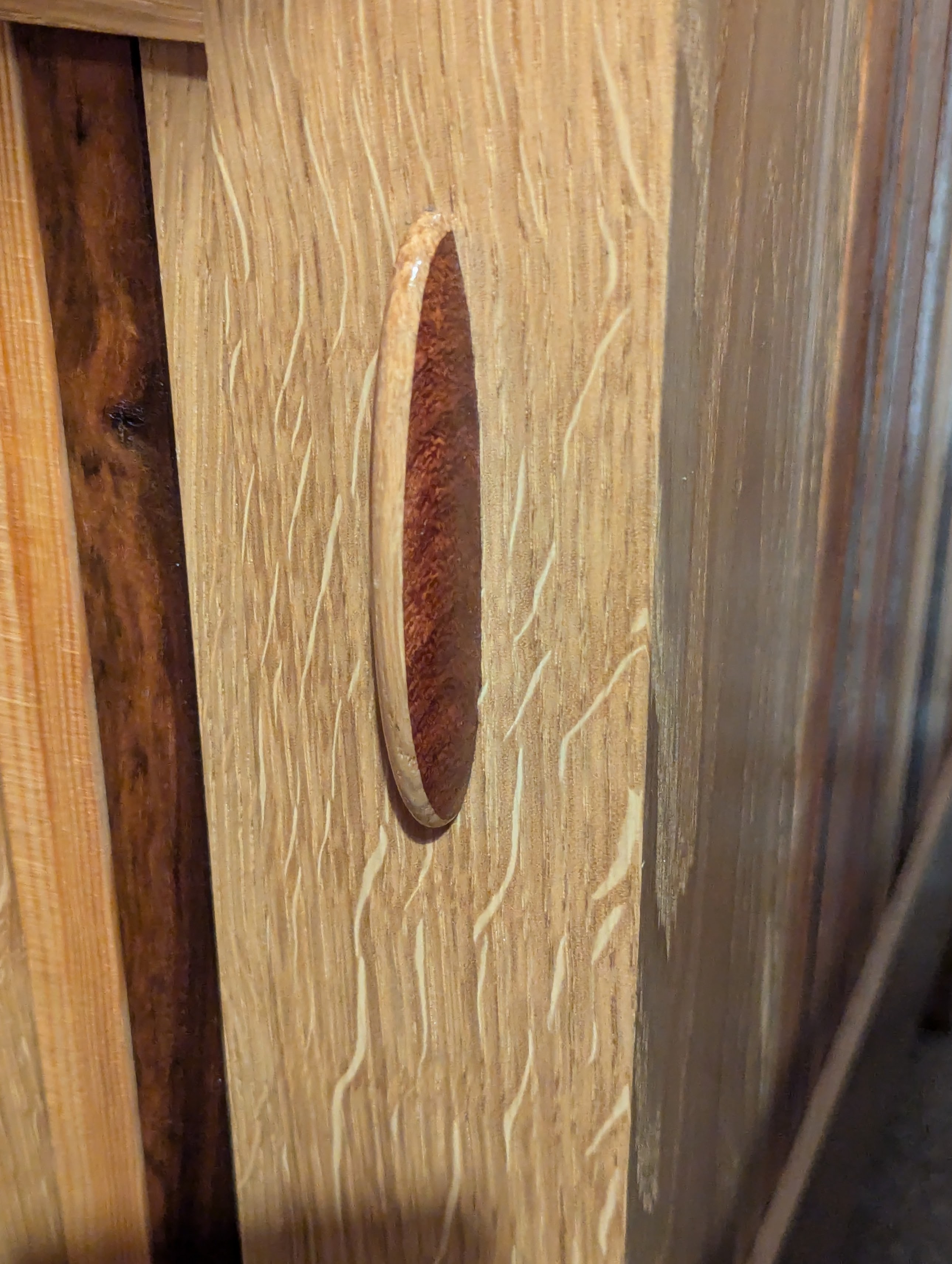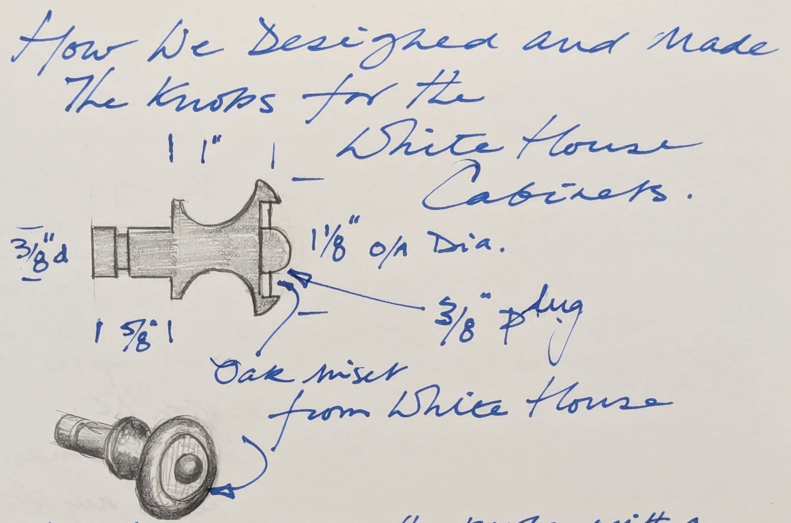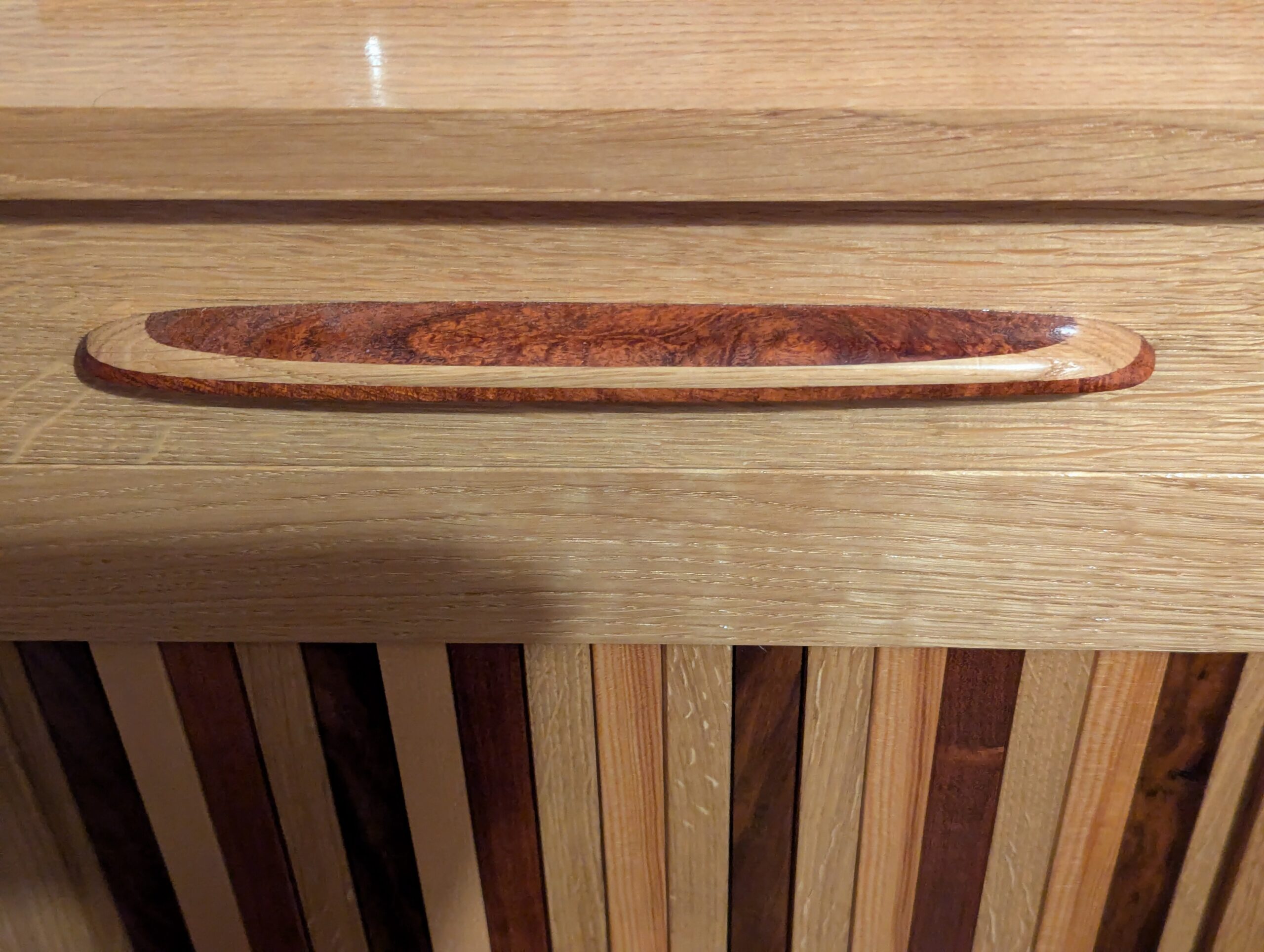 President Harrison had planted the Scarlet oak tree in the grounds of the White House in 1889. Then, prior to my need of it in 2009, the oak he planted dropped a large limb, which was kept and preserved by the groundsmen and eventually, it ended up with me. My cabinet doorknobs are made from three pieces rather than two. The parallel ring of the Harrison oak, sandwiched between an ebony eye and surround, compliment the panels in the doors we made.