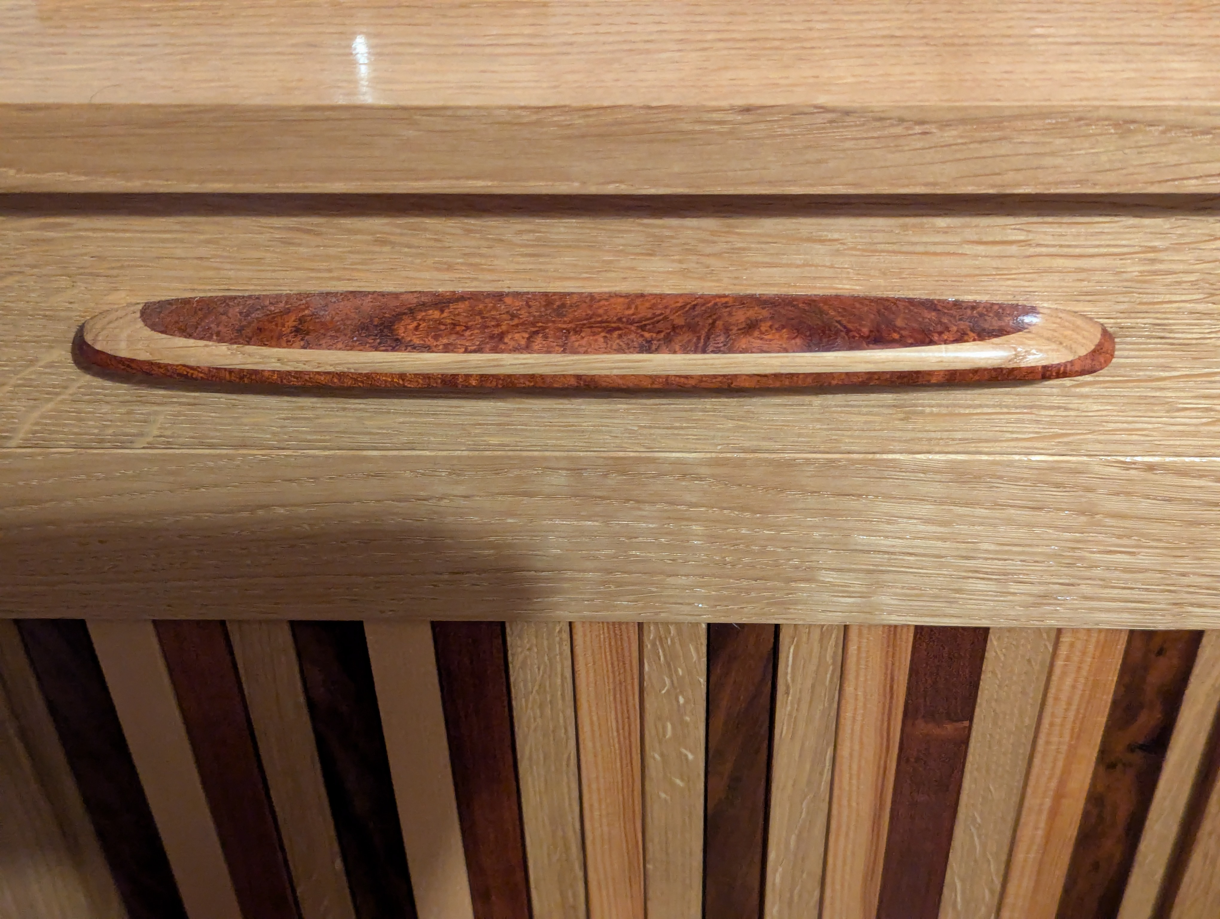 For the busy-wood bedside tables, I laminated oak as a sandwich between mesquite strips and then created the quarter ellipse shape with a spokeshave and a rasp.