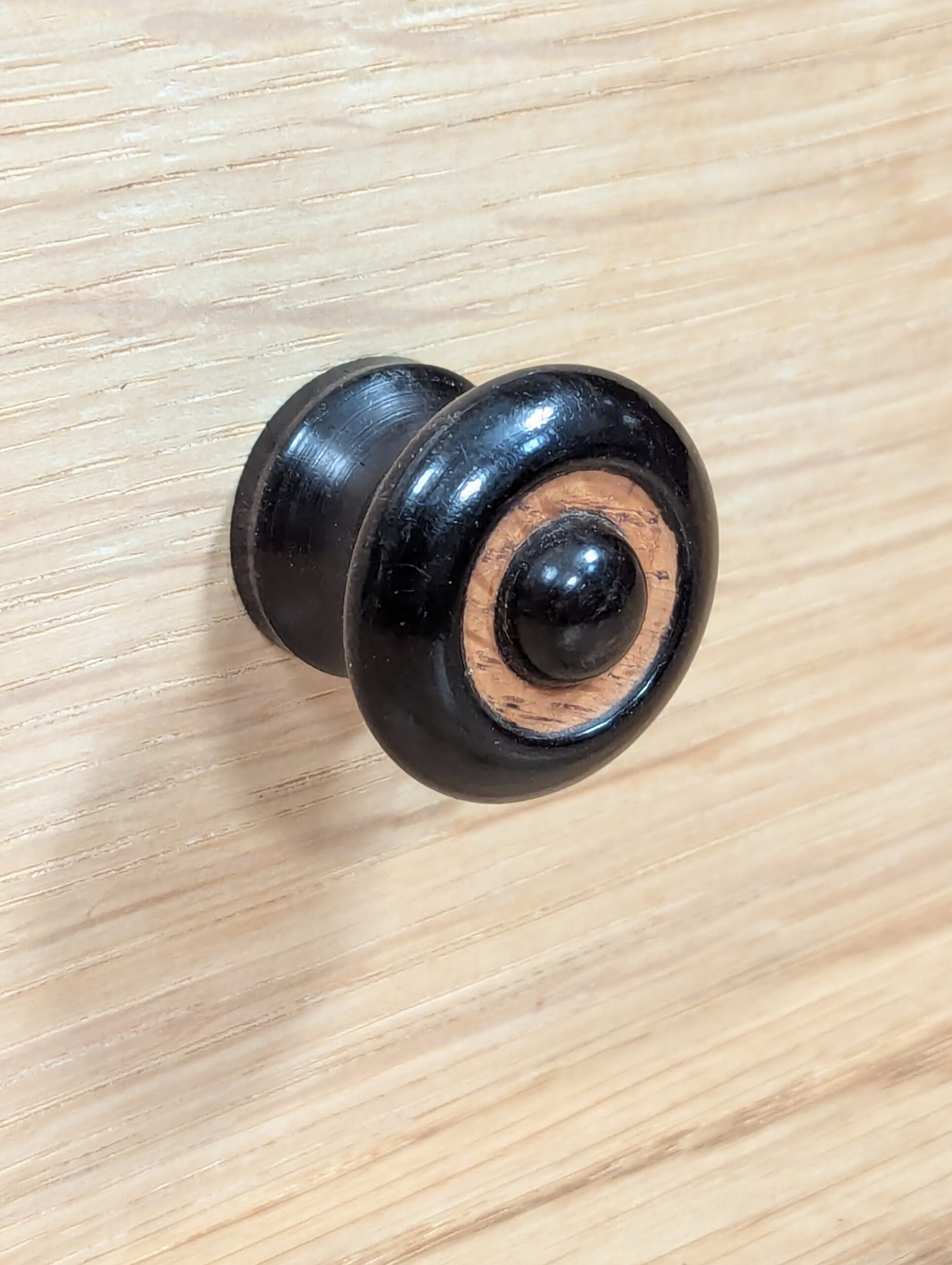 The method of making was straightforward and simple. First, the knob was shaped with its cove, foot and stem and the bulk of the waste on the dome. Following that, we removed a 5/8" diameter recess with a parting tool to receive a 5/8" diameter oak plug, which we created with a 5/8" diameter plug cutter housed in a drill press. The plug was parted off and then recessed with the parting tool again. Then we created the ebony plug with a plug cutter, drilled out the 3/8" hole in the centre of the recessed oak and installed the black plug. The last step was to dome the ebony plug with a small fingernail gouge. The final finish was three coats of clear shellac.
