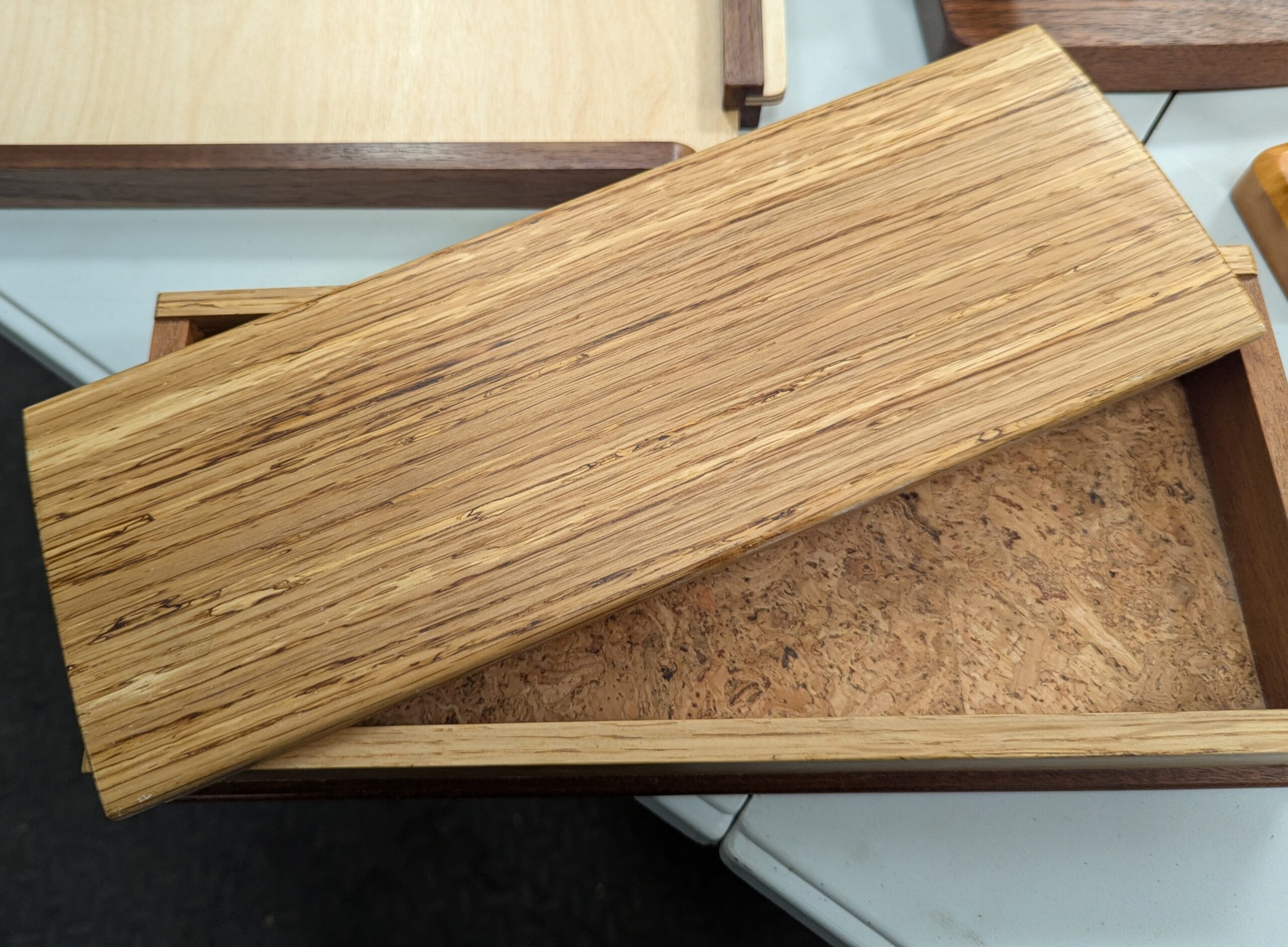 There is an acceptable contrariness in wood that might be intolerable in humans. On the other hand, are we not all different and through our differences, do we not create contrast rather than the boredom of ultimate compliance? Spalted oak, as in this lid, is the rarer gift of unpredictability to us than in other woods. I remember vividly planing the surface of this oak piece that showed no signs of its diverse patterning before the plane took from it its outer roughness left by the saws parting off into planks. What kind of gift is this that separates itself in vibrant richness of colour through the process of decay. Does this not show that, even in decay, comes order?
