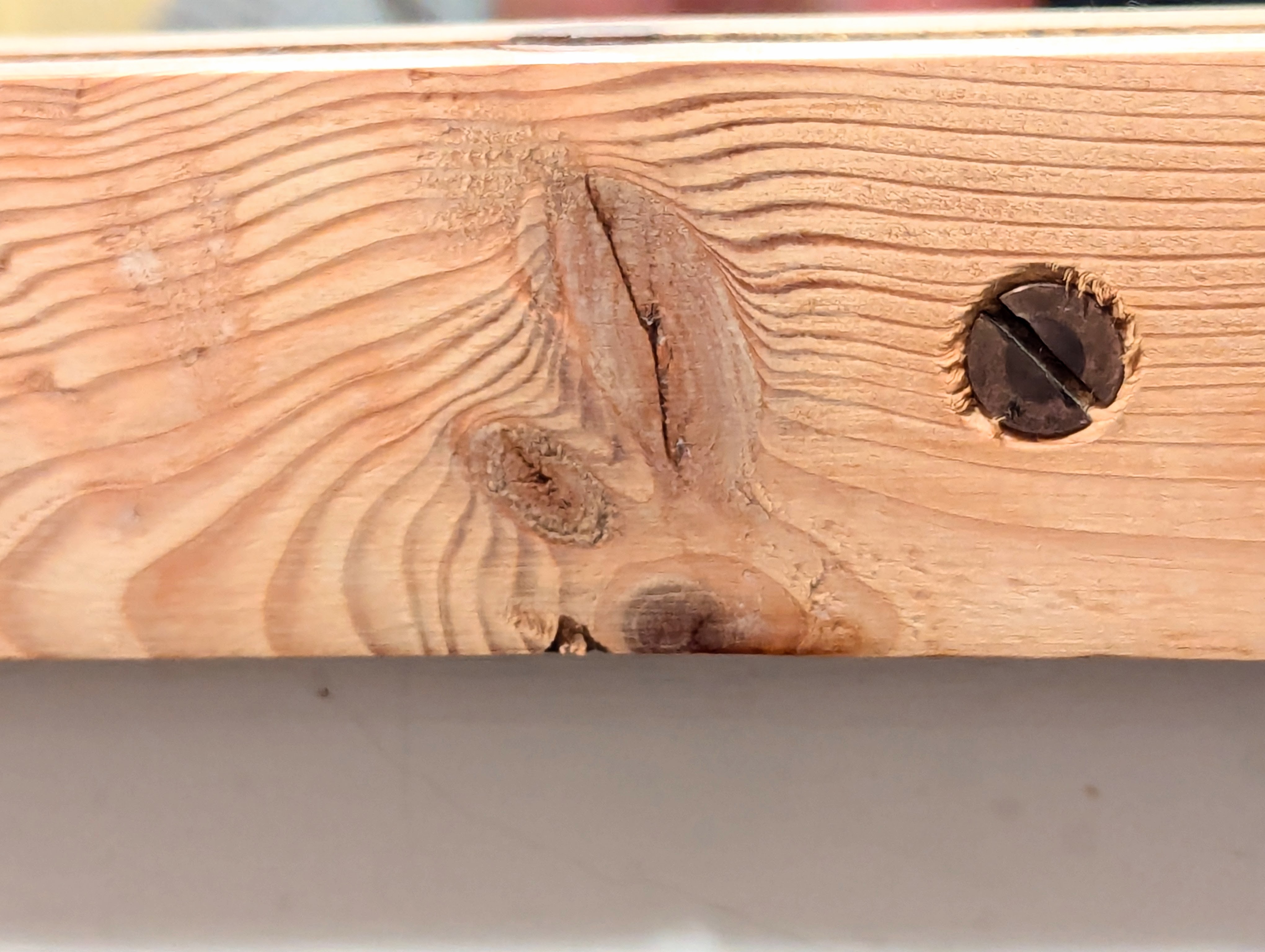 I couldn't help but see the Koi carp swirling and circling away from the screw head in this cross rail of a frame surrounding a mirror. It held me for a few minutes, along with seeing how the countersink surrounding the screw showed cuts with and against the grain in its half-inch encirclement. See how the water ripples away as the fish surges away, the babes afollowing. Life is mostly about awareness levels and perspective.