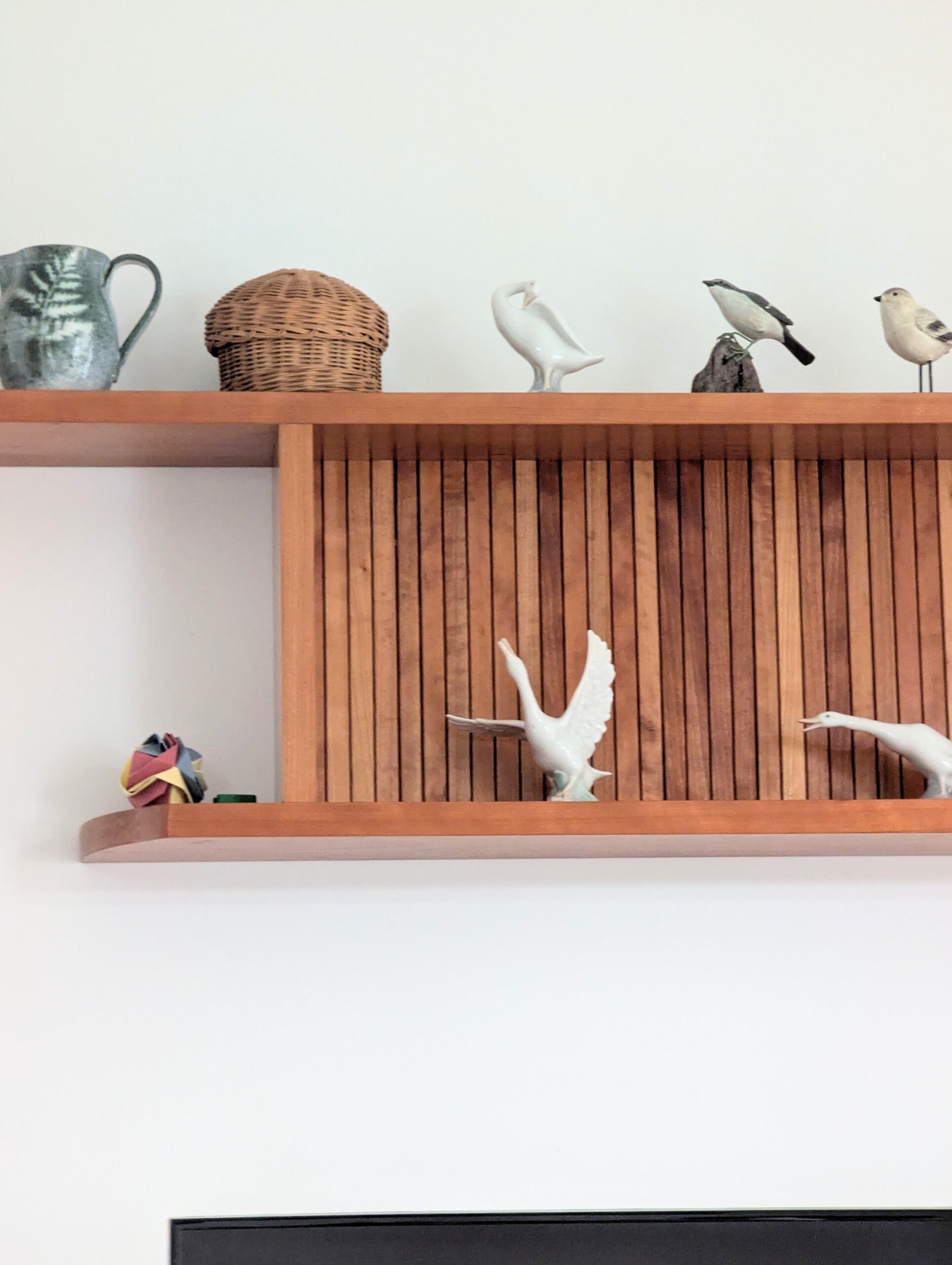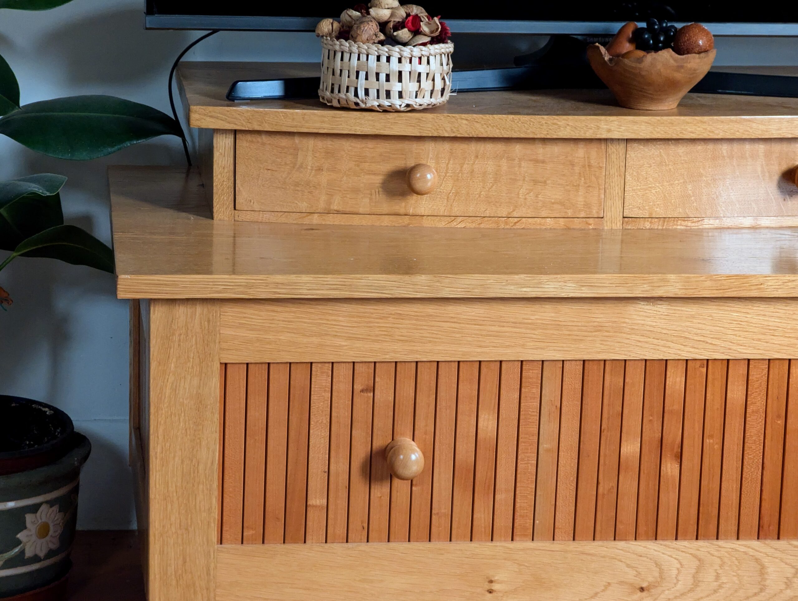 For several of my recent projects, I've been successfully using rippings that were of no use and too many to use, but ones I'd held on to through many months and even years. Instead of fuelling my neighbours' wood fires, I ripped them to 10mm thick and 20mm wide, hand planed the faces and bevelled them with a #4 and housed them in the grooves to create a tambour-look panel. Above and below are some of the projects with every stick and stem hand planed.