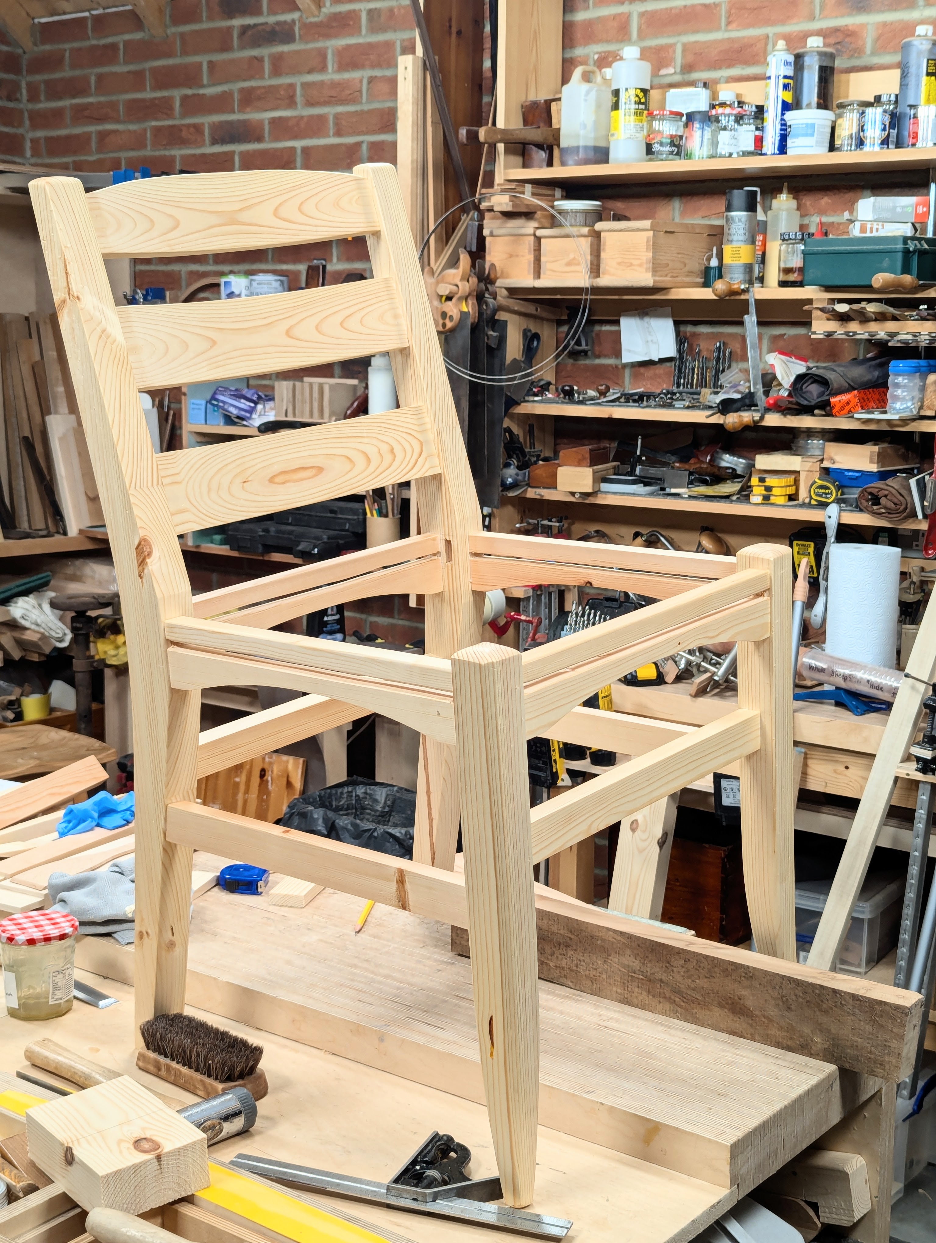 Making my chair in full-on mode would take me about ten hours per chair––longer in a hardwood, which is where I am headed now. Beech is my chosen wood this time. I have some ideas as yet untested but in the pipeline. Prototyping gives me time to make changes, and I have needed to make a few along the way with this one. The important thing for me now will be the comfort of a working sitting position. I like the width and depth of the chair, the angle of the back and the untipability of the chair on the whole. It's squat and the lightweight of pine is actually ideal. Of course, pine is soft no matter the version. Any slight knock will dent it, even small ones, but I would still use pine even so.
