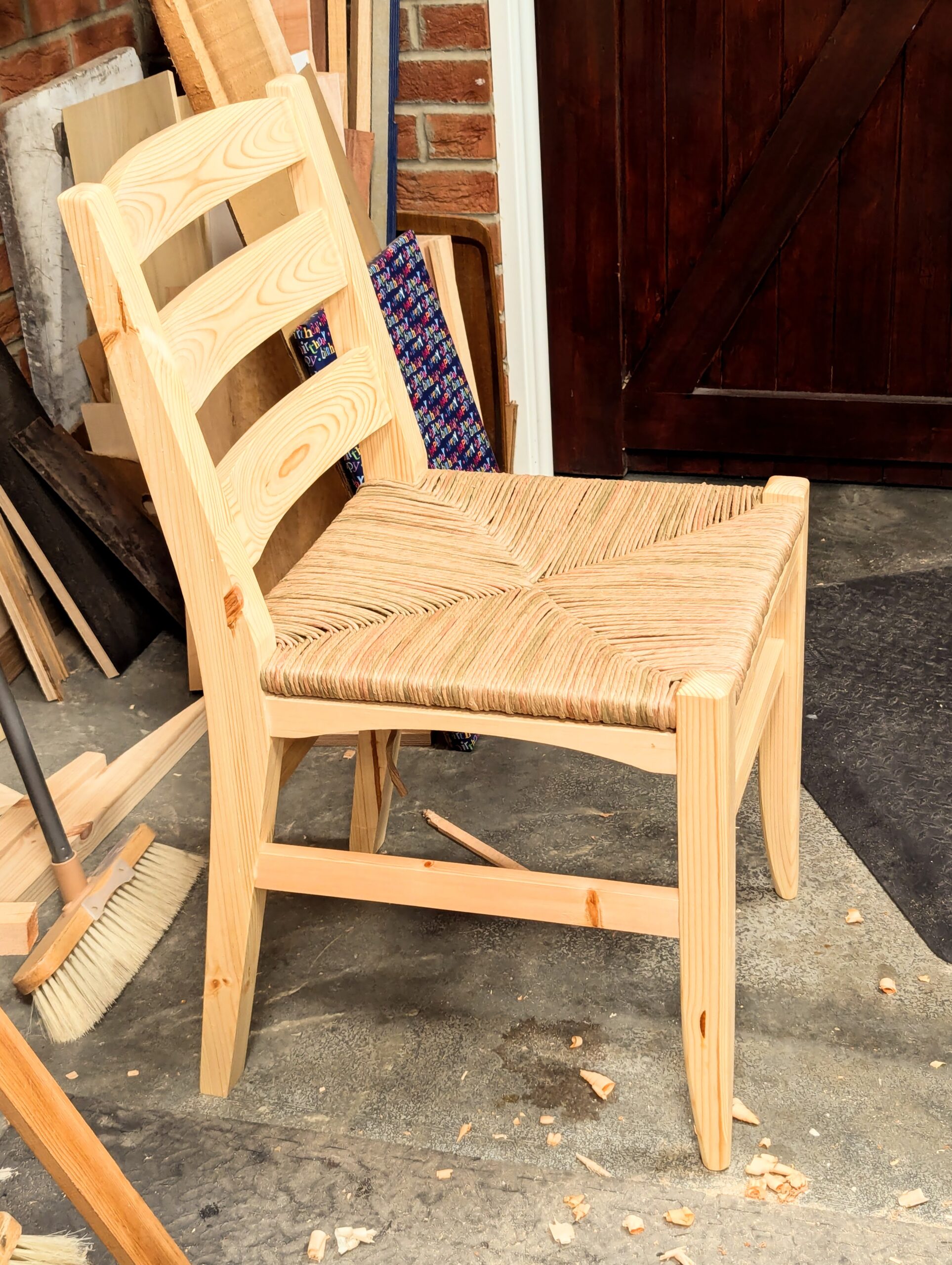 Making my chair in full-on mode would take me about ten hours per chair––longer in a hardwood, which is where I am headed now. Beech is my chosen wood this time. I have some ideas as yet untested but in the pipeline. Prototyping gives me time to make changes, and I have needed to make a few along the way with this one. The important thing for me now will be the comfort of a working sitting position. I like the width and depth of the chair, the angle of the back and the untipability of the chair on the whole. It's squat and the lightweight of pine is actually ideal. Of course, pine is soft no matter the version. Any slight knock will dent it, even small ones, but I would still use pine even so.