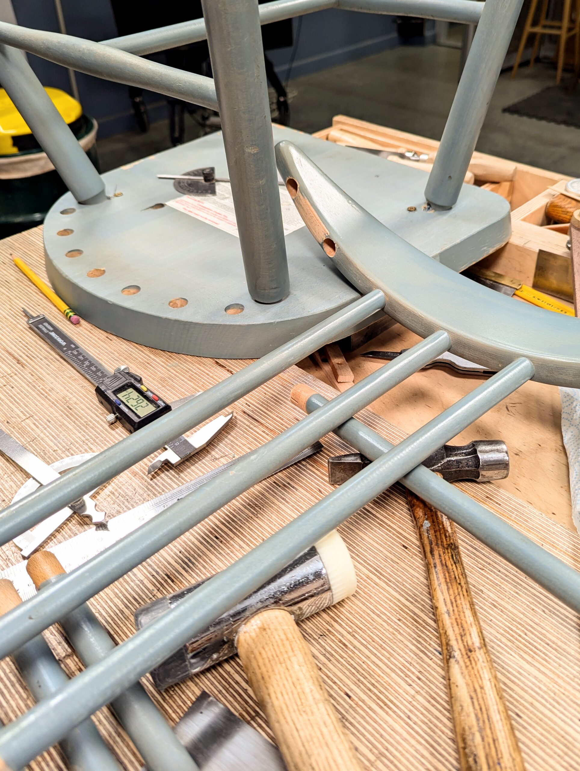 Taking any chair apart will reveal many things, good and bad. We can learn immensely from the work of others, whether that is in newish pieces from factorial mass-making or the archaic work of bodgers in the woodlands of England's past centuries. Of course, factory production goes back a long way, even when all the individual parts were made by hand on lathes lined up for production workers making parts by hand and eye in a factory production setting––the prelude to copy lathes and then automation that simply needed people to load and unload wood blanks.