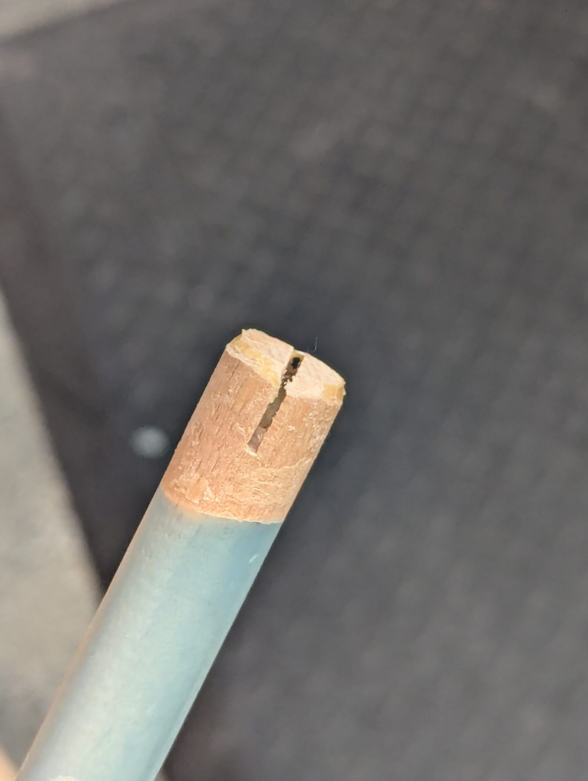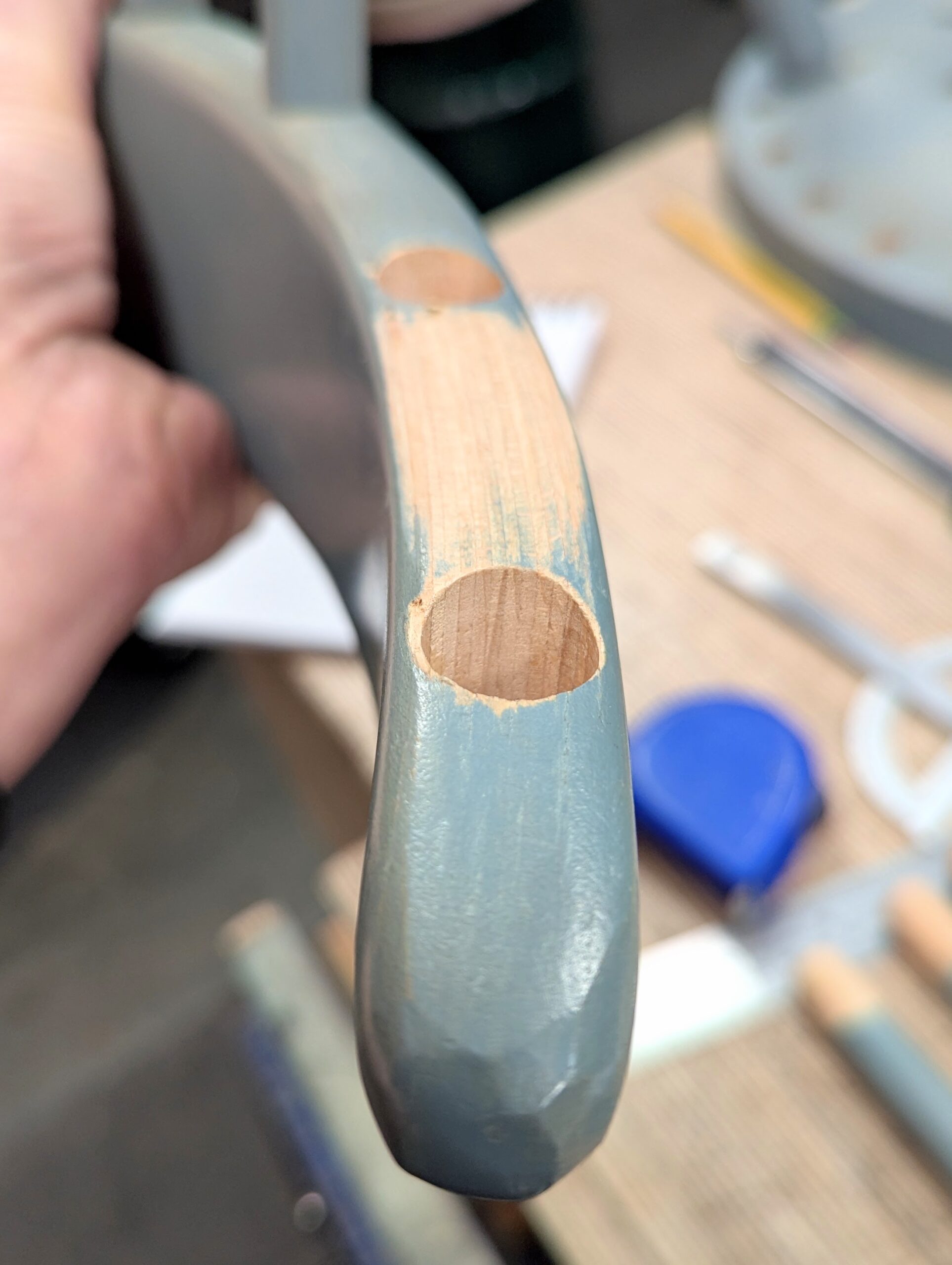Knocking the comb (the top back rail receiving the spindles) off the rails with my chisel hammer was straightforward enough, nothing really held much of anything, four turned loose with no effort and a single tap, the middle three were fairly secure, but I didn't need them to come out if they didn't wholly volunteer. The dowels into the top rail were stopped at equal depths of 3/4" even though the underside of the rail was curved upwards to each side. The dowels into the seat were through dowels. I could see saw kerfs underneath before I dislodged them, but no wedges or any other securement. I immediately surmised what had happened. Over the years of mass assembling the same chairs day in, day out and over many years, shortcuts were taken. Passing it on to next generation assemblers would confirm it as a technique rather than flawed workmanship. Eventually, the assemblers cut 95% or even more of any actual gluing anywhere to the joinery but knew where to apply sufficient at points to ensure it lasted long enough to go beyond the guarantee date. That meant minimal squeeze out for cleaning up after glue up but, also, dead sized holes with dead sized dowels in a row of seven would be difficult or slower to insert. The saw kerf meant the dowels would slip in easily and would be secured after passing the saw kerf ed area as they levelled out at the waist point where the saw kerf ended just below the sight line after insertion.
