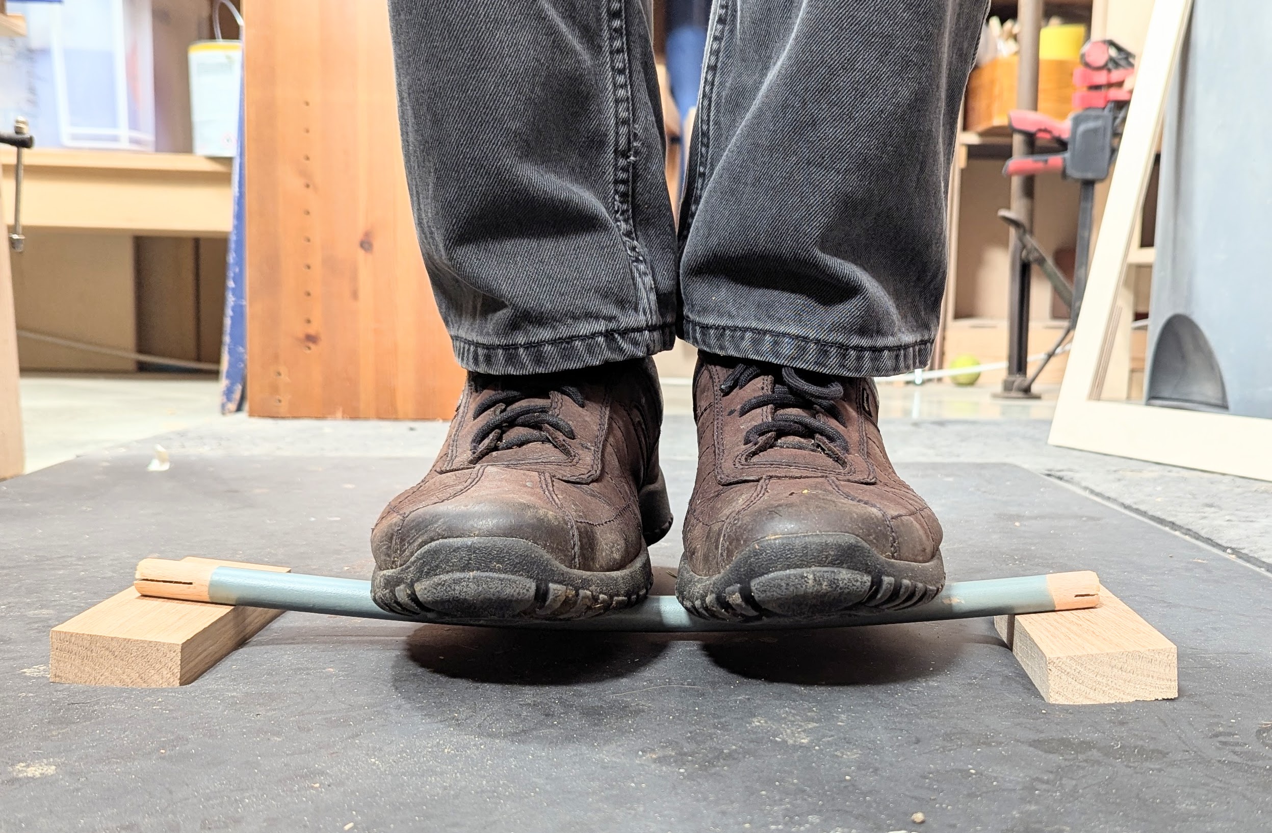 . . .but before I did, I did a little more testing of my own. Nothing like mechanical break-testing for your own knowledge. Here are my 75 kilograms (165 lbs) on the centre of a single beech spindle 5/8" in diameter for my at-the-bench test.
