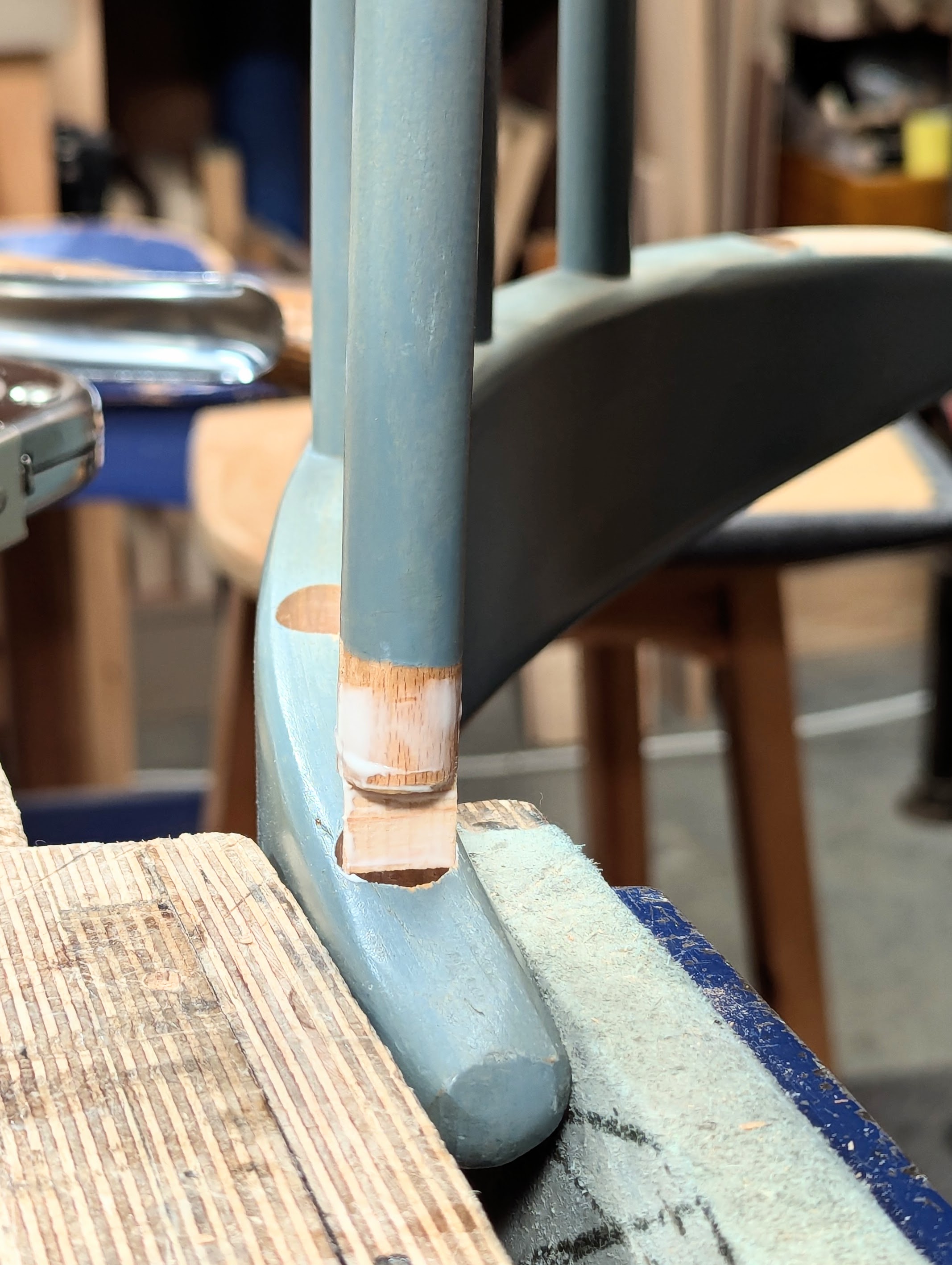 The front posts remained unwedged and never were they wedged to begin with. Notice also the two air-driven pins through the seat into the top of the leg. Security against coming out but not too much.