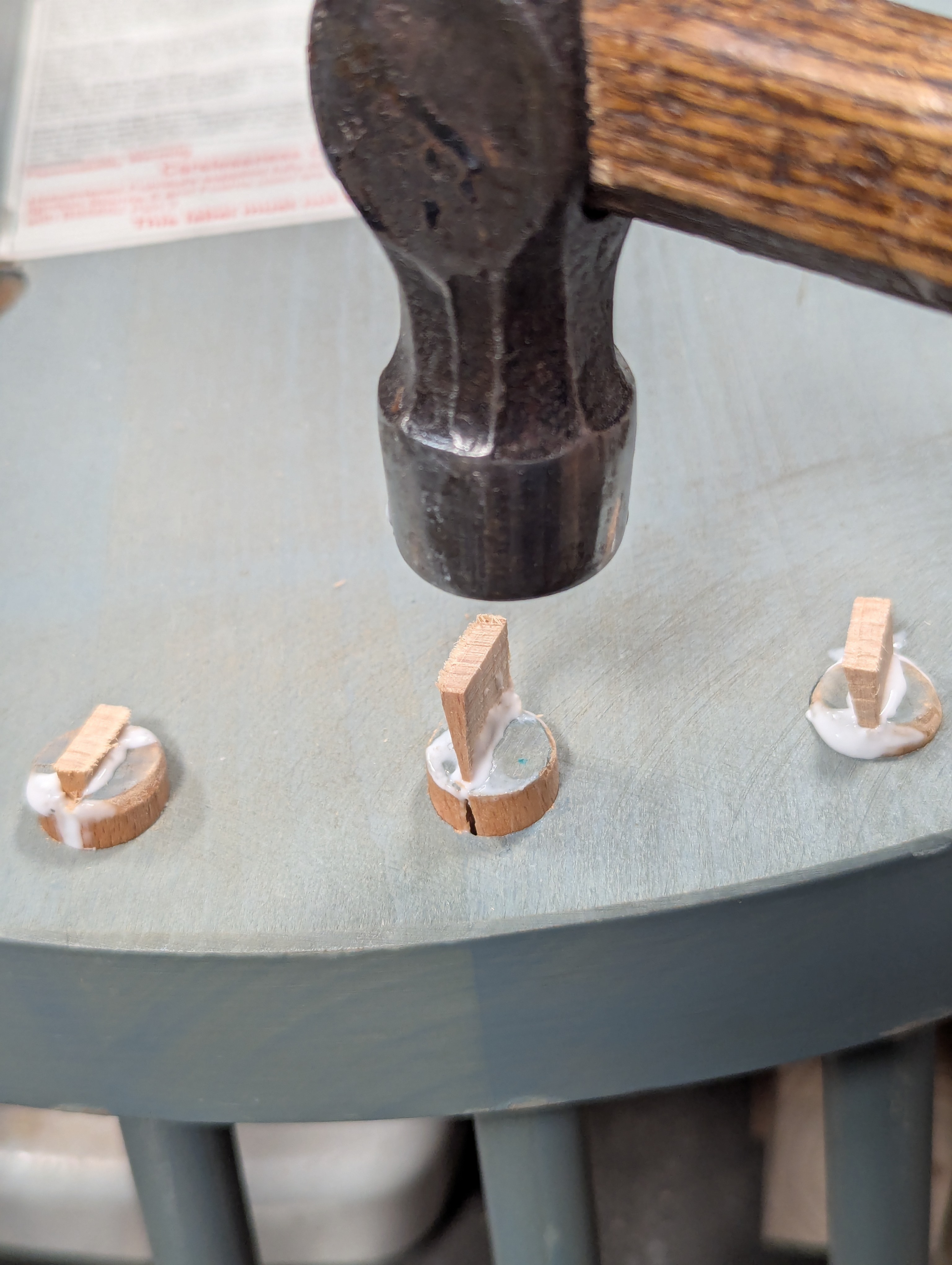 My renewed work necessitated cutting wedges and using fox-wedging because of the non-through aspects of some of the joints. This was ideal for applying pressure until the glue dried the ends in their expanded condition, but also gave permanent pressure to the tenon long-term in the holes.