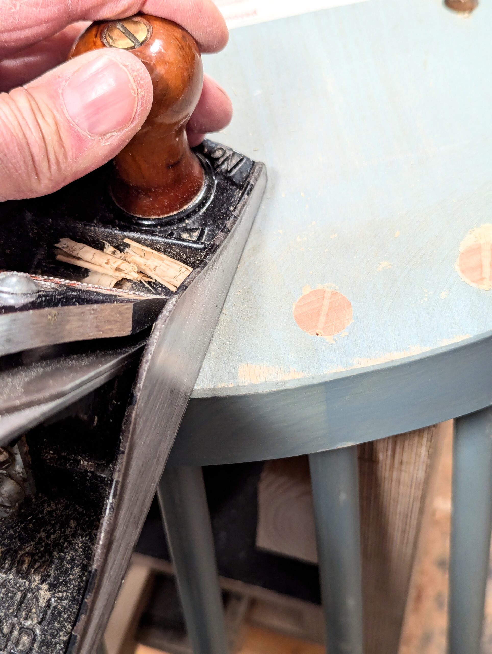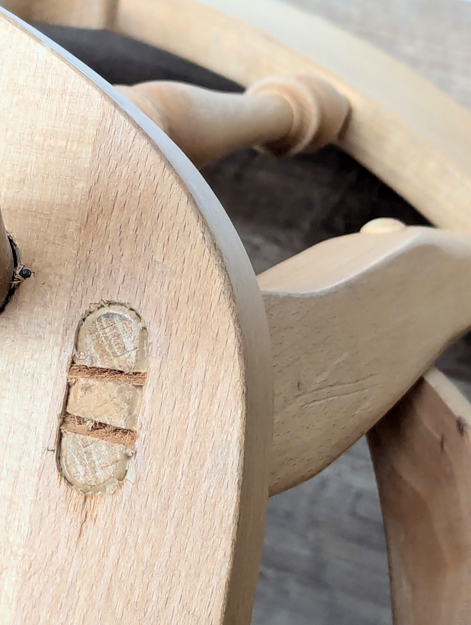 Obviously, the issue with all of the joinery on this beech chair was shrinkage. In times past, this was taken care of with a tapered hole receiving a correspondingly tapered tenon. On my chair, removing the leg, cutting out the existing wedge, deepening the saw kerf, would allow new wedging as the shrunken leg tenons would readily expand via the wedges and the glue, having swollen the surface fibres in the hole and on the leg, would give good adhesion. Would I return the screws to the legs? There would be no reason not to.