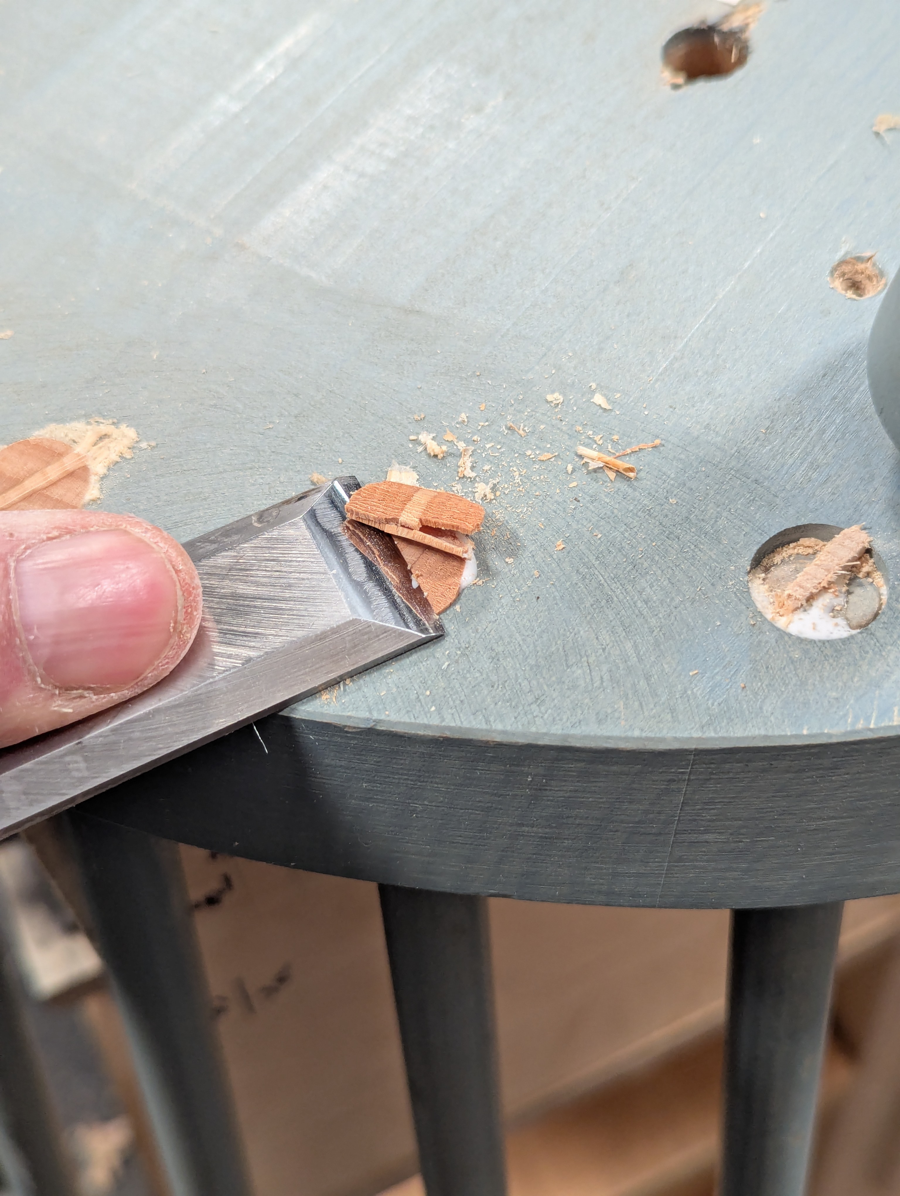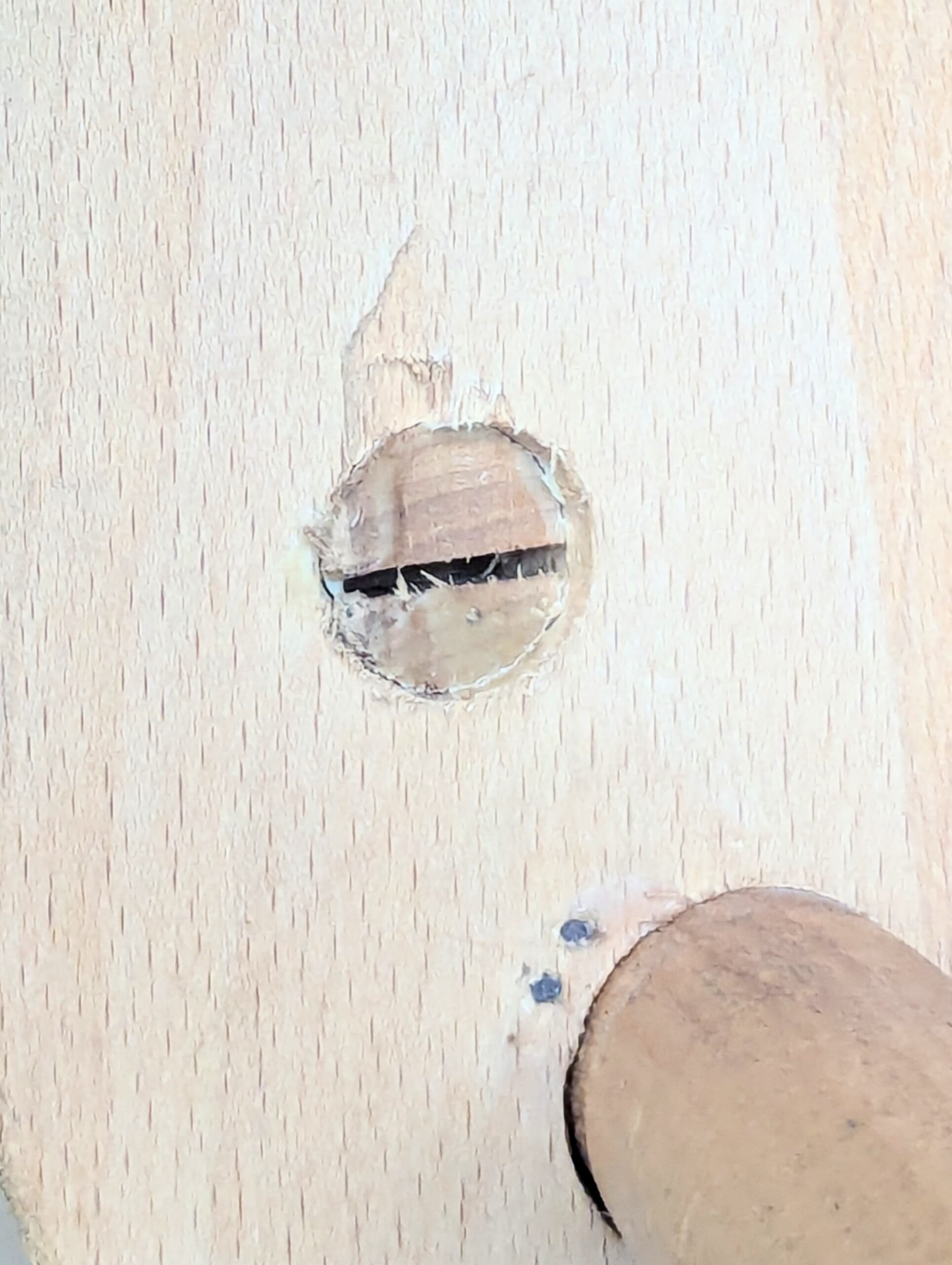 The saw kerfs on the bottom through-tenons were the wrong alignment with regards to the grain orientation of the seat, but beech being beech, I had no problem driving the wedges. Beech has tenacious grain and resists splitting as other woods might.
