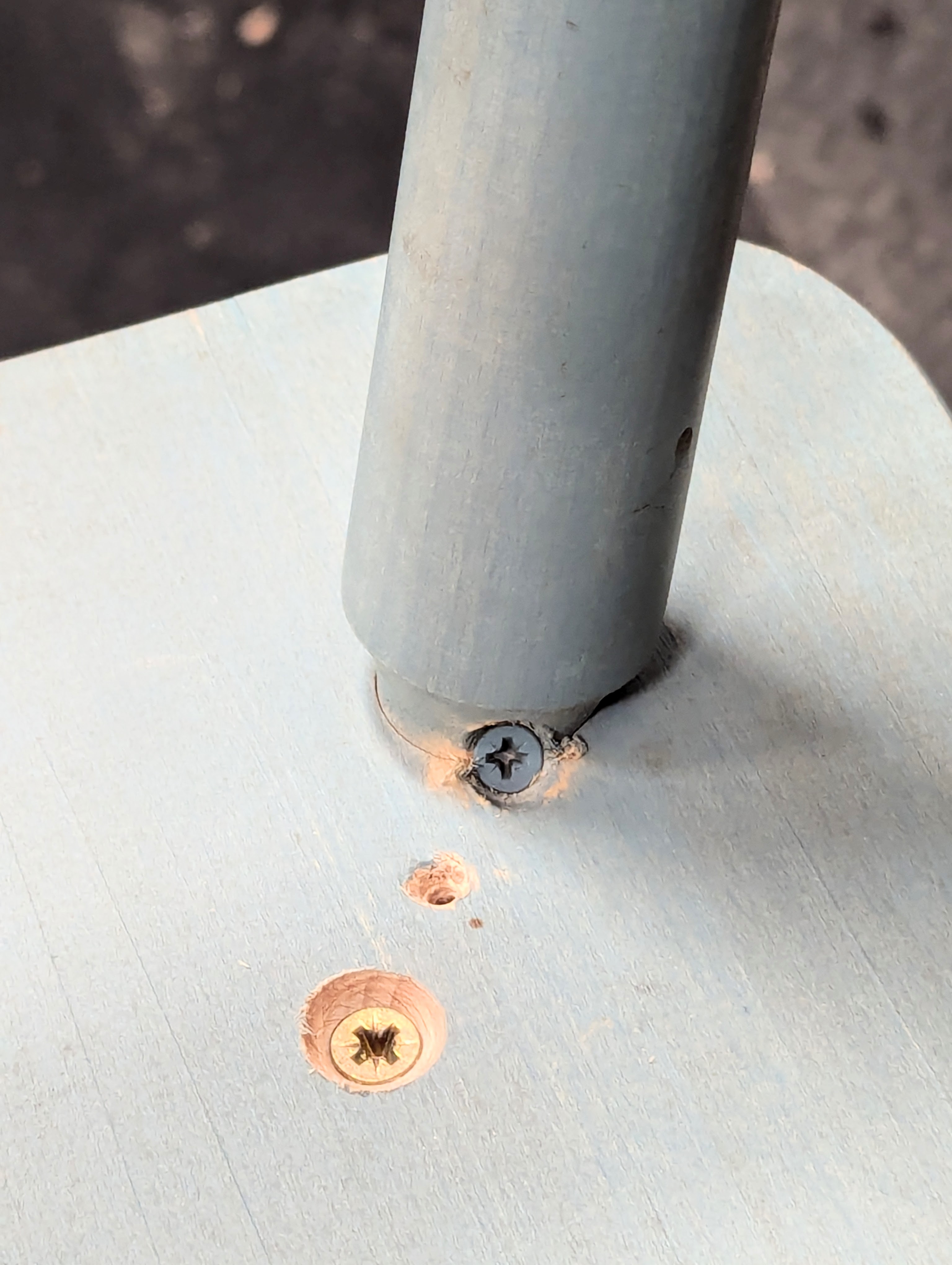 The legs felt quite secure. Were they? I used a hammer under the seat to see if they moved. They didn't. A screw by the joint told me there might be an issue somewhere, though. After removing the screws and giving a single tap to each adjacent spot by the seated legs, the legs came out of the holes despite the wedges from the topside of the seat beneath the padded panel.