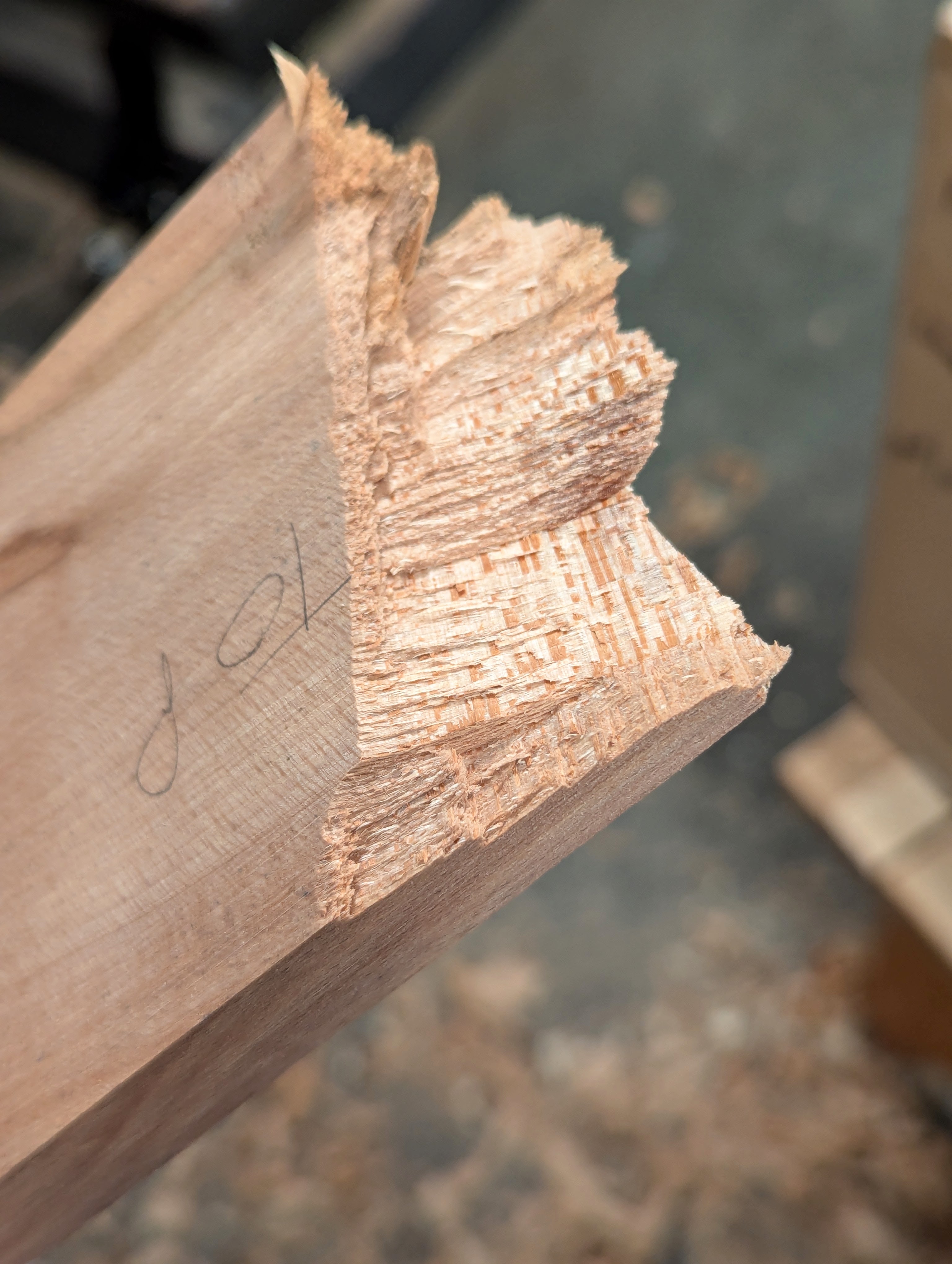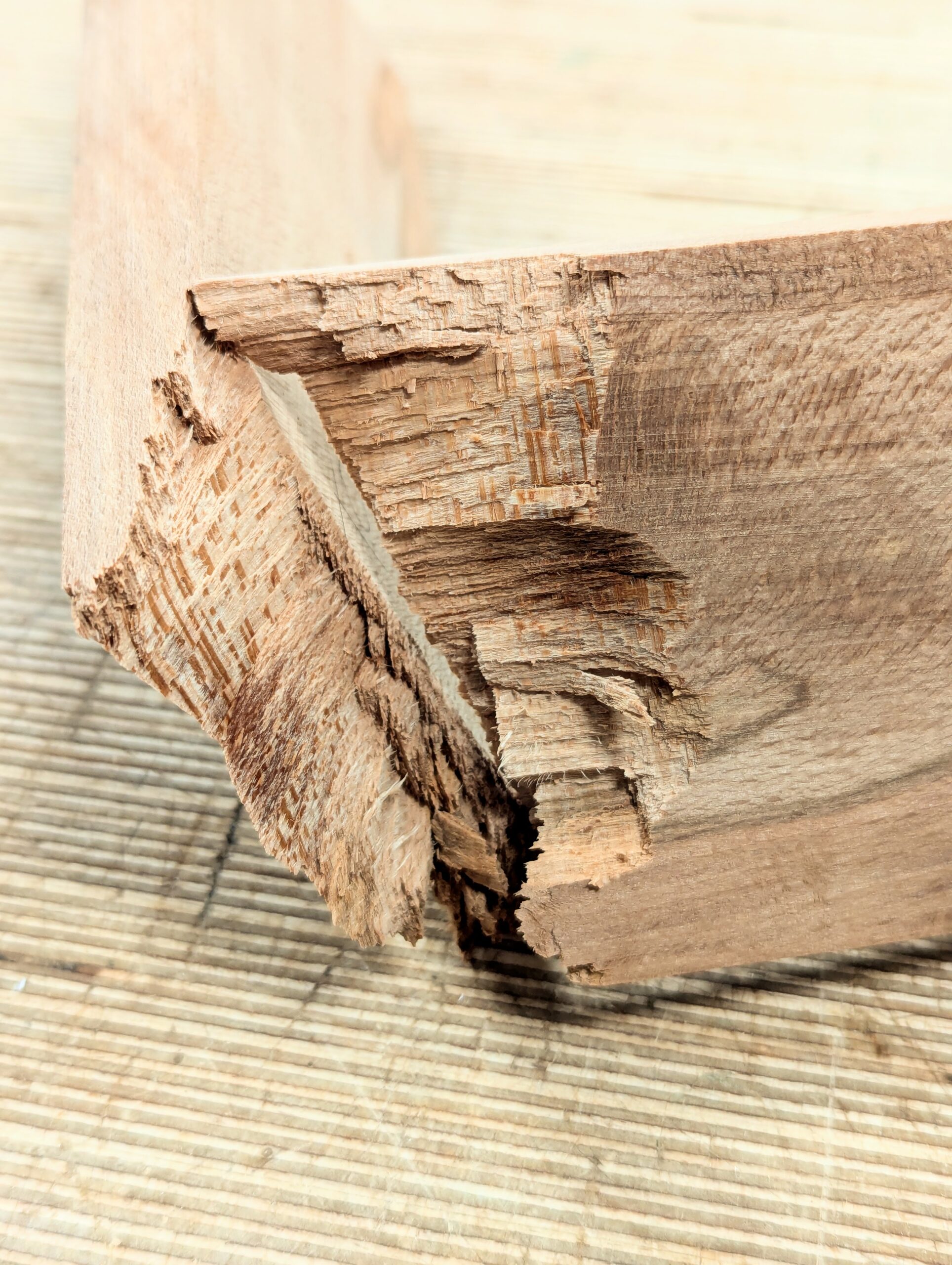 So, now, looking at the same problem (same break) from a different perspective, I get a different point of view. Looking at the grain on the two, flat outer planes but three-dimensionally, there is a lot going on here. Looking at these two facets without being able to see inside the wood before now, it's obvious that not one ounce of this wood has any straightness to it. The tectonic plates would totally disallow my intent in this specific piece of wood. Hardly any of the grain is torn as such, but it simply parted along the diverse grain directions within the fibres. Can I apply a branch of geology outlining a planet's crust, like the earth or the moon with their formation of folds and faults, to my wood? Of course, I can. It's not geotectonic geology working with rocks, but the significant likeness is possibly there to explain an otherwise difficult-to-explain concept.