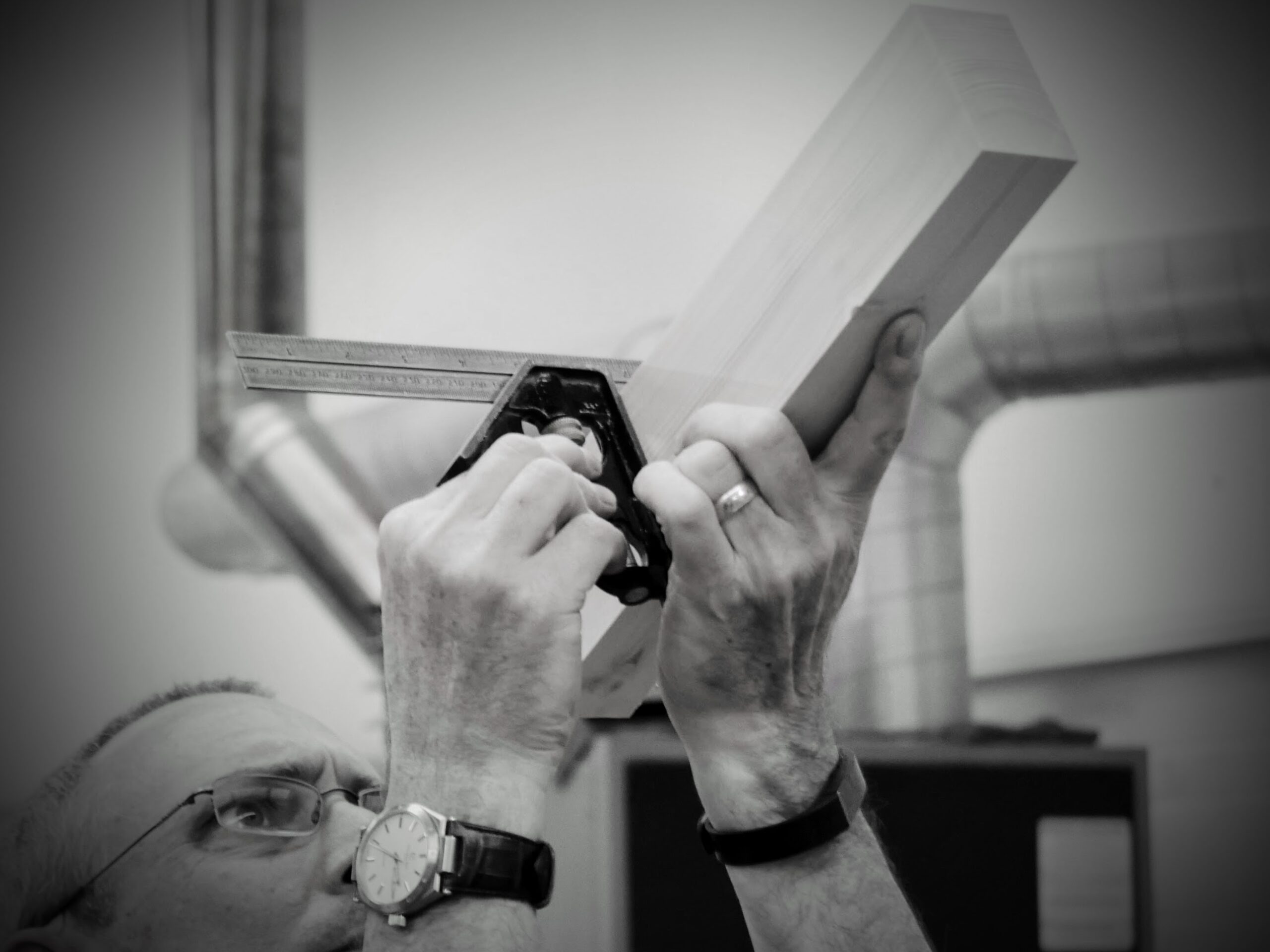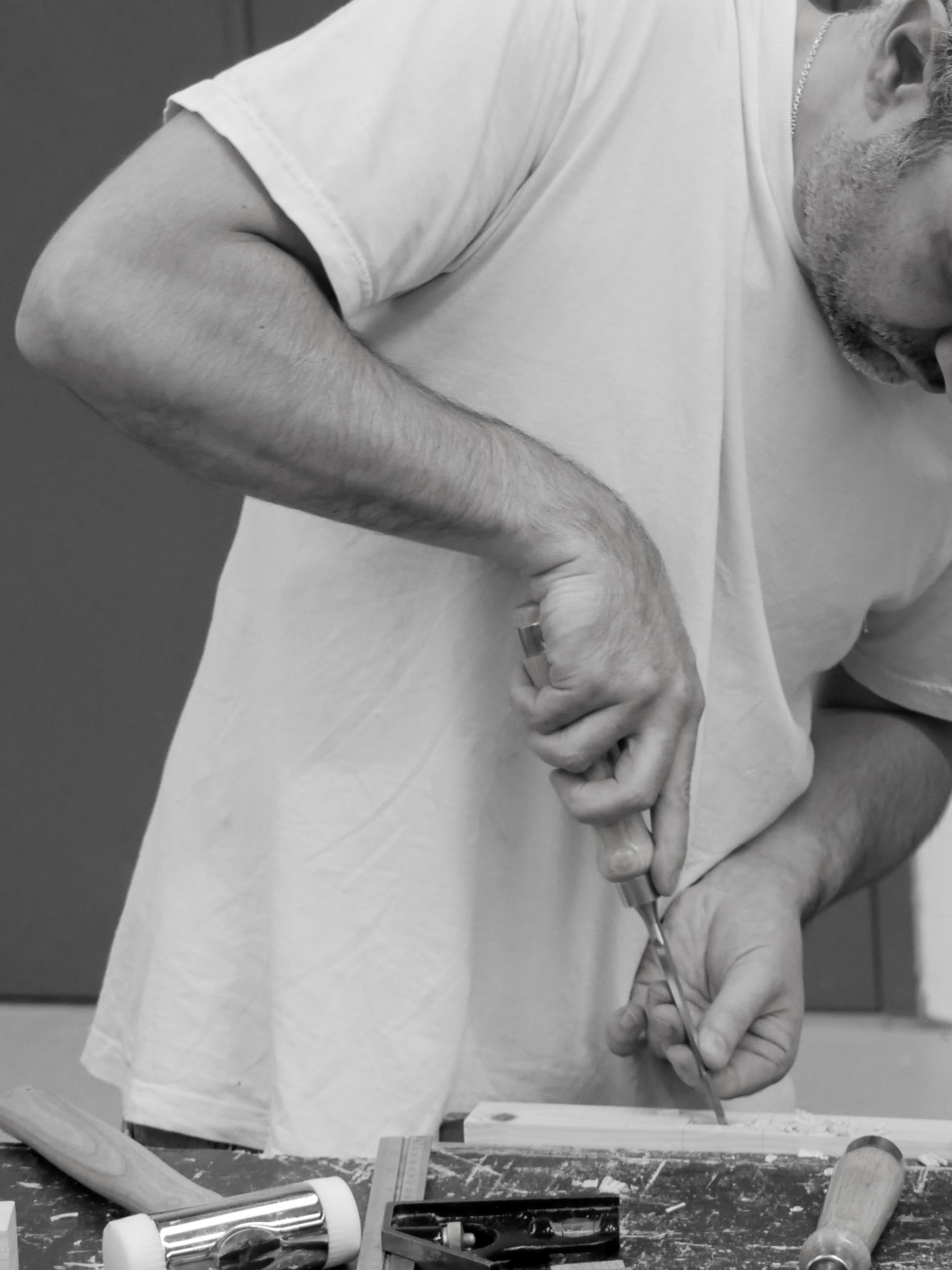 There is more to changing tactics than meets the eye, and it's this that most woodworkers fail to grasp. In a business world, the way of getting things done is whatever goes the fastest and delivers the best quality finished product at the best or most appropriate cost. Usually, working wood as we do, in the way we do, makes it woodworking rather than machine making. The outcome is not only the finished product, but more or most importantly about the whole process from beginning to end in all of its various stepped and staged processes we actually choose for ourselves to use. By this, we can all the further improve much more of our making life in every sense of our working the creative spheres of making. Once a machine is set up, identical replication results in repeat cuts according to the stops and starts on the fence or the flip-over stop along the sliding fence or table. Machinist may refer to a cut as a single cut, but, of course, they make a thousand cuts to our one. Pulling a lever or pushing the wood results in teeth and cutters stacked behind each other to make that cut. The cuts we make slice and pare, shave and sever in lowering pass taken down by a thousandth of an inch until we hit the knifewalls that keep the exposed corners crisp. We see by this that every single cut we make is in the control of our whole upper body engagement. Every single element of our whole body MUST engage in the work. Nothing, not one element, can be left out. Such hid demand becomes critical to our being and after a few months and years, it's intrinsic, as it should be, to our life making. We depend on it in the same way we rely on air for our breathing. This common work has become the uncommon and the extraordinary to most people machining wood because mostly they no longer do such things. In the machine processes using mass-making methods, there is only very minimal reliance on the steady handedness, and minute by minute redirecting to optimise the output of a cut. In machining wood, fences and presets align everything for mono-directional conversion, all of the energy is about ensuring nothing interrupts the passage into and through the cutterheads and blades. Our work goes far beyond the mere linear push and pull of it to flex and twist and distort our bodies to maximise the efficiency and accuracy of every single cut.