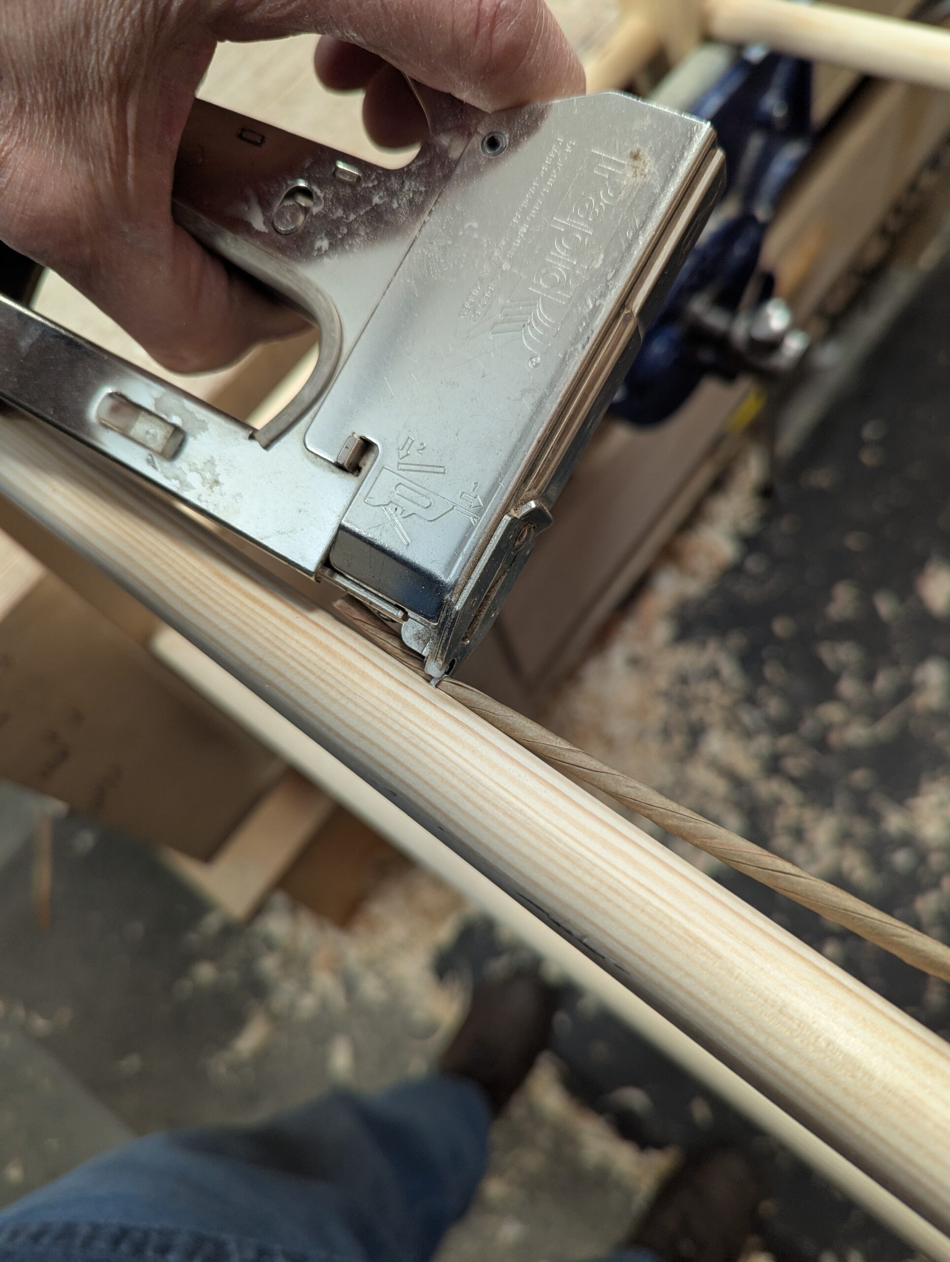 After stapling with one staple first, I added a bead of glue along the inside of the top rail as shown and stapled the cord a second time against the glue.