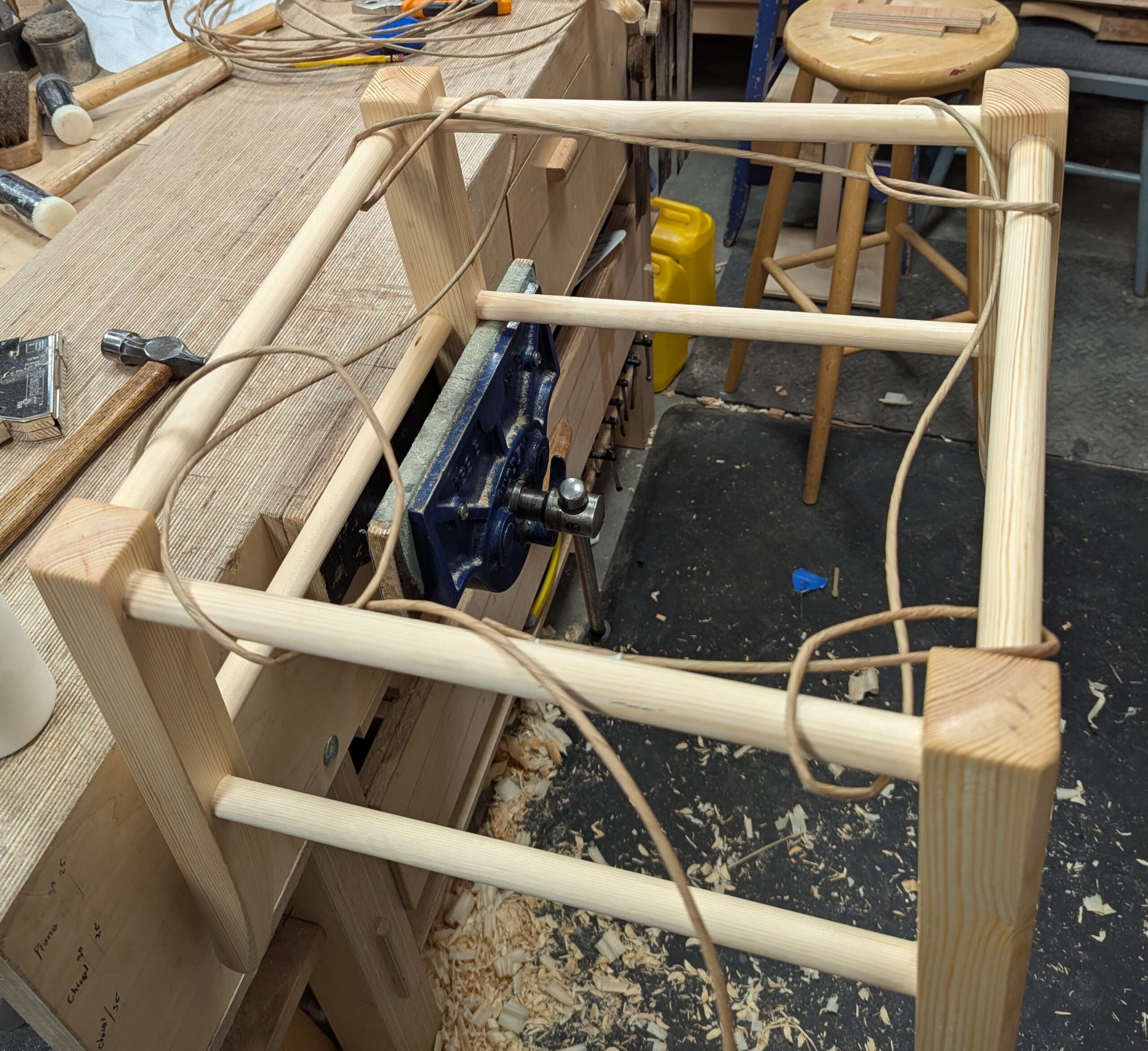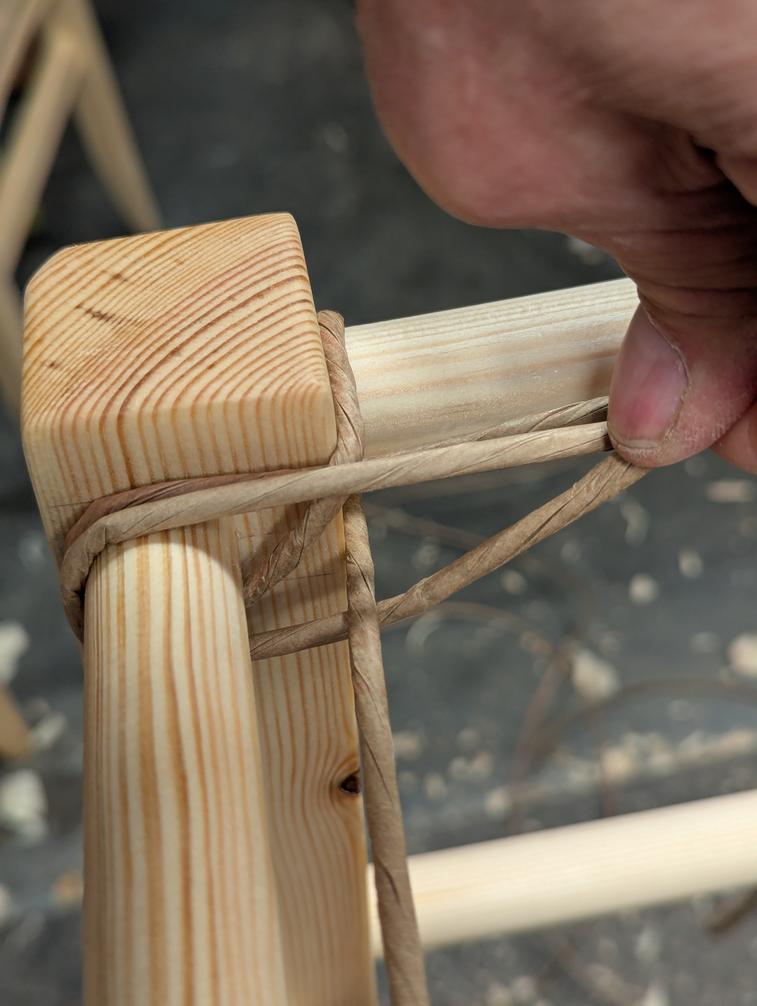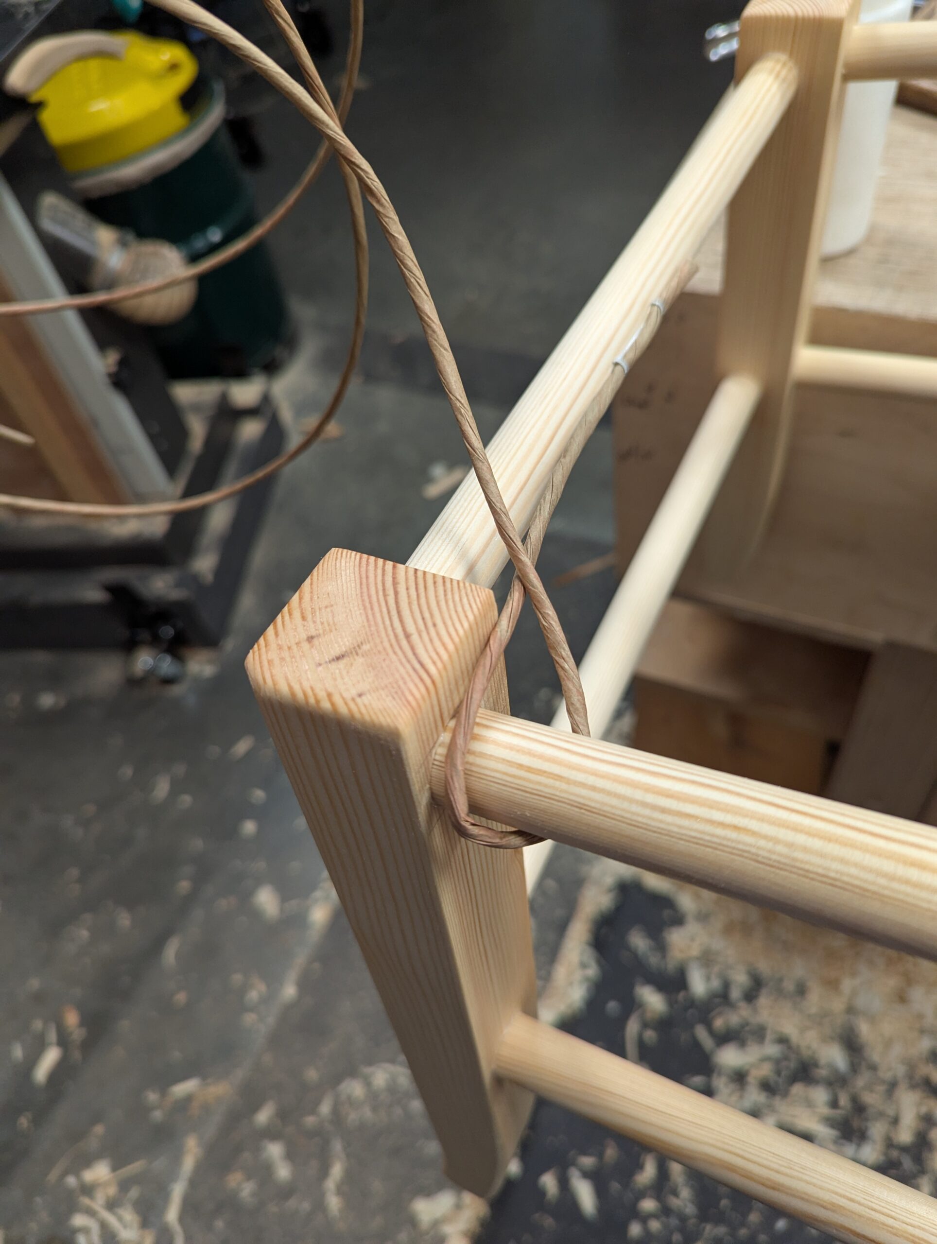 This first wrap repeats at each corner. You can pass the coil all the way around to enclose each leg corner, and then tighten the corners as you get to them. Use spring clamps to secure the strand as you go; this frees your hands to keep going while keeping tension on the corner wraps.