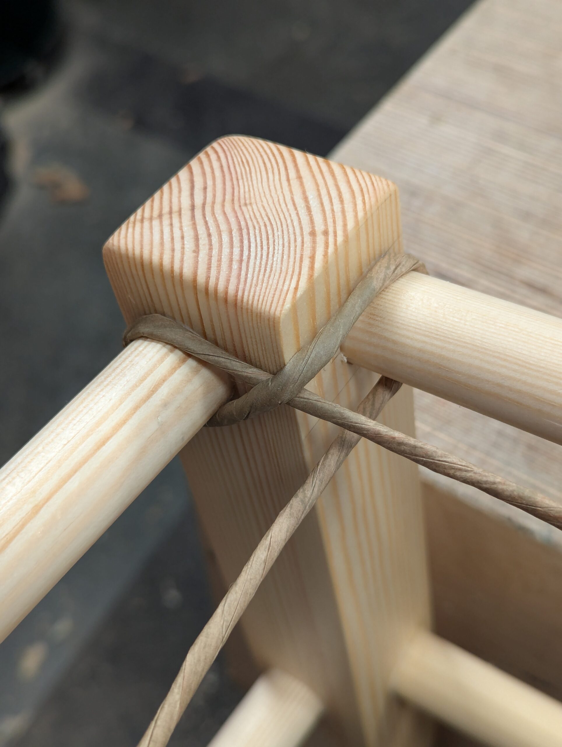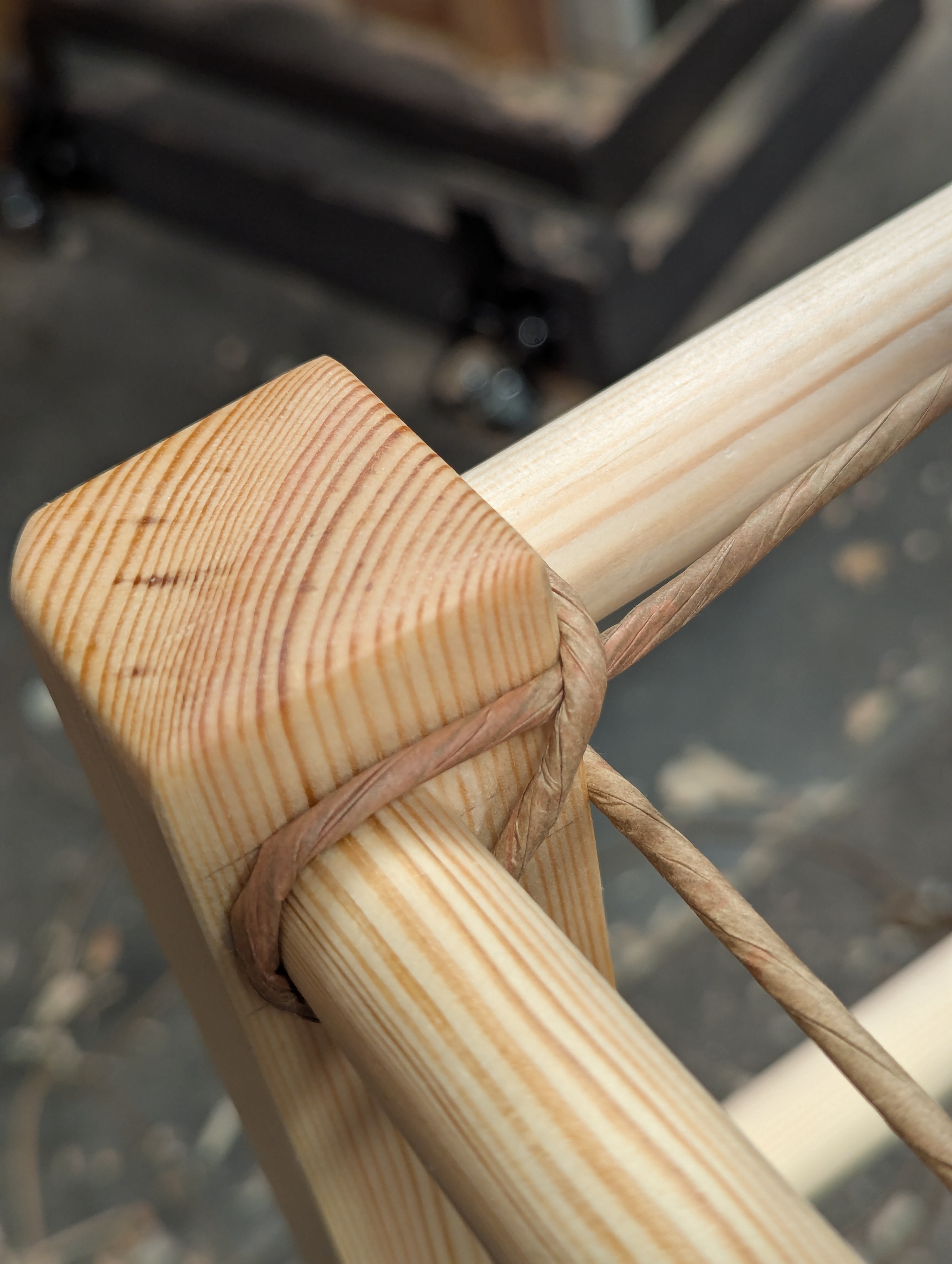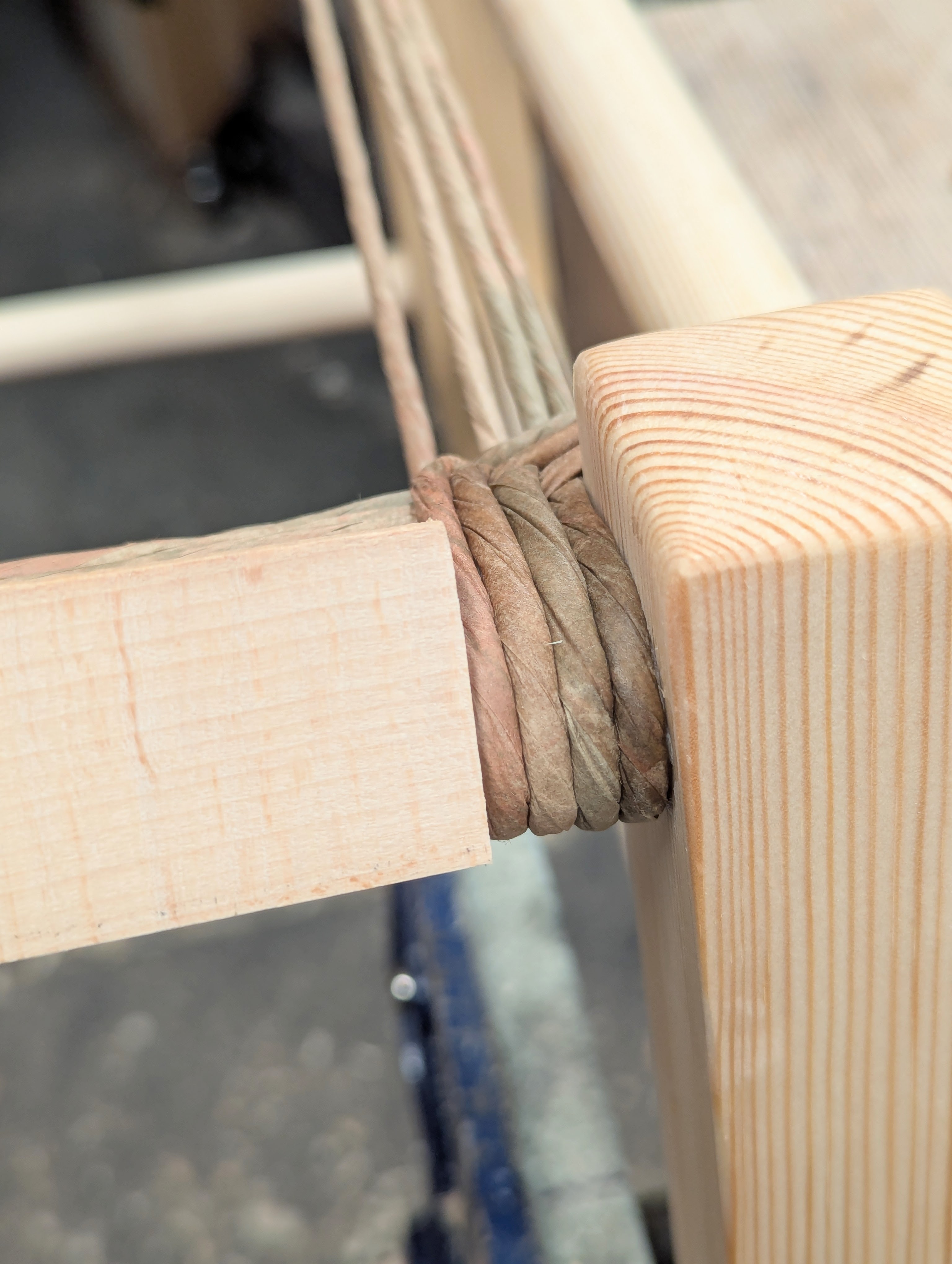 The second leg wrap after the initial anchor point wrap butts tight up against it, pulls the lower cord up and then wraps around the rail at top to pass underneath and across to the topside of the opposite rail.