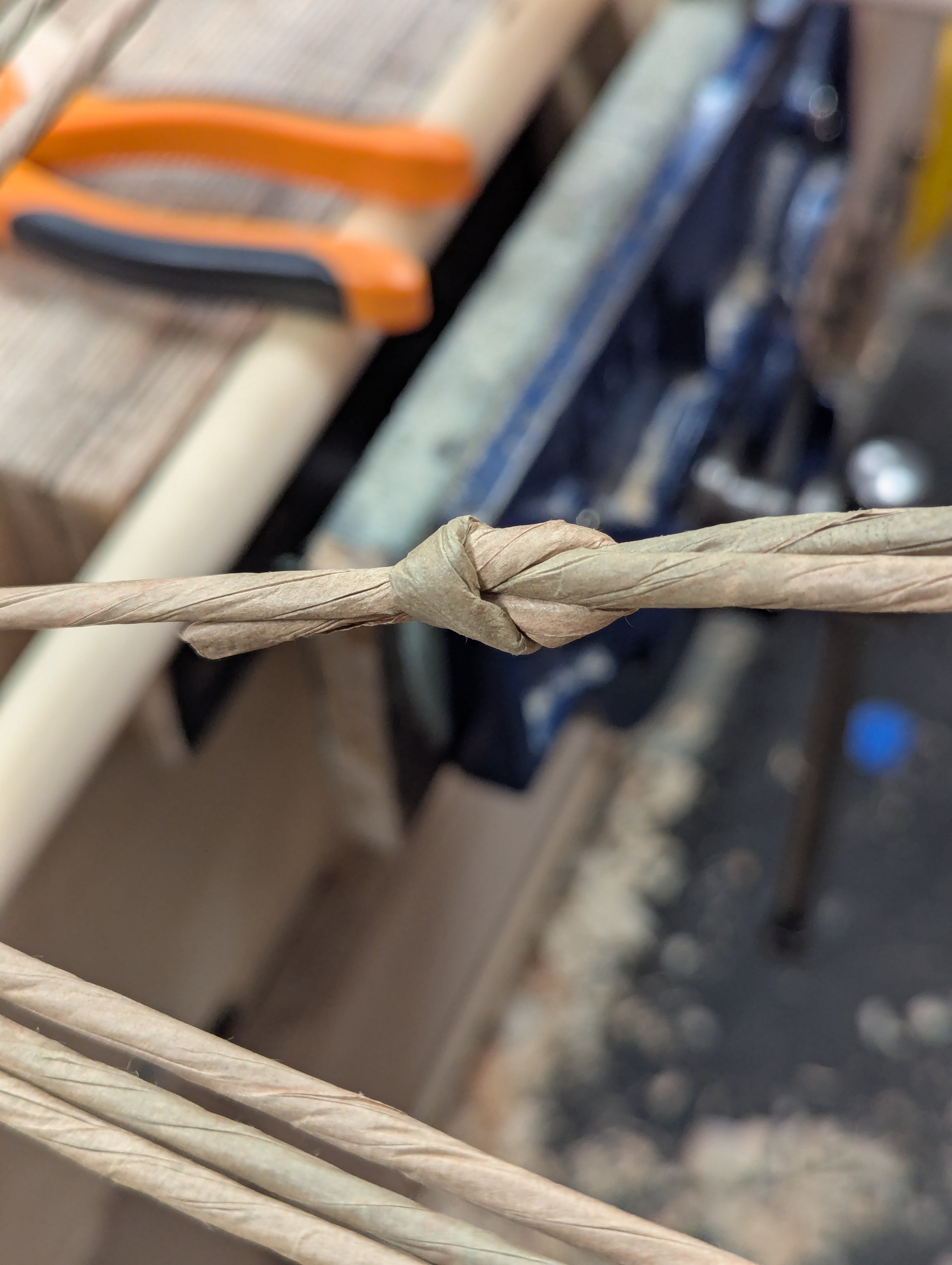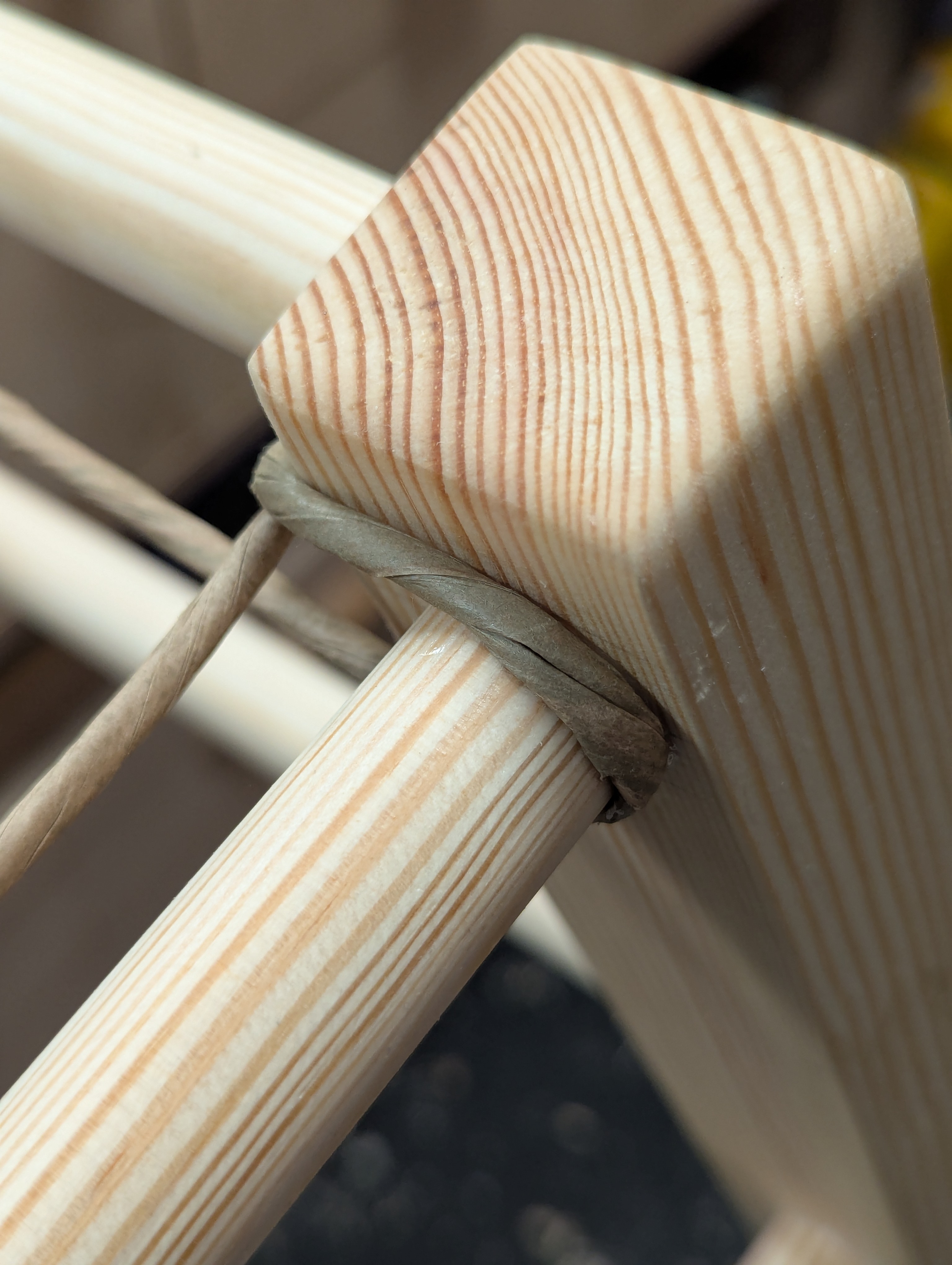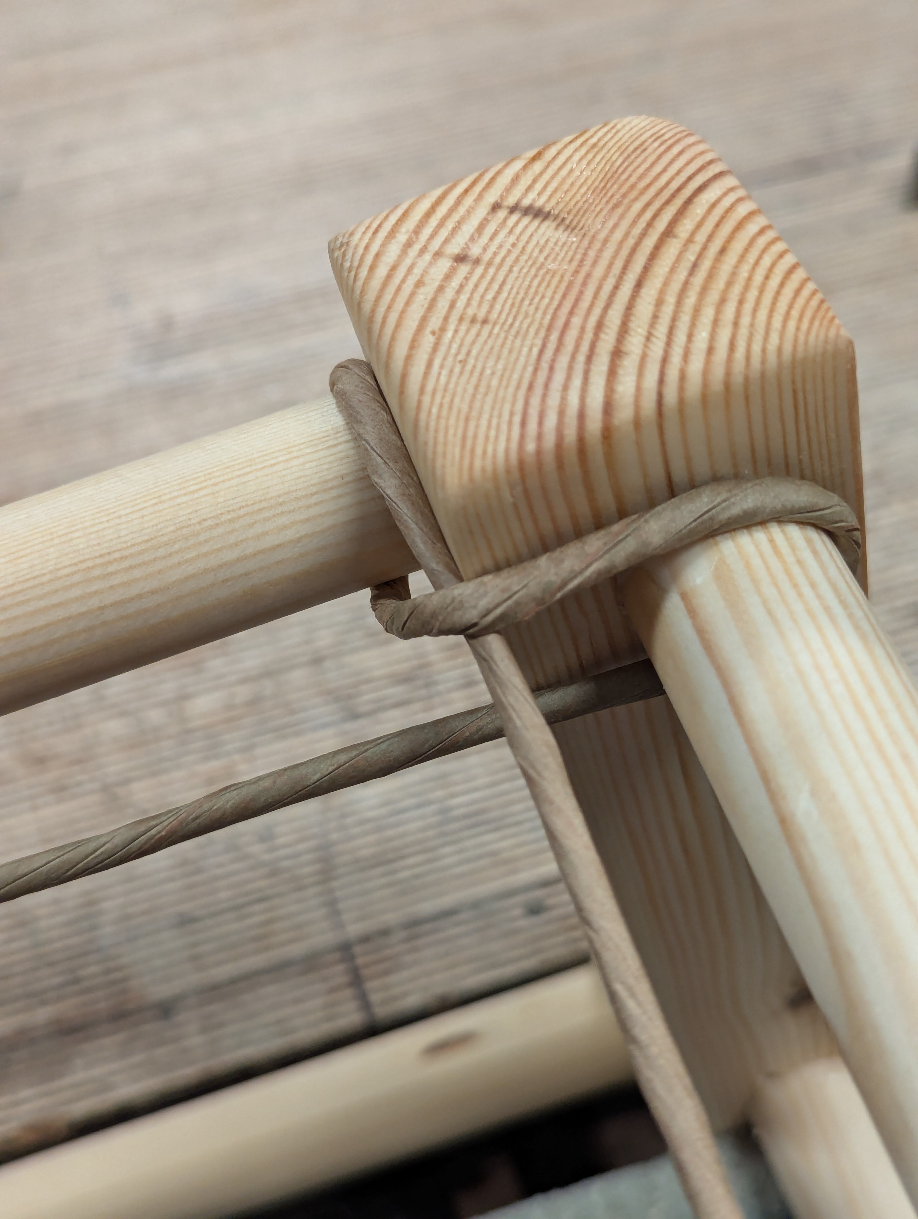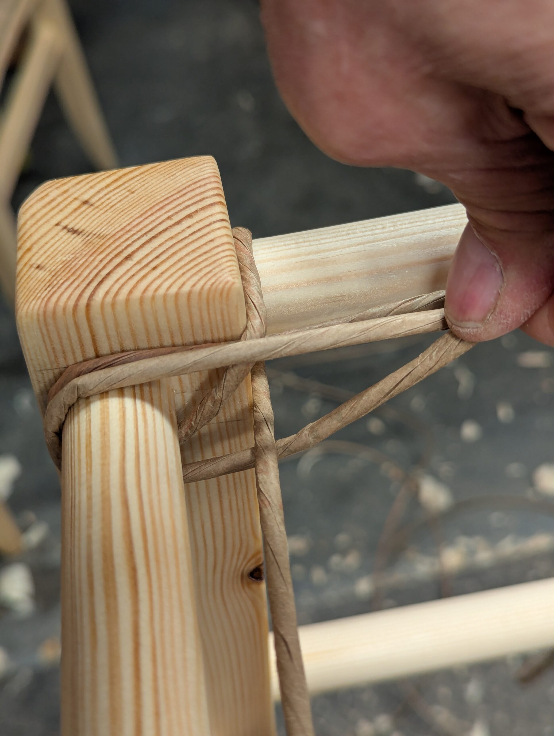 The second leg wrap after the initial anchor point wrap butts tight up against it, pulls the lower cord up and then wraps around the rail at top to pass underneath and across to the topside of the opposite rail.