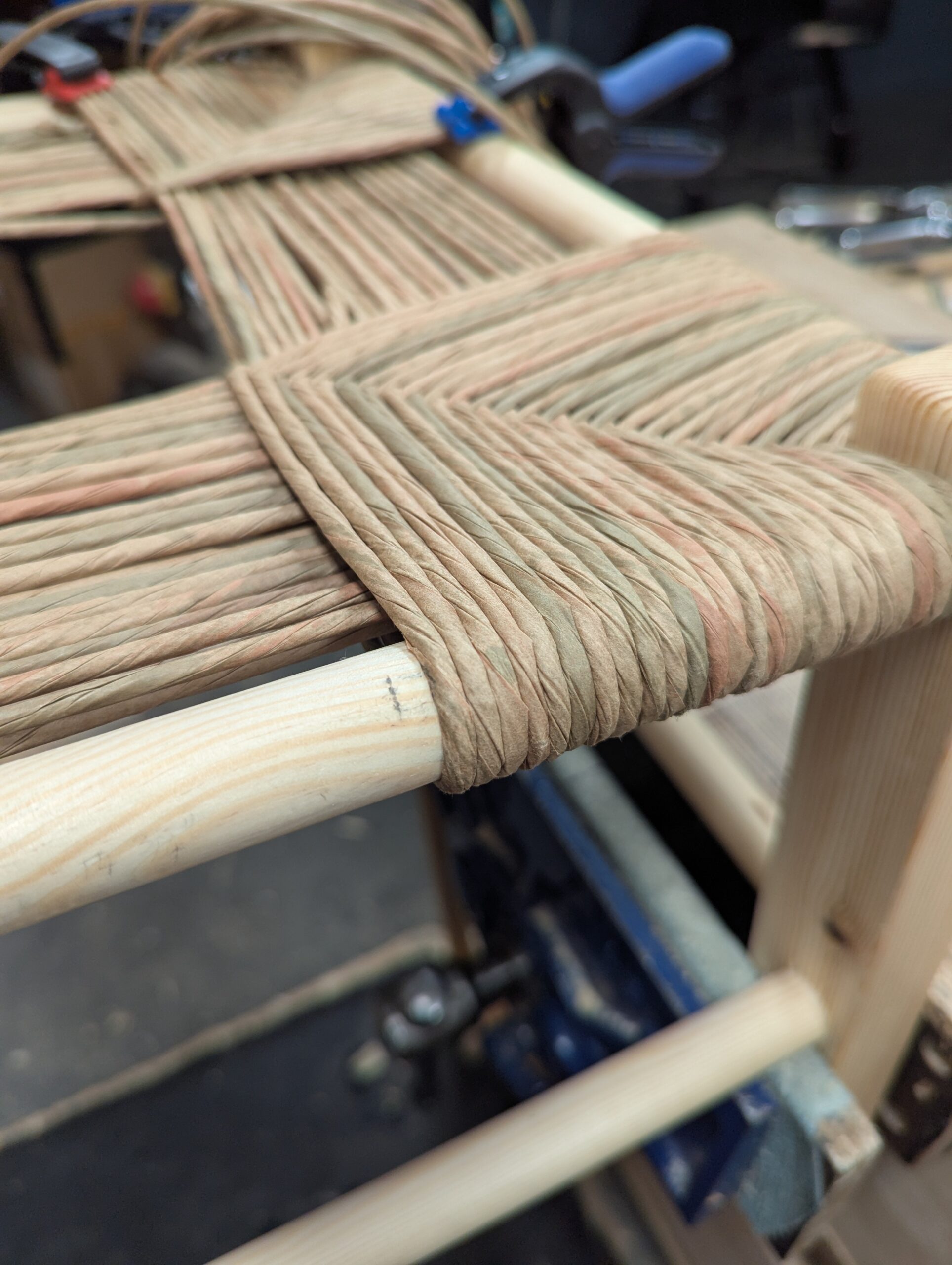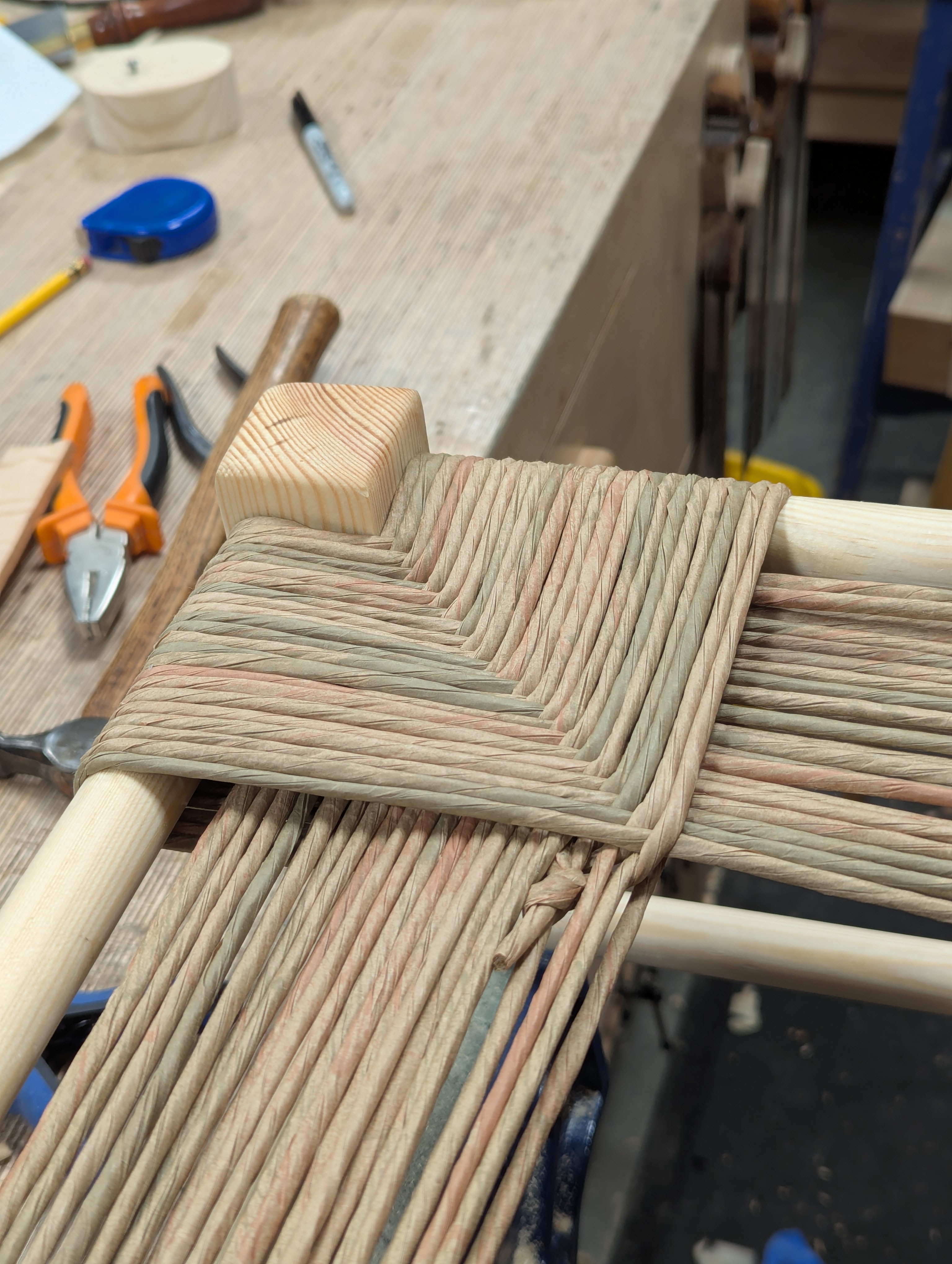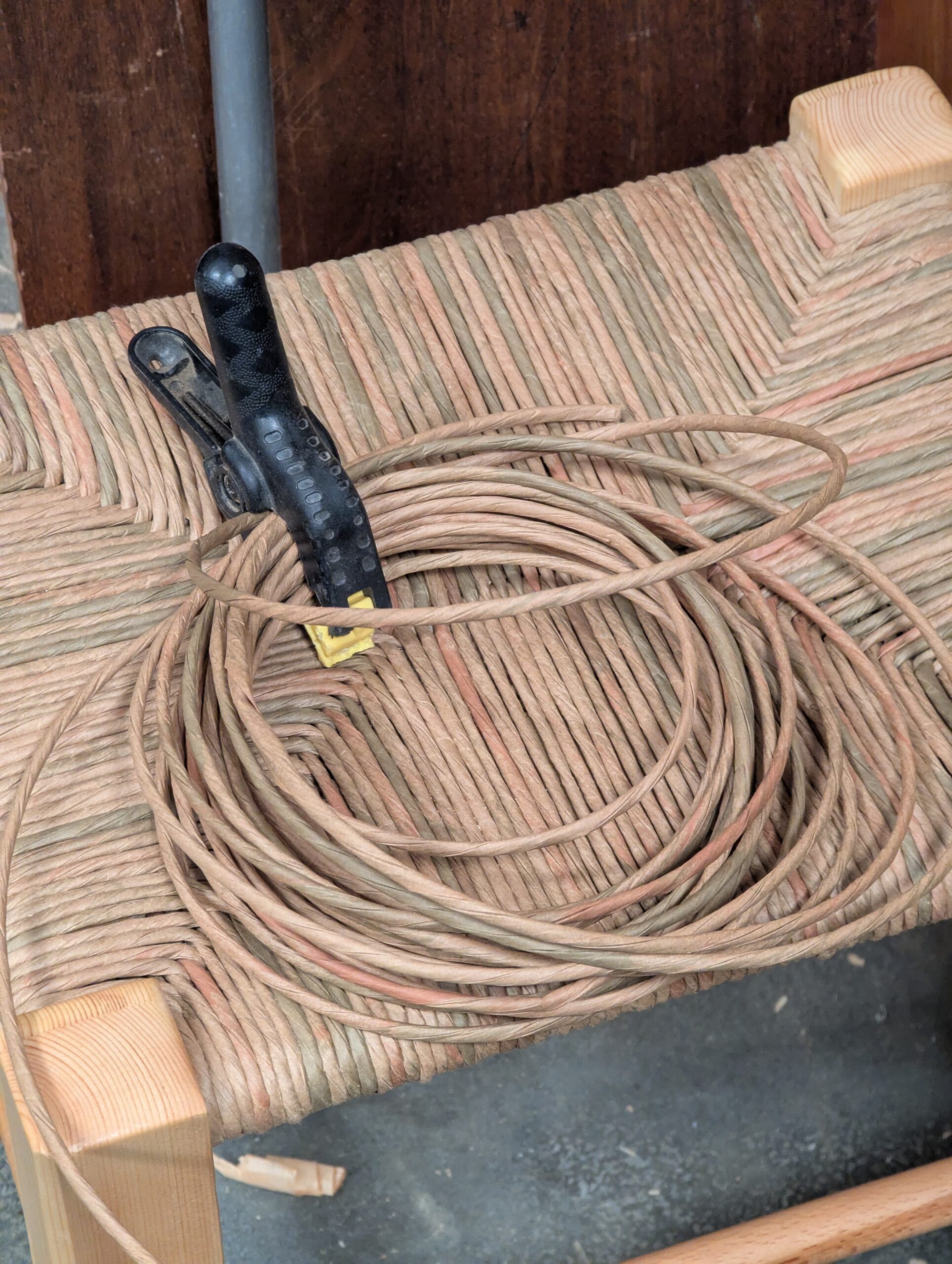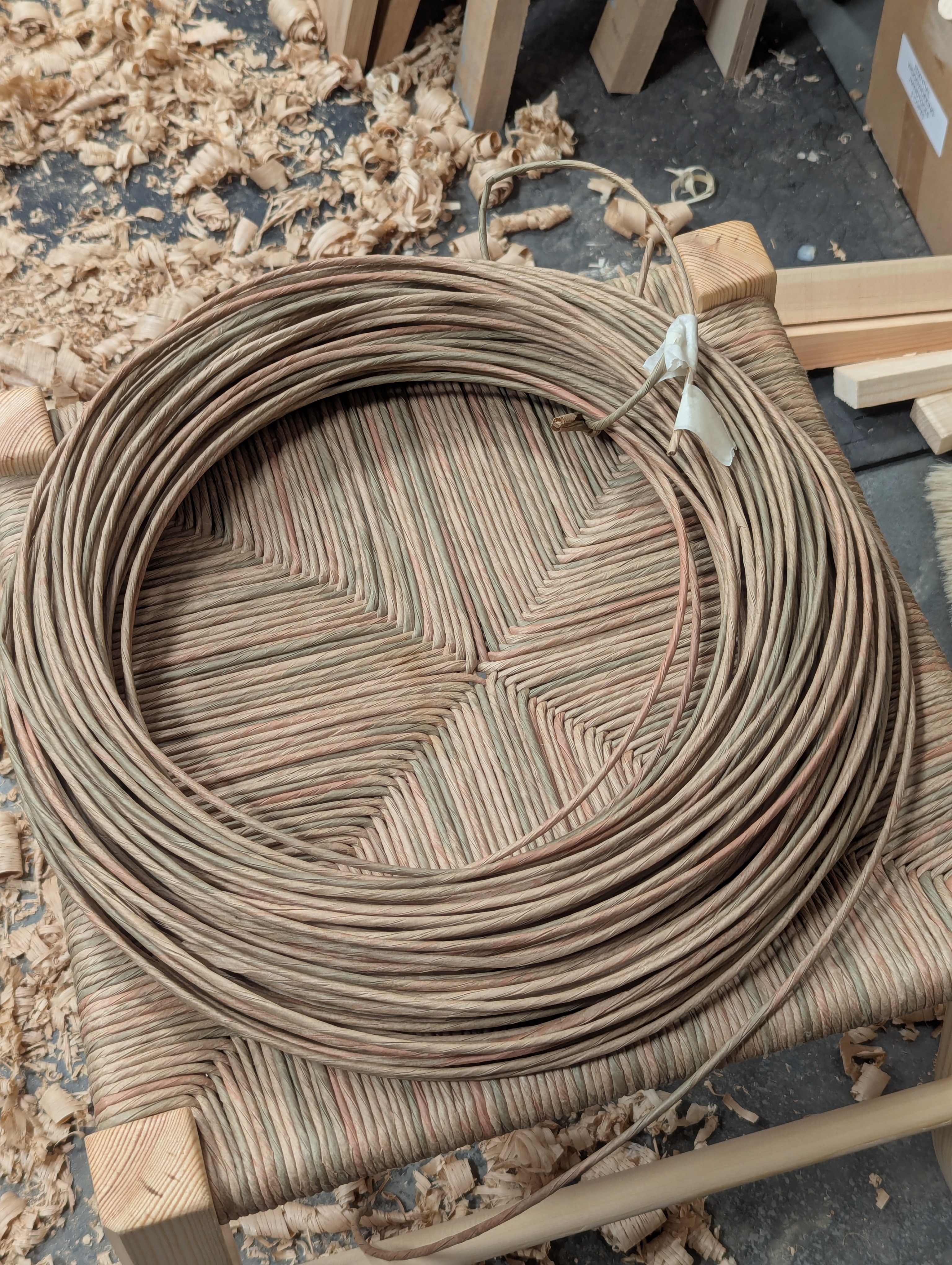 The material I chose is called Danish cord. It's made from three strands of brown paper; the first two are twisted together tightly and the third is a spiralled wrap. It's strong and durable and easier to weave than natural read. The outer is coated with a thin wax finish. You can further coat the Danish cord with shellac or hard wax oil. This darkens the appearance but adds extra protection.