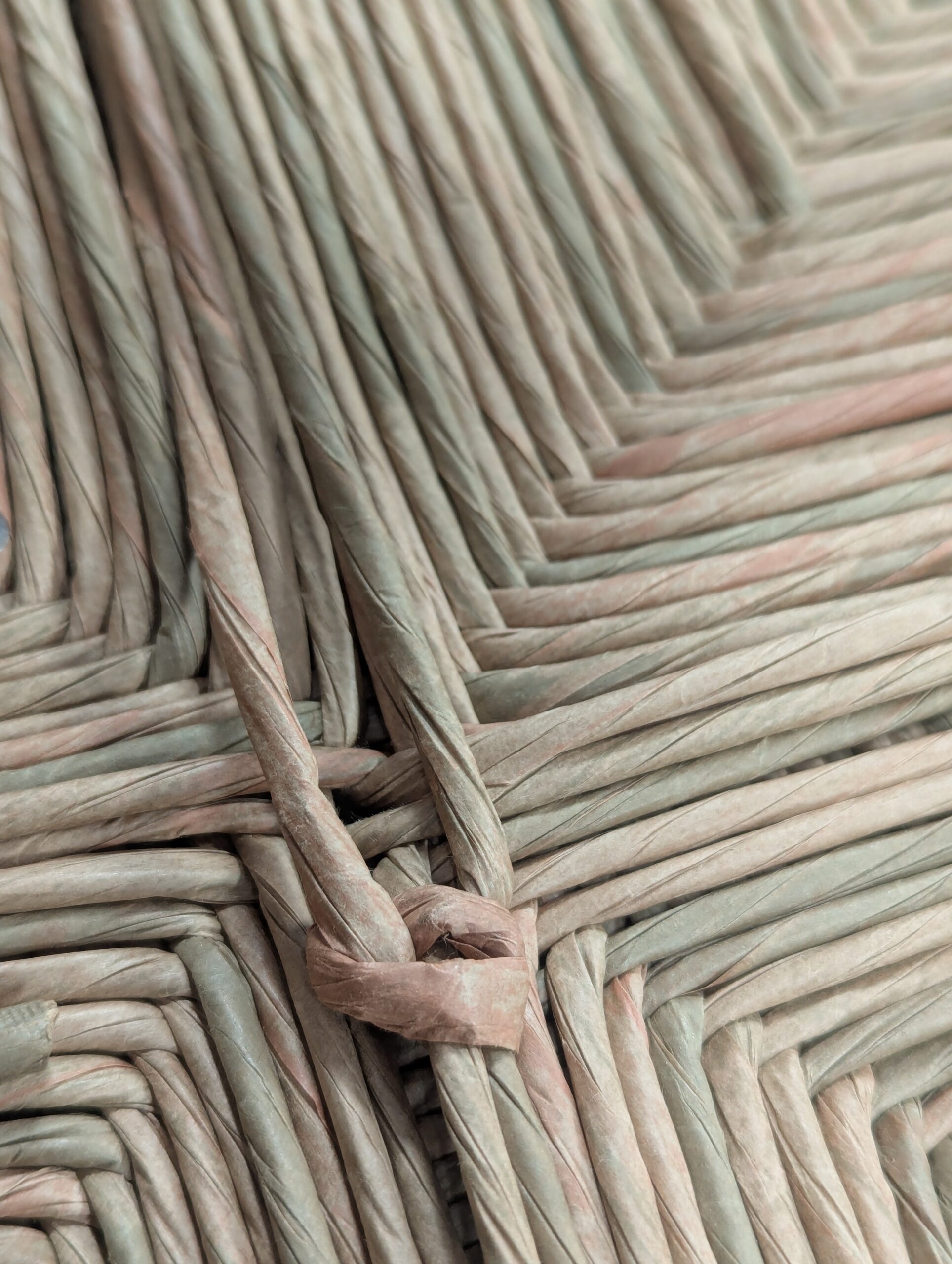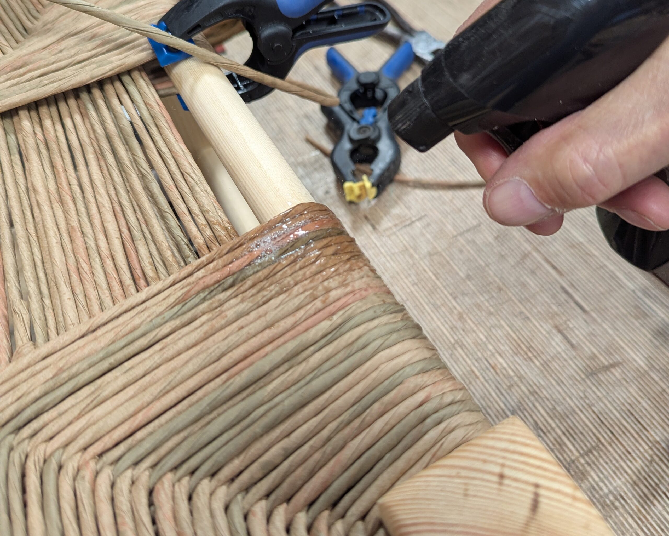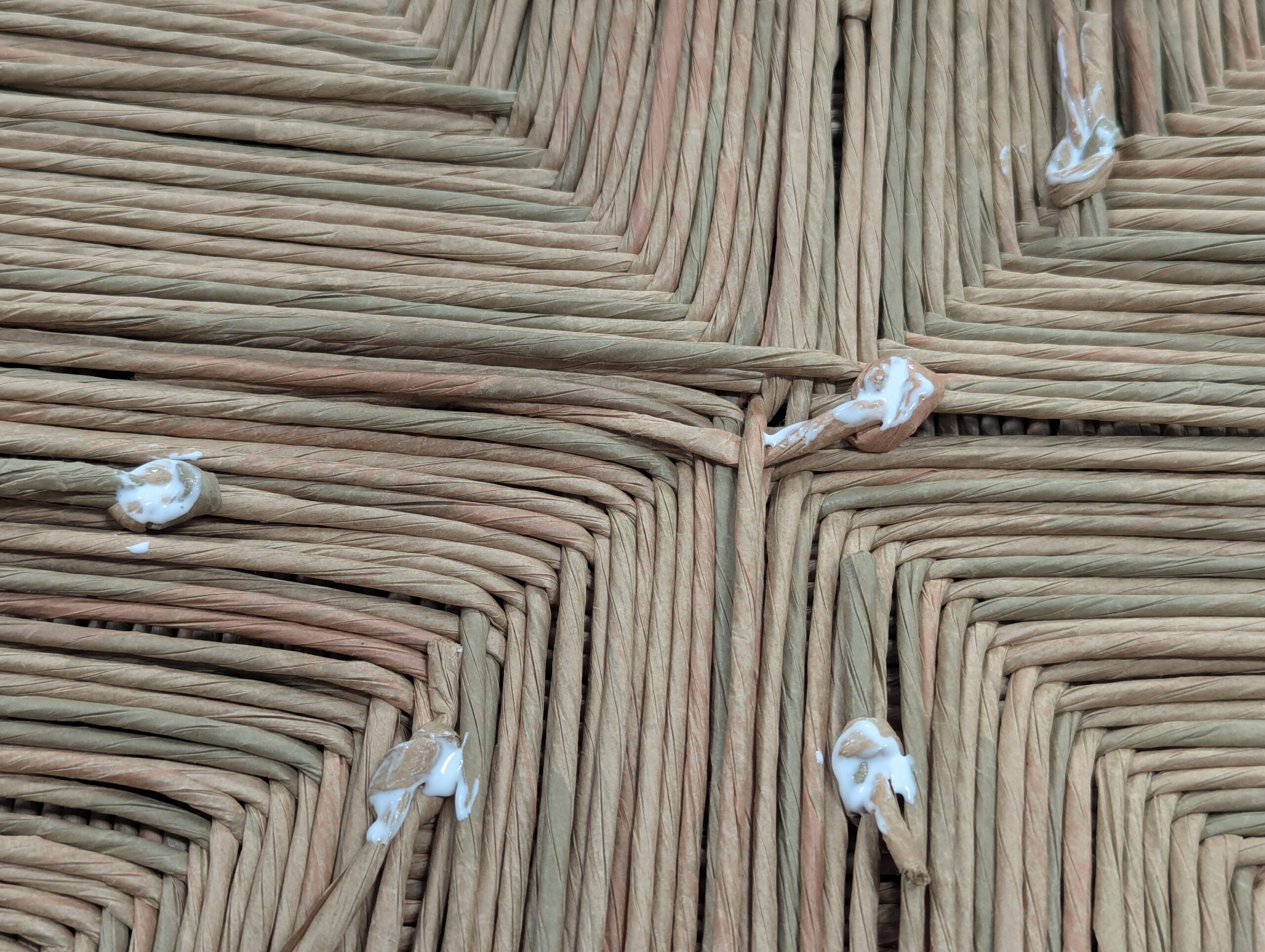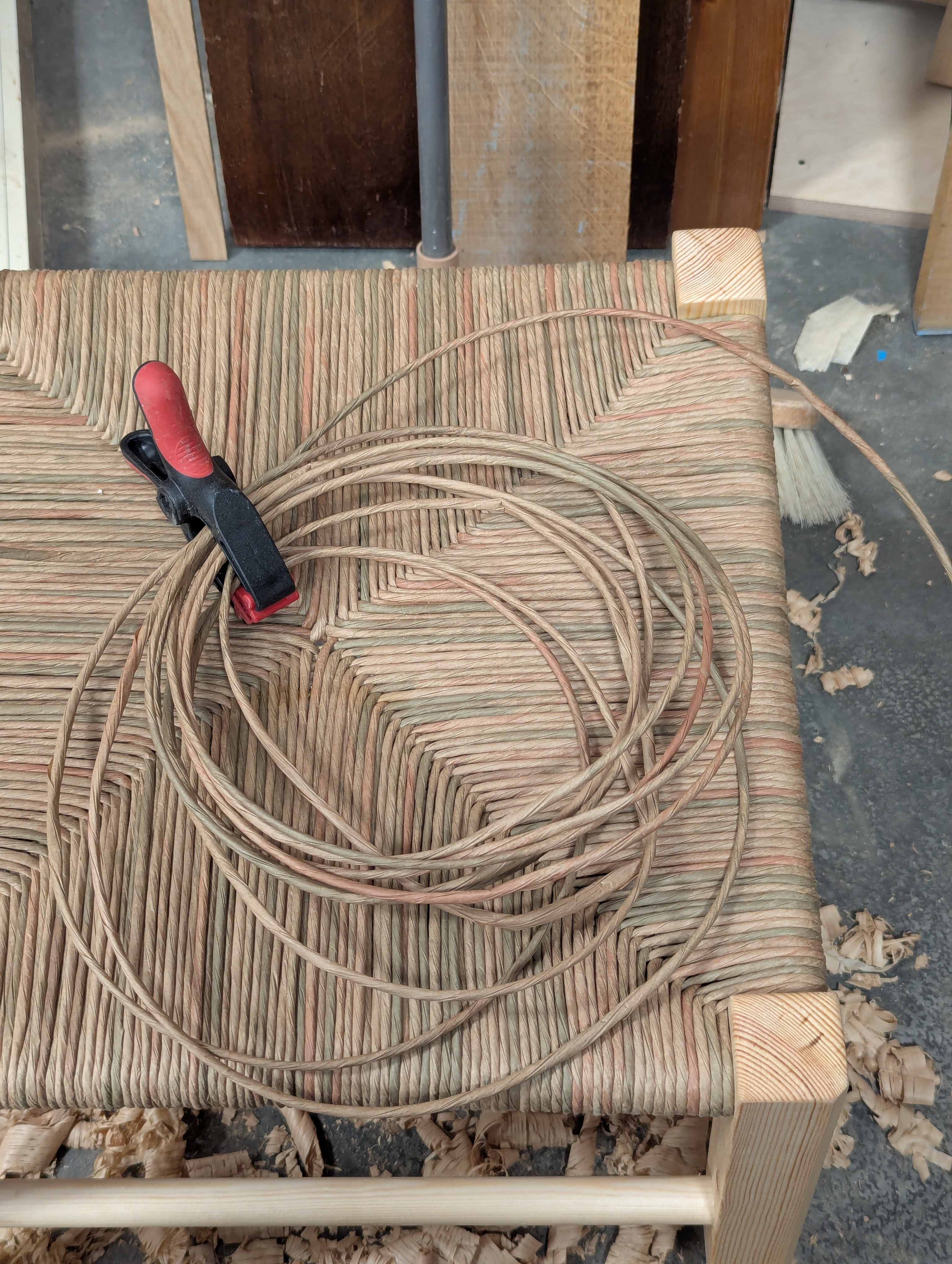 The material I chose is called Danish cord. It's made from three strands of brown paper; the first two are twisted together tightly and the third is a spiralled wrap. It's strong and durable and easier to weave than natural read. The outer is coated with a thin wax finish. You can further coat the Danish cord with shellac or hard wax oil. This darkens the appearance but adds extra protection.