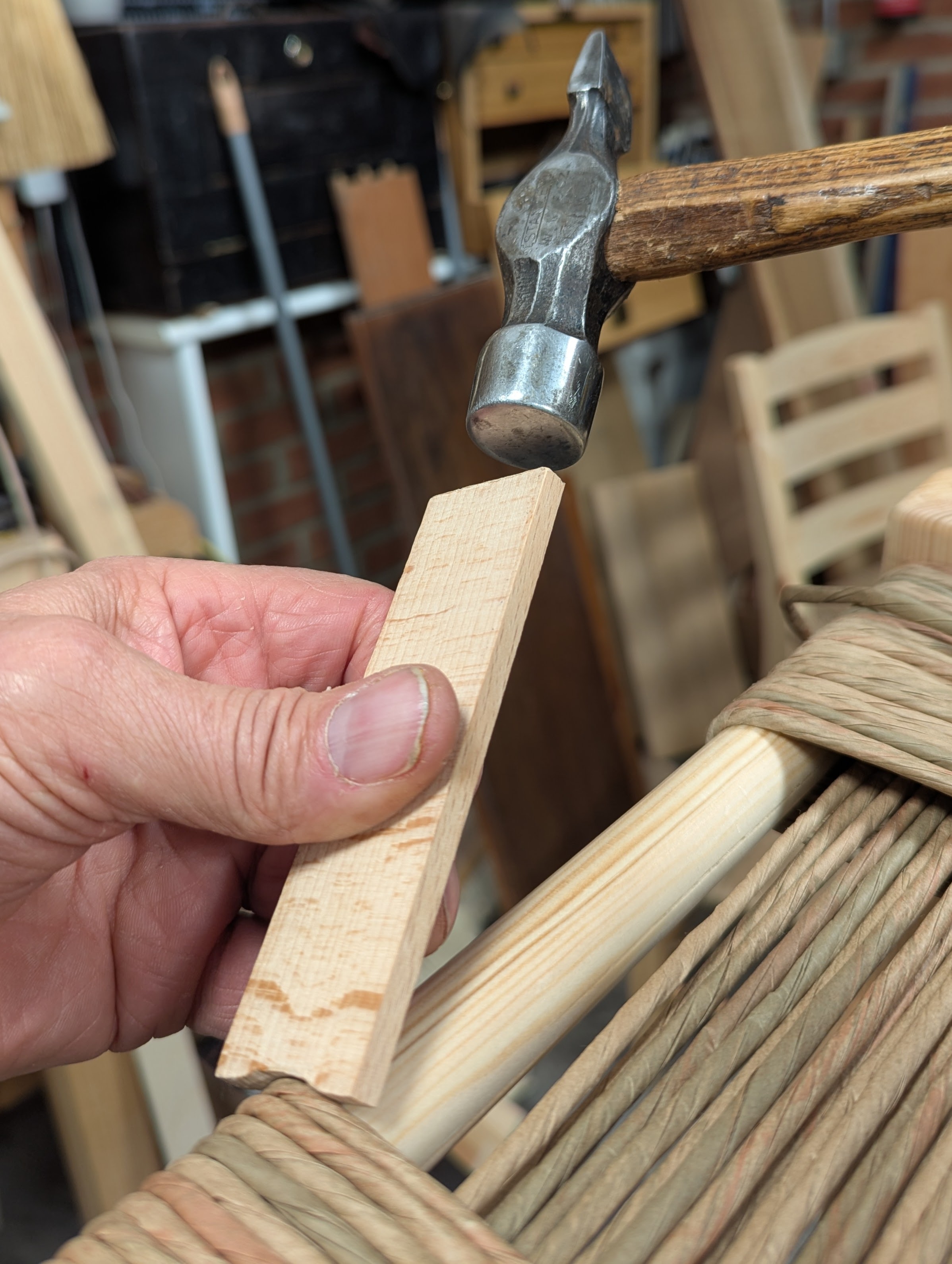 Now the weaving begins. All the way through, we follow the same pattern until the seat is woven. Intermittently, we tighten the strands as we go, with a hammer and a stick of wood.