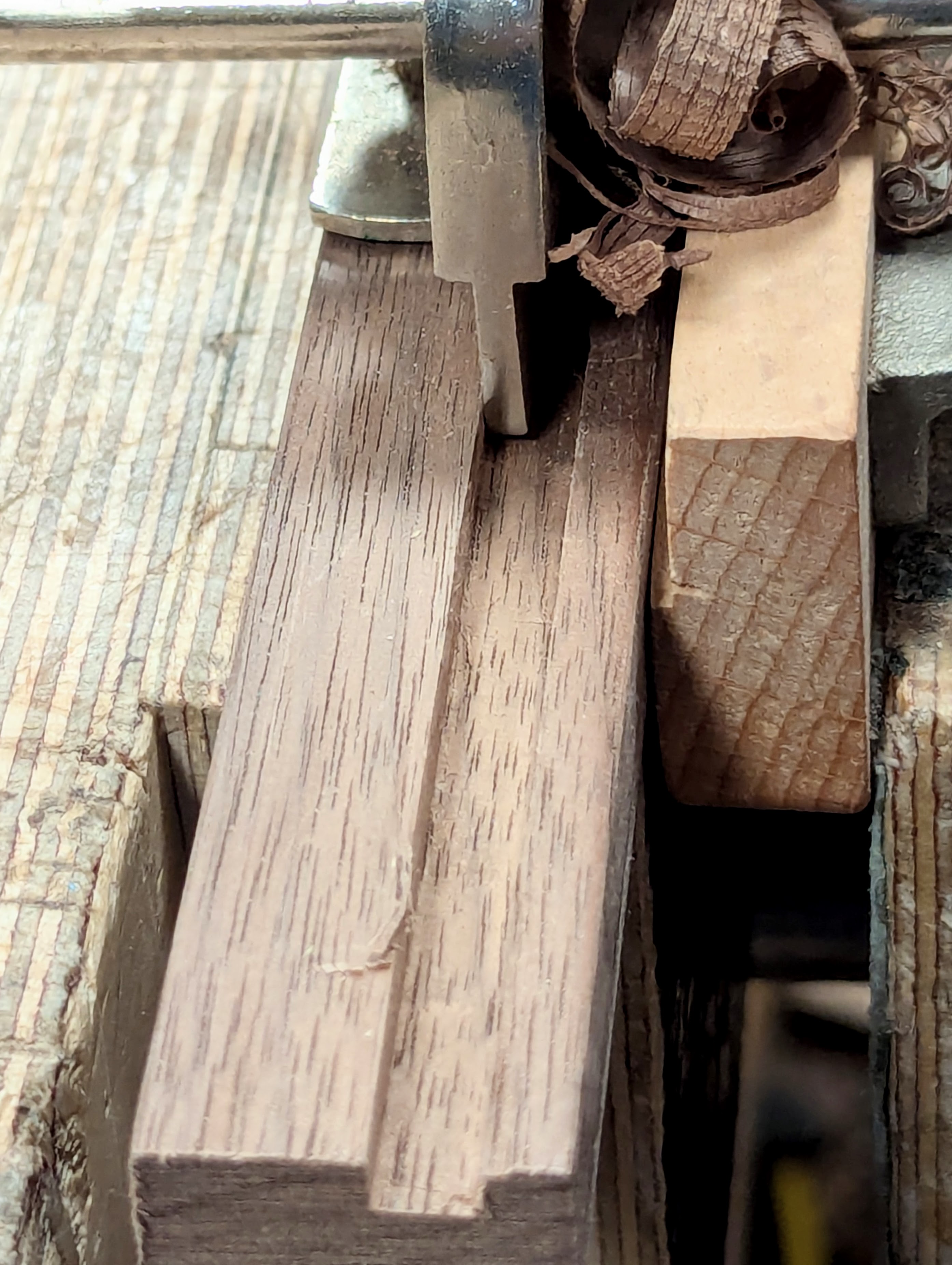 Ploughing the grooves in a wood like walnut is delightful, simply because the bands are so narrow, they peel out like butter. It's best done in longer lengths for holdability in the vise or with clamps. I overhang mine from the vise substantially so that the fence of the plane is free from catching the vise. I have different makes and sizes of plough planes, but I used the smaller of them on this particular project, the Record 043, with a matching cutter sized to suit at 6mm. Oh, BTW, I have made specific cutters from O1 flatsock tool steel to specifically match other plywood thicknesses. Sometimes, especially in the USA, 1/4" plywood from the big box stores will be nominally sized and come out less thick in size. I have made several sizes over the years, and it's worth doing for a few minutes work because you end up with sizes that suit just about any size of plywood, which is handy long term.
